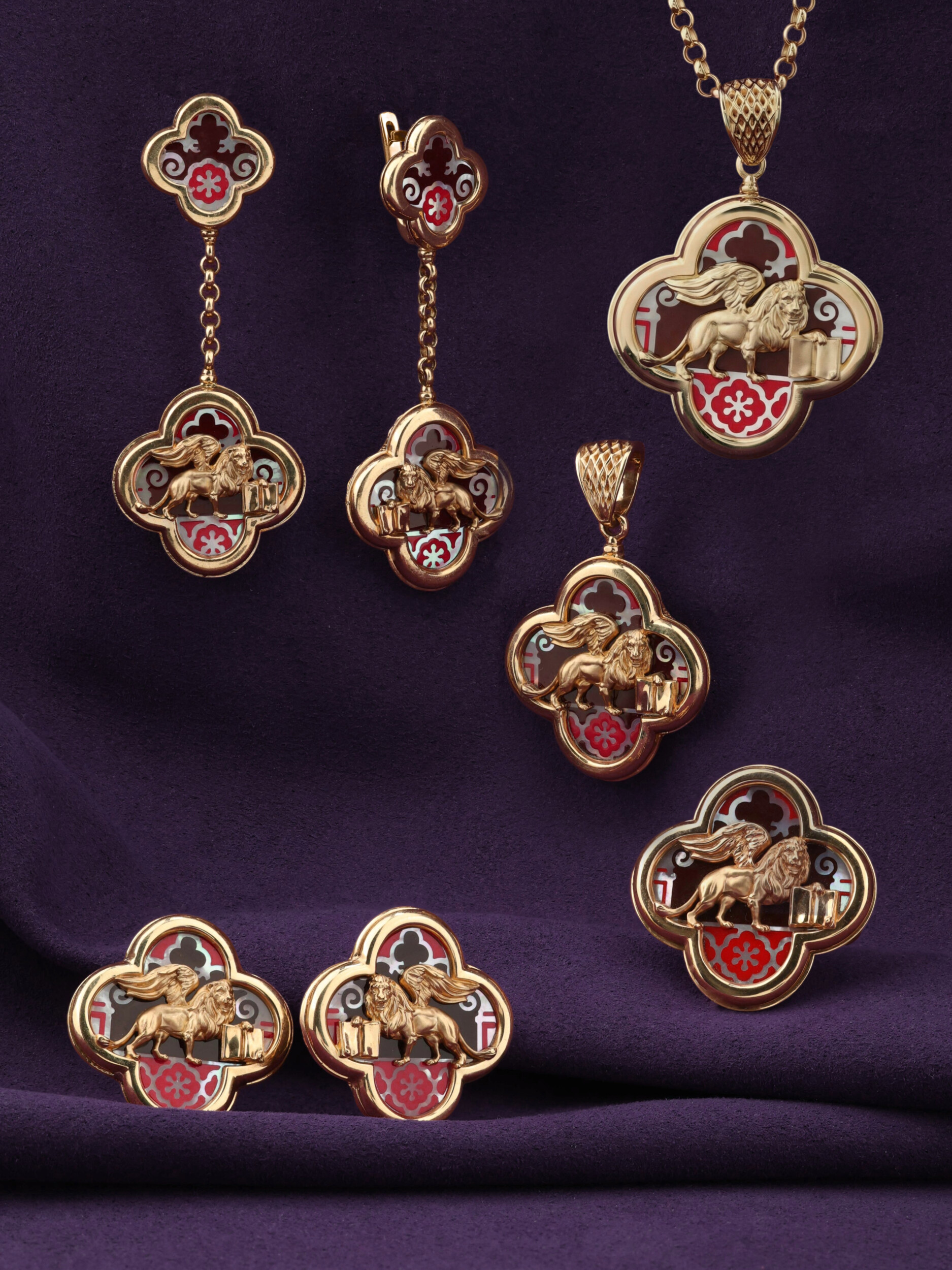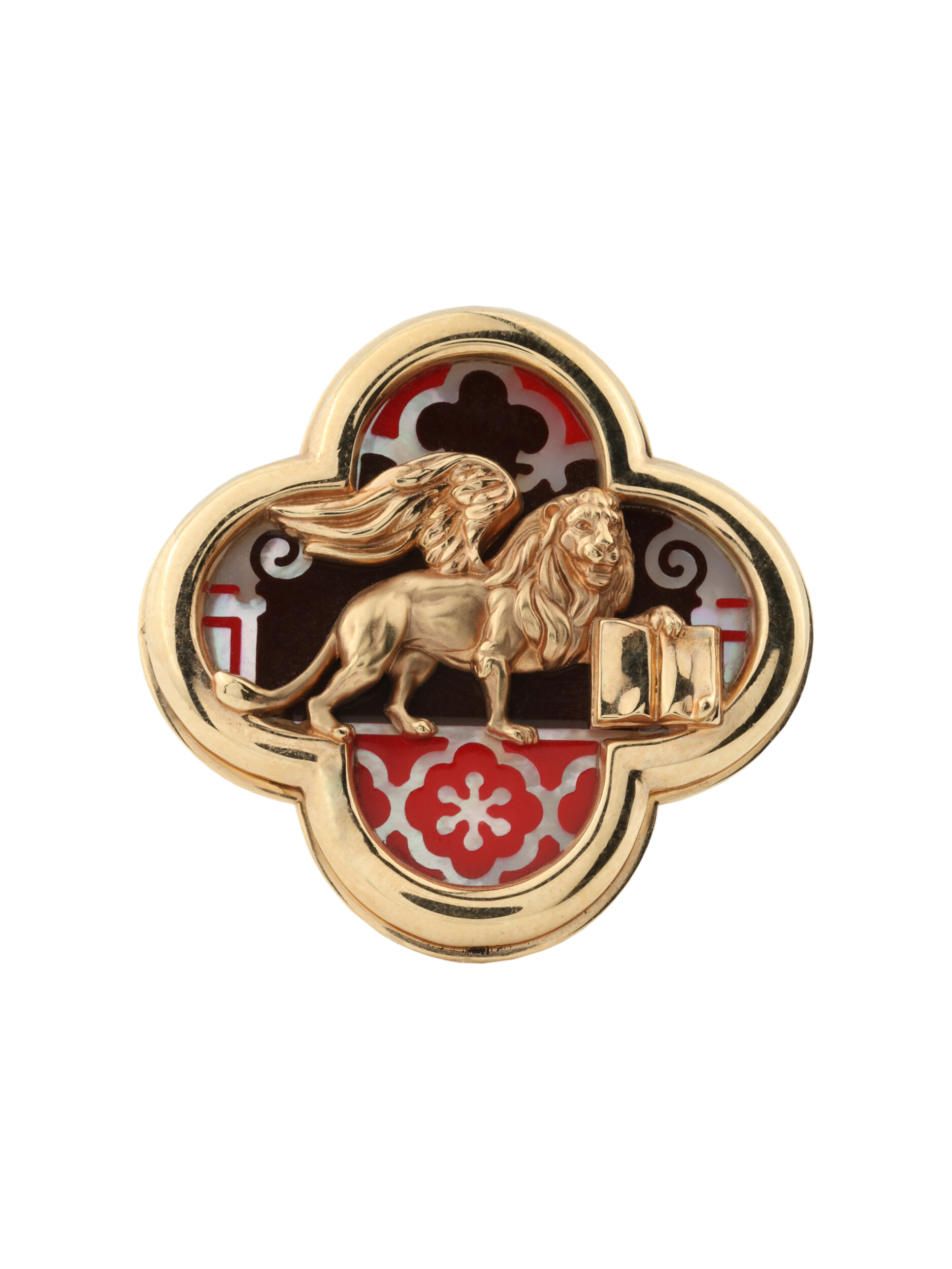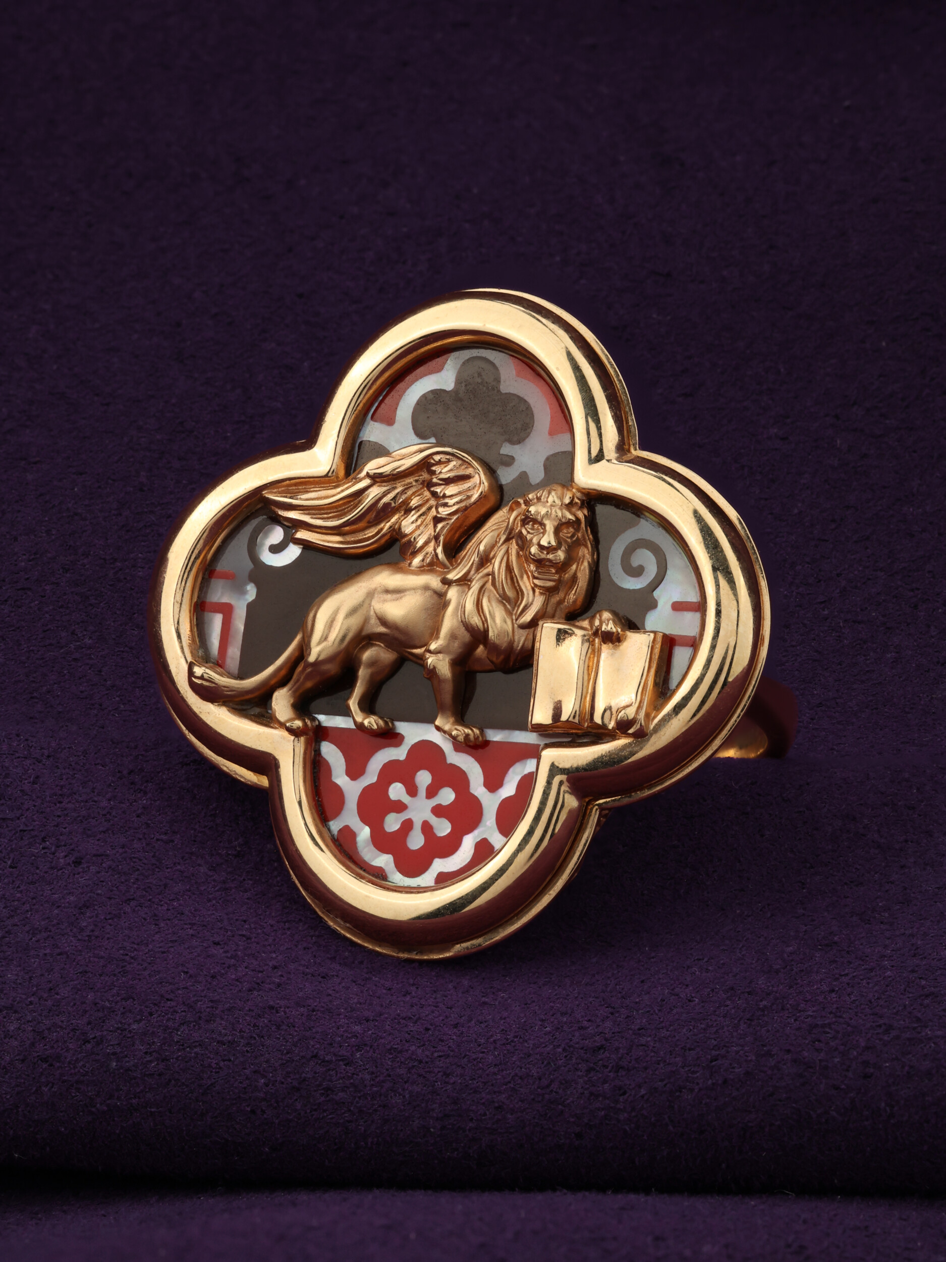 Особую художественную выразительность модели придает сочетание материалов: благородный блеск красного золота гармонично дополнен изысканными вставками из перламутра и разноцветной эмали. Эти детали создают неповторимый цветовой акцент, подчеркивая глубину и детальность дизайна с изображением льва. Такое украшение органично дополнит образ как женщины, так и мужчины, становясь яркой деталью индивидуального стиля.