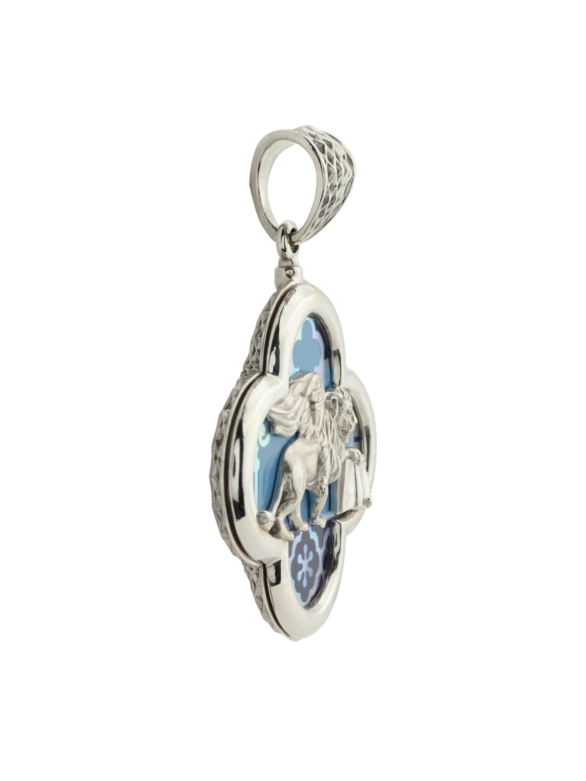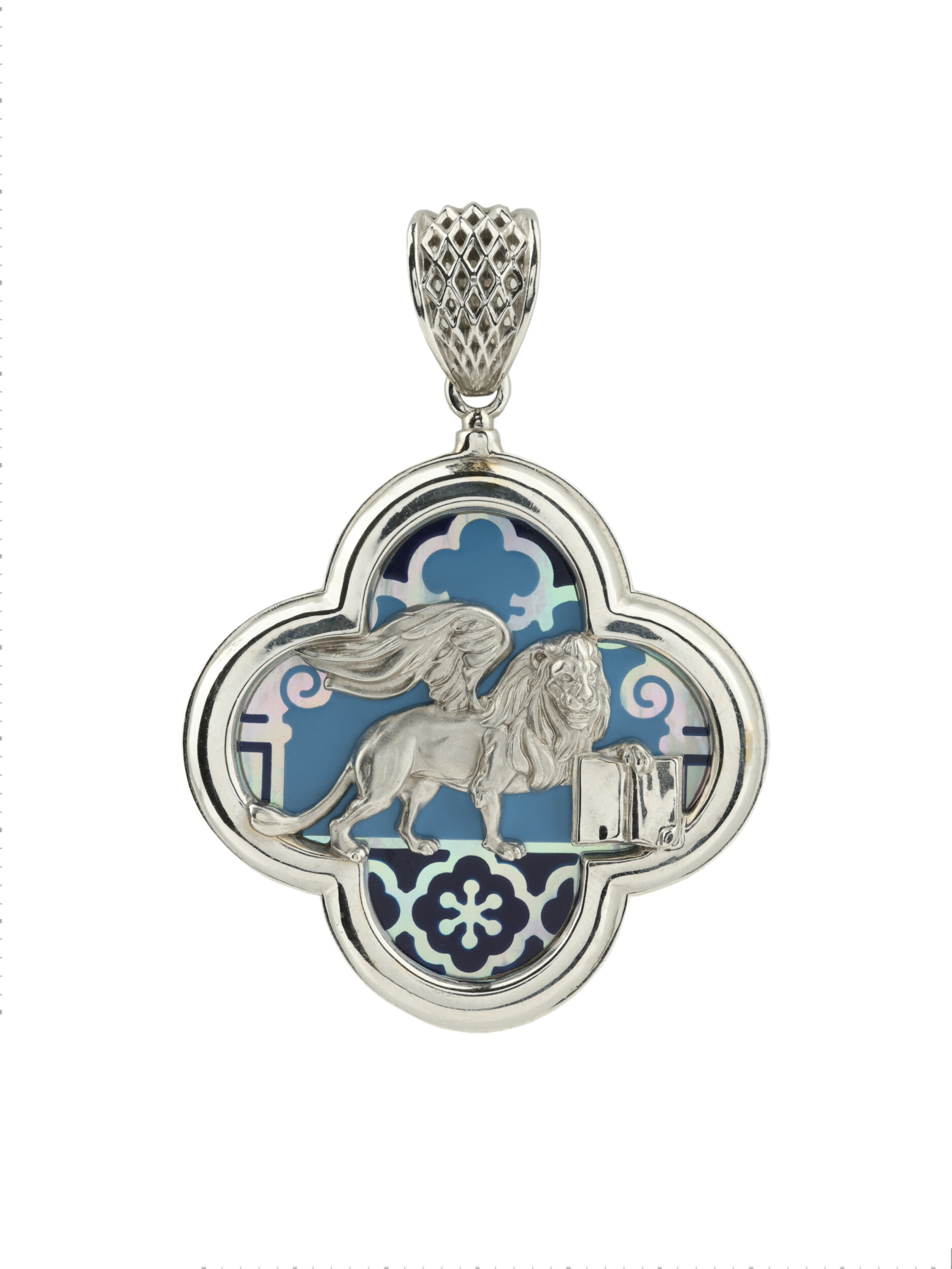 Подвеска из белого золота 585 пробы станет изысканным акцентом вашего образа. Дизайн украшения, выполненный в лучших традициях коллекции De luxe Premium — Венецианский лев, обращается к символике величественного льва — эмблемы силы и благородства. Центральным элементом композиции является искусная фигура льва, детально проработанная ювелирами, которая эффектно выделяется на фоне декоративной вставки из перламутра и разноцветной эмали. Холодный блеск белого металла гармонично дополняет утонченную игру переливов перламутра, создавая благородное сочетание, привлекающее внимание своей глубиной и художественным исполнением.