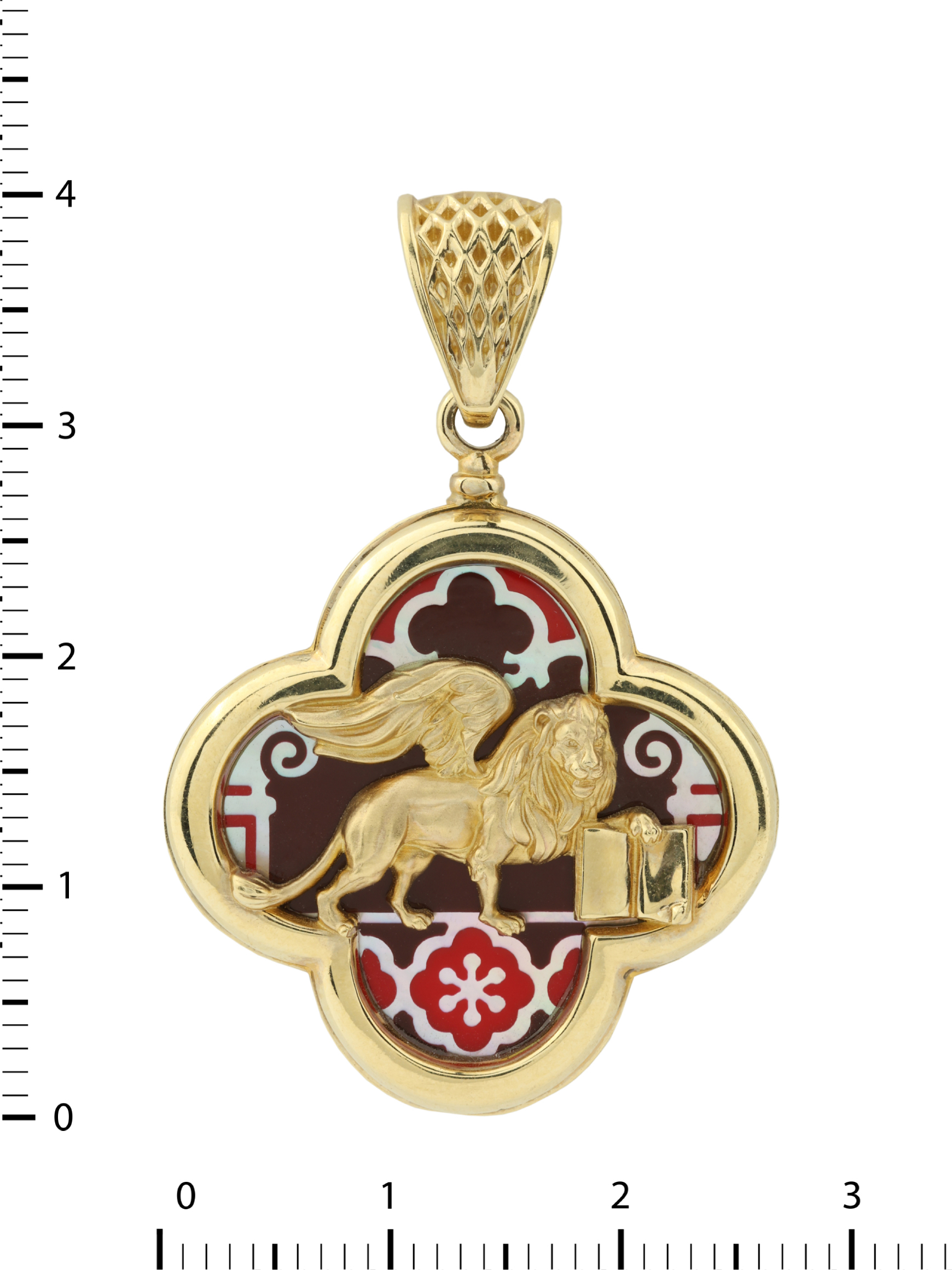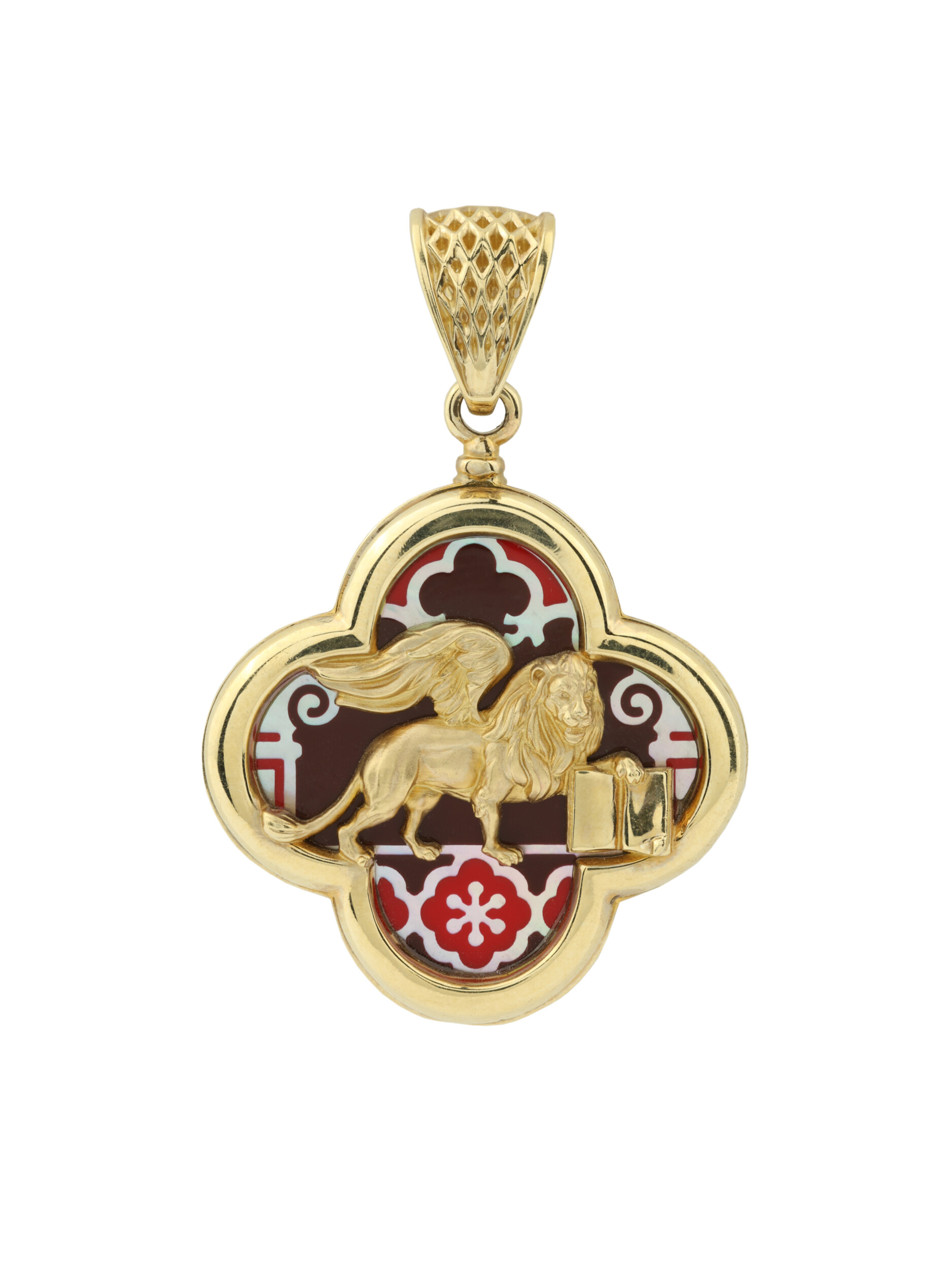 Роскошная подвеска из коллекции De luxe Premium — Венецианский лев станет воплощением вашего безупречного стиля и утонченного вкуса. Изделие выполнено из благородного лимонного золота 585 пробы, которое подчеркивает теплоту и ценность металла. Центральный элемент дизайна — величественный лев, чья фигура проработана с особой тщательностью, символизируя силу, мудрость и благородство. Этот художественный образ гармонично дополнен изысканными вставками из натурального перламутра и яркой разноцветной эмали, создающими неповторимый визуальный акцент.