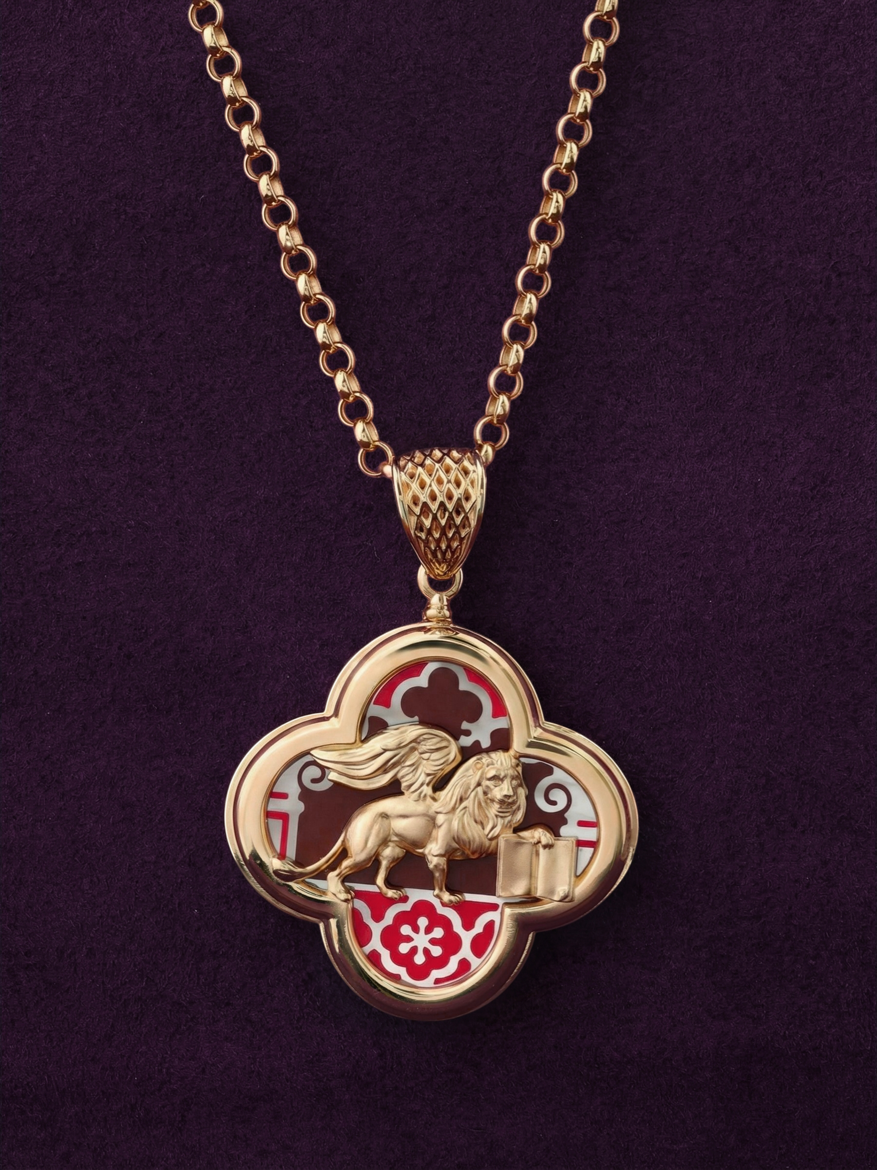 Изысканная подвеска из красного золота 585 пробы станет центральным акцентом вашего образа, подчеркивая статус и безупречный вкус. Ювелирное изделие из коллекции De luxe Premium — Венецианский лев выполнено в уникальном дизайне: ключевым элементом композиции является величественный лев, выполненный из золота. Этот символ власти и мудрости гармонично обрамлен контрастной отделкой, где сочетаются ювелирная эмаль и благородный перламутр. Разноцветный декор эмали добавляет украшению глубину и выразительность, создавая неповторимый визуальный эффект.