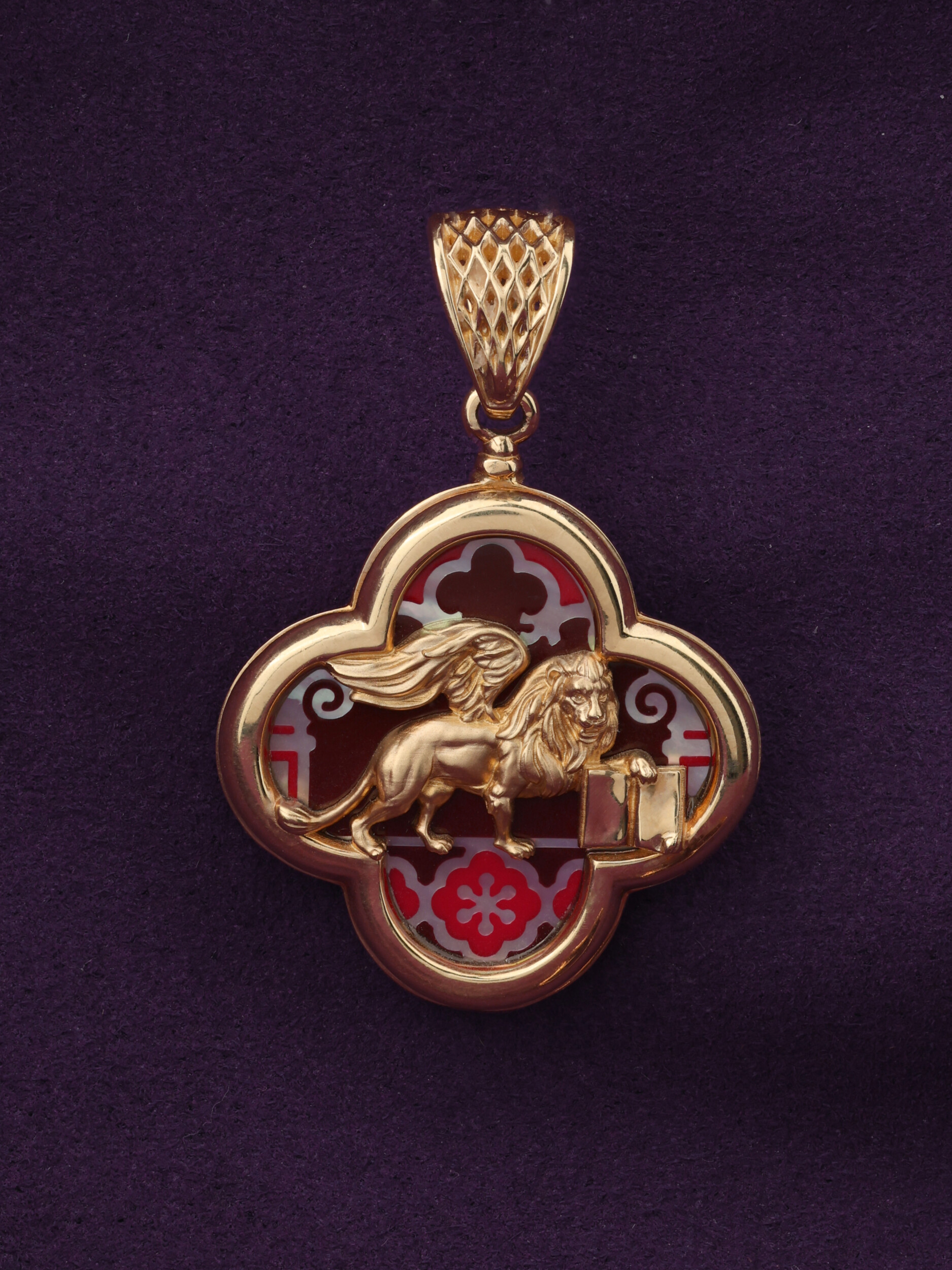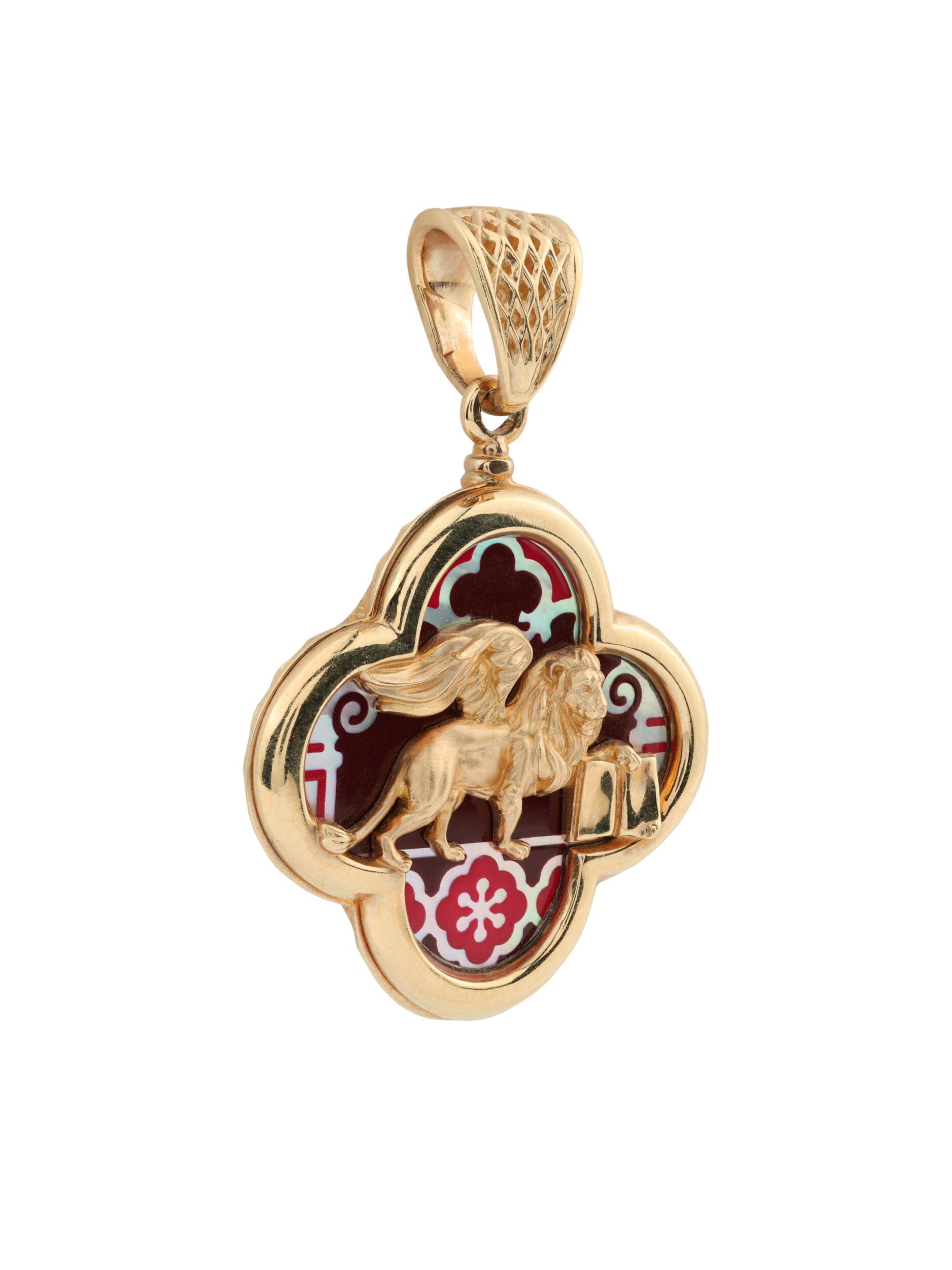 Подвеска из красного золота 585 пробы — яркий пример ювелирного искусства, вдохновленного символикой великой Венеции. Украшение входит в коллекцию De luxe Premium — Венецианский лев, центральным образом которой стали грациозные львы. Мастера воплотили в металле величественный силуэт крылатого льва, выполненного с филигранной точностью. Золотая фигура хищника эффектно контрастирует с декоративным фоном, где сочетаются ювелирная эмаль и натуральный перламутр. Разноцветная эмаль и переливающийся перламутр создают глубину и игру света, подчеркивая статус и художественную ценность изделия.