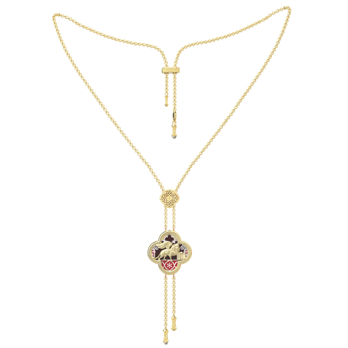 Колье из лимонного золота 585 пробы из коллекции De luxe Premium — Венецианский лев — это воплощение благородства и утонченного стиля. Центральным элементом украшения является искусная композиция с дизайном львы, которая притягивает взгляд своей детализацией и символизмом. Использование лимонного золота придает изделию особое сияние и теплоту, подчеркивая статусность владельца. Ювелирная работа дополнена вставками из эмали, жемчуга и перламутра, которые гармонично сочетаются между собой, создавая уникальный визуальный эффект.