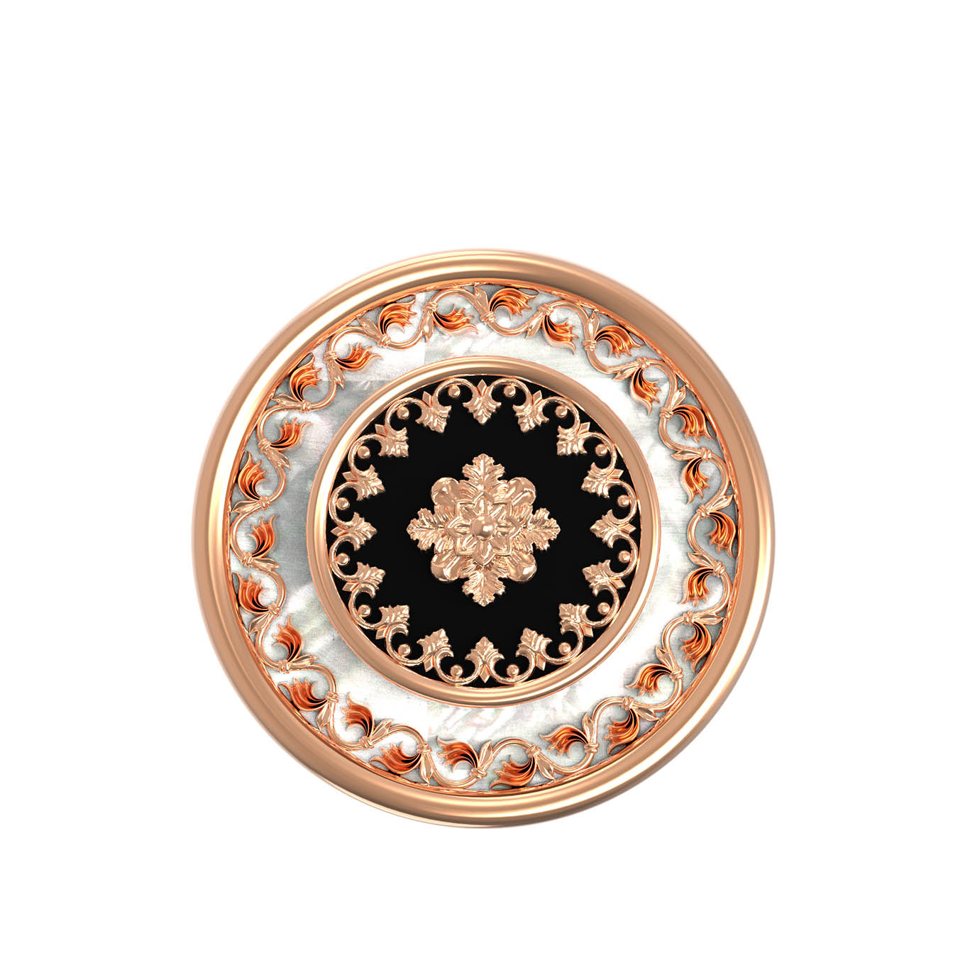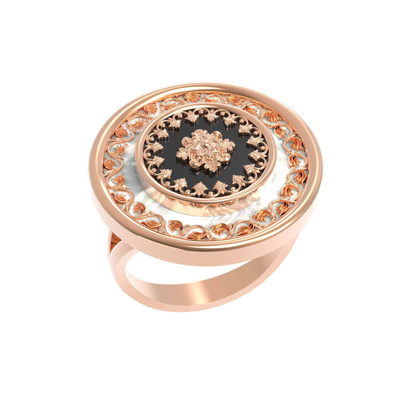 Роскошное кольцо из красного золота 585 пробы из коллекции De Luxe — Флоренция станет безупречным акцентом вашего образа. Это ювелирное изделие воплощает в себе гармонию классических форм и утонченного дизайна. Центром композиции выступает круглая вставка, сочетающая в себе глубокий черный оникс и нежный перламутр, создающие изысканный контраст цветов. Детализированная отделка металла придает украшению особую выразительность и благородство.
