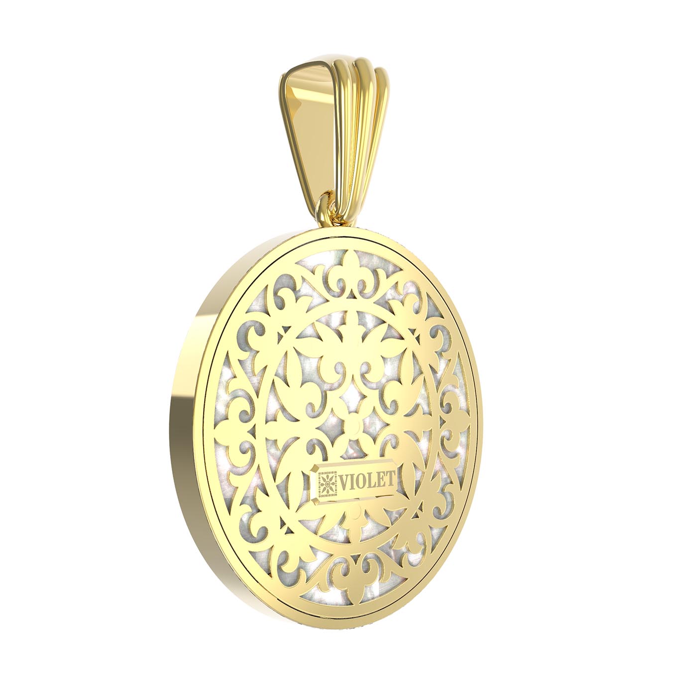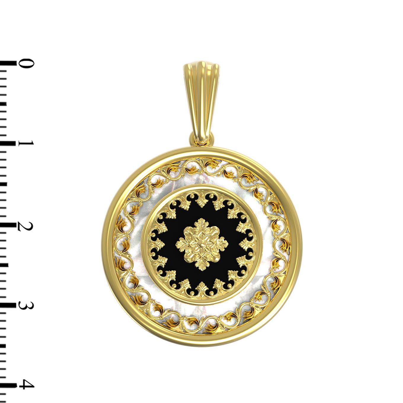 Подвеска из коллекции De Luxe — Флоренция — это изысканное ювелирное украшение, которое станет воплощением вашего безупречного стиля. Изделие выполнено из лимонного золота 585 пробы, чей благородный солнечный оттенок идеально подчеркивает контрастную композицию вставок. Дизайн кулона строится на гармоничном сочетании двух природных материалов: глубокого черного оникса и нежного перламутра. Круглая форма вставок в обрамлении витиеватого золотого декора создает эффект антикварной броши, придавая украшению исторический шарм.