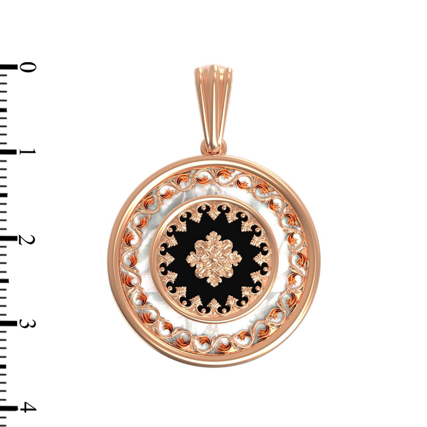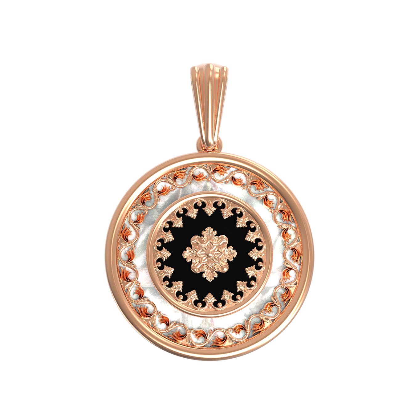 Центральным элементом композиции является вставка из оникса черного цвета, которая эффектно контрастирует с нежным перламутром. Одна круглая вставка, филигранно обрамленная золотым орнаментом, создает притягательный визуальный эффект. Красное золото теплого оттенка идеально дополняет эту игру контрастов, делая аксессуар выразительным акцентом любого образа.