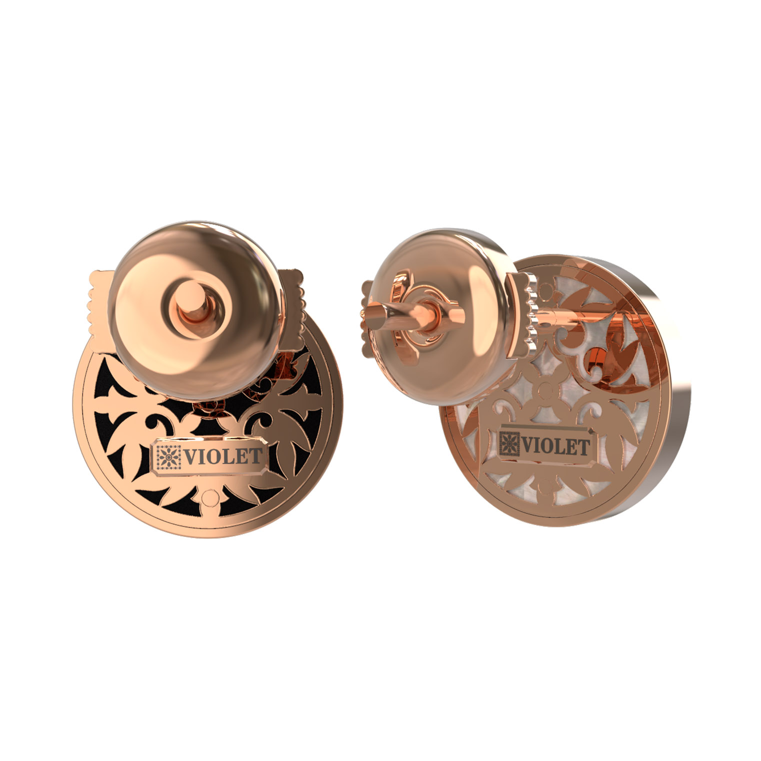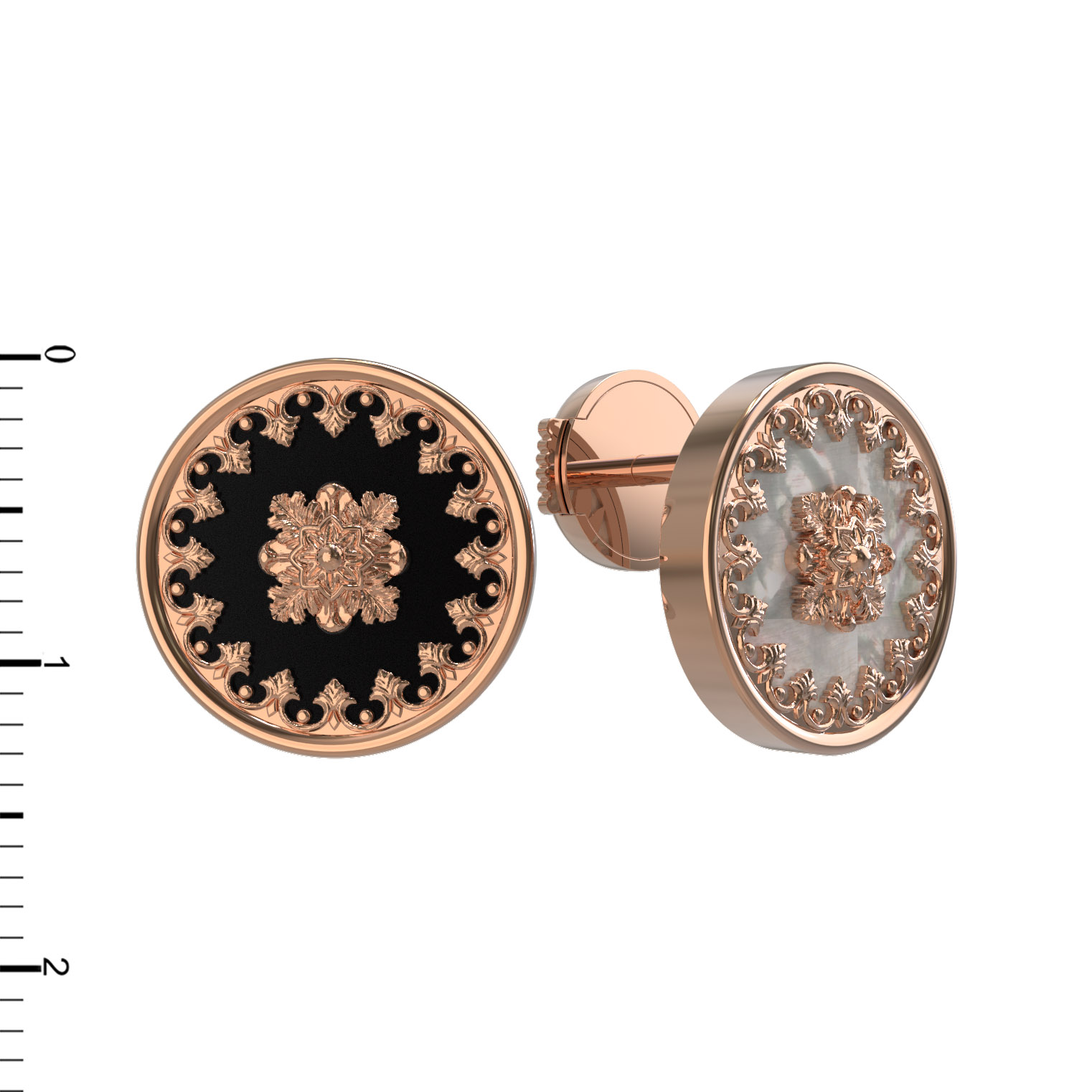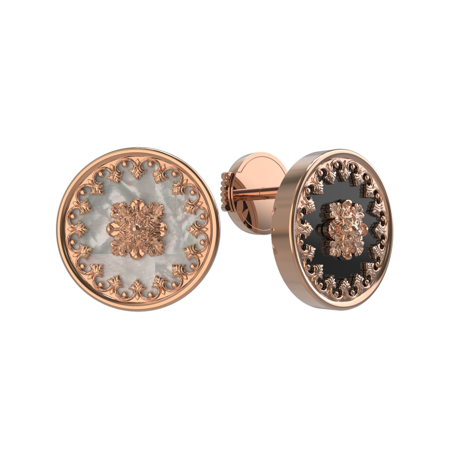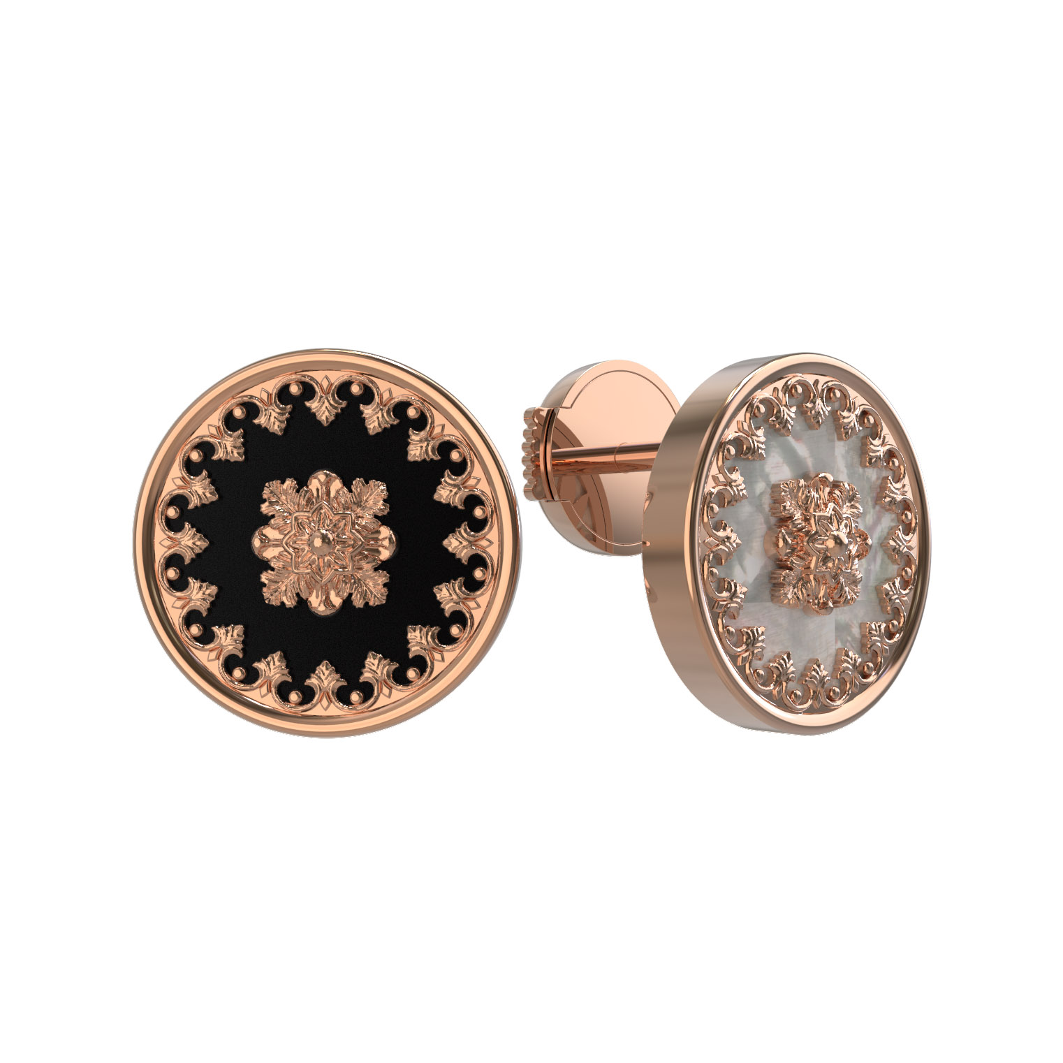 Особенность модели заключается в необычном сочетании материалов вставок. Одна серьга инкрустирована черным ониксом, а другая — нежным перламутром. Каждая вставка имеет идеальную круглую форму, обрамленную искусной золотой филигранью, что придает украшению особую статусность. Лаконичное количество вставок в 1 штуку на каждое изделие делает акцент на качестве и чистоте материалов.