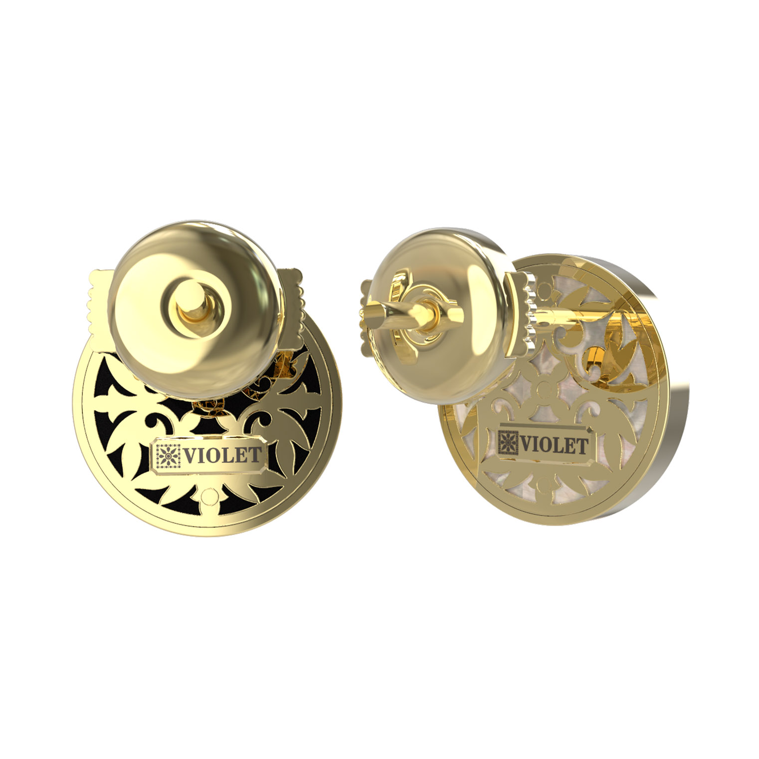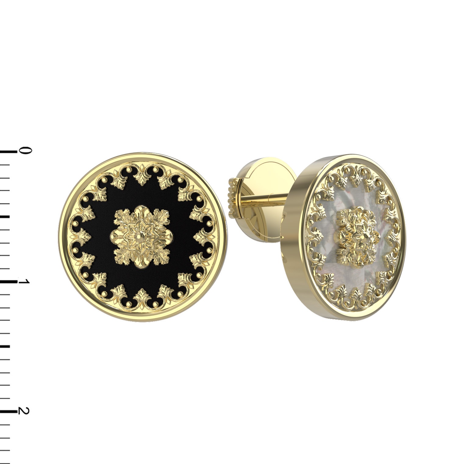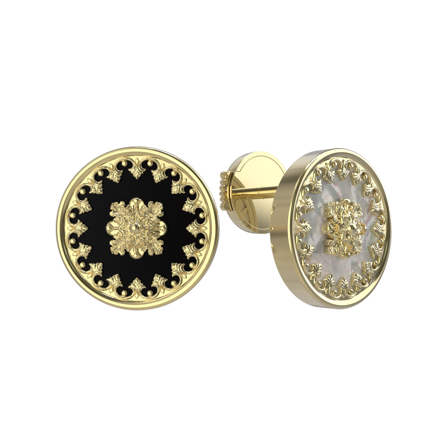 Центральным элементом композиции выступают вставки круглой формы: контрастное сочетание глубокого черного оникса и нежного переливчатого перламутра придает аксессуару особую выразительность и глубину. Дизайн изделия отличается симметрией и выраженными декоративными элементами, которые напоминают о классическом ювелирном искусстве. Общее количество вставок составляет 1 на каждое изделие, что делает акцент на качестве используемых материалов.