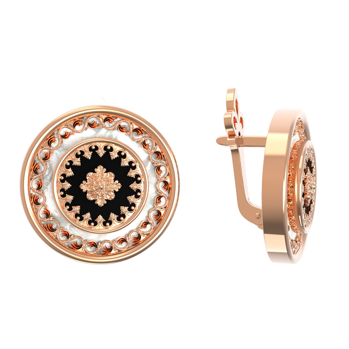 Серьги из красного золота 585 пробы из коллекции De Luxe — Флоренция представляют собой воплощение изысканной классики и современного ювелирного мастерства. В дизайне изделия гармонично сочетаются благородный блеск драгоценного металла и глубокая выразительность натуральных камней. Центр каждой серьги украшен вставкой из оникса черного цвета, которая эффектно контрастирует с мягким сиянием перламутра, обрамляющим композицию.