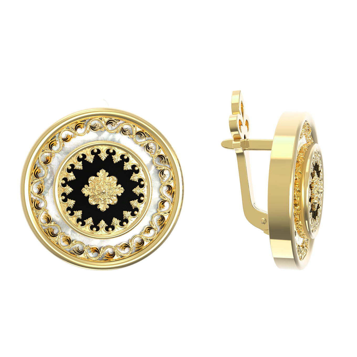 Лимонный оттенок драгоценного металла подчеркивает глубину черного цвета вставки и подчеркивает природную красоту перламутра. Дизайн изделия отличается проработкой мелких декоративных элементов, что делает его выразительным и запоминающимся. В общей сложности в серьгах использованы 2 вставки круглой формы, которые идеально дополняют друг друга. Это универсальное украшение одинаково эффектно подойдет как для женщин, так и для мужчин, предпочитающих статусные и лаконичные аксессуары.
