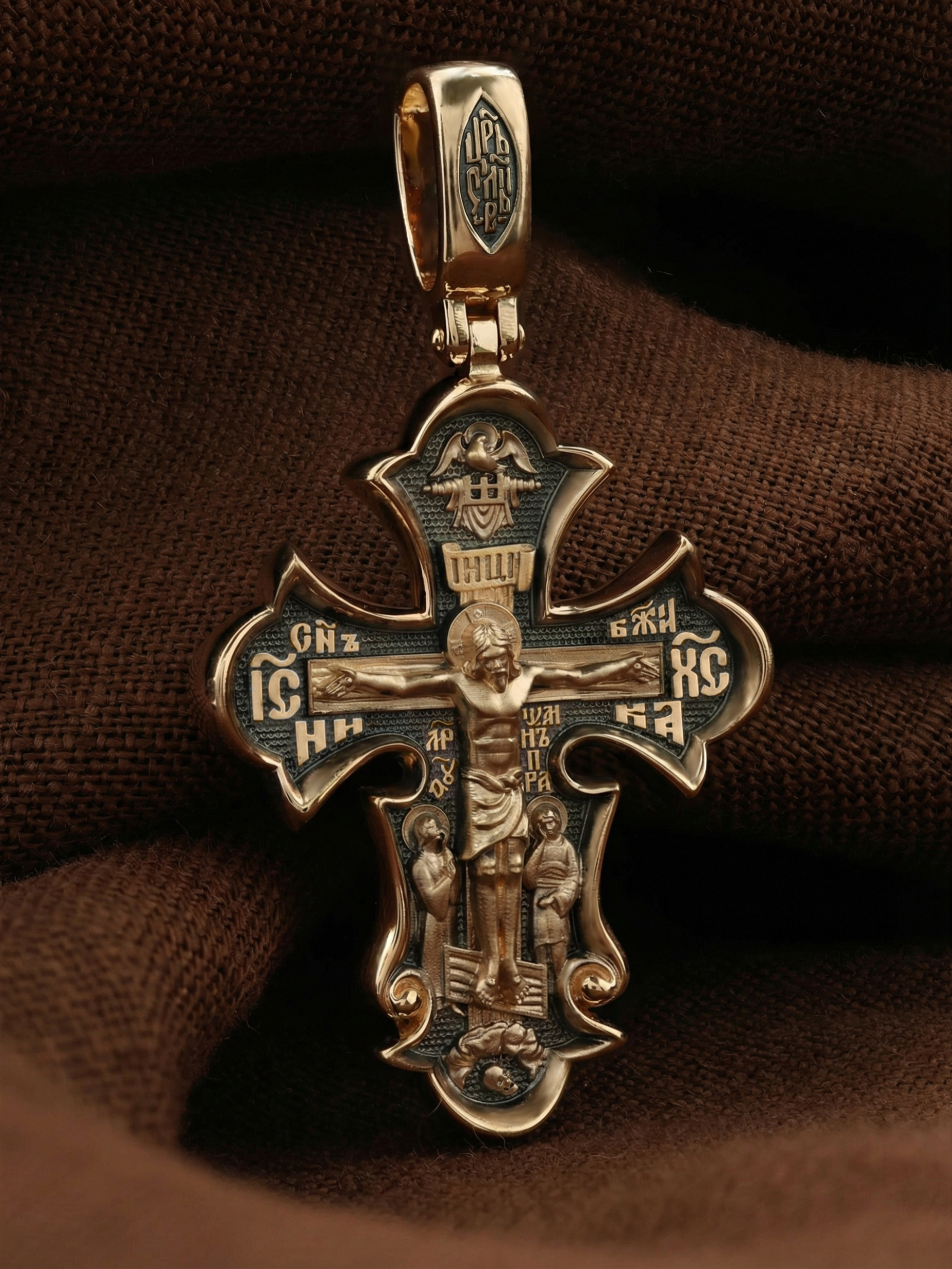 На лицевой стороне креста изображено Распятие Господа и Спасителя нашего Иисуса Христа, отдавшего Себя на смерть, для искупления грехов мира. Крест является символом жертвенной любви всеблагого Бога к падшим людям, всепобеждающим духовным оружием христиан, основанием и средоточием церковной жизни. Верхняя перекладина символизирует титло — табличку, на которой, согласно Евангелию, было начертано: Иисус Назорей Царь Иудейский (IНЦI). Также Распятие сопровождается надписями, олицетворяющими Христа. Надпись «IС» « ХС», что означает Иисус Христос, слово «НИКА», что означает «победитель» и слова «Сын Божий» помещается на разных сторонах поперечной перекладины креста. Над вершиной Распятия помещено изображение Святого Духа в виде голубя. Слева от Распятия изображена Пресвятая Богородица, справа — апостол и евангелист Иоанн Богослов, один из ближайших учеников Иисуса Христа. Возвышение, на котором стоит Крест, символизирует гору Голгофу, на которой произошло Распятие. Под подножием Креста изображена покоящаяся голова (череп) Адама. На кулонном кольце помещена надпись «Царь Славы».