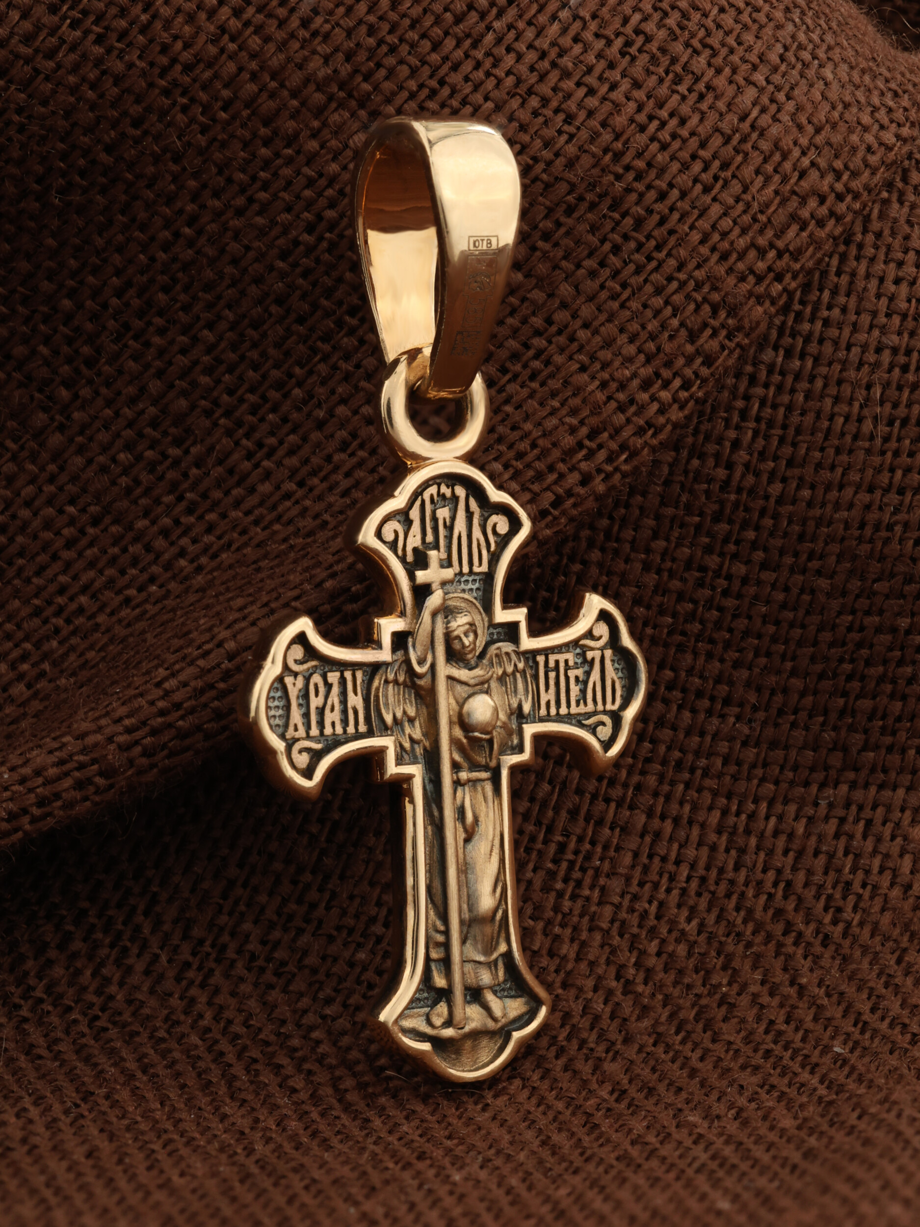 На оборотной стороне креста изображен святой Ангел-Хранитель в виде прекрасного юноши держащего в правой руке крест, а в левой — сферу. Ангел-Хранитель — это Ангел приставляемый Богом к человеку при крещении для охраны и помощи в добрых делах. Невидимо пребывая при нас постоянно, он, руководствуя нас ко спасению, не только по нашему желанию таинственно наставляет нас на все доброе и полезное, не только возносит наши молитвы к Богу, но еще и сам от себя охраняют и защищают нас от врагов видимых и невидимых, ходатайствует за нас пред Богом.
