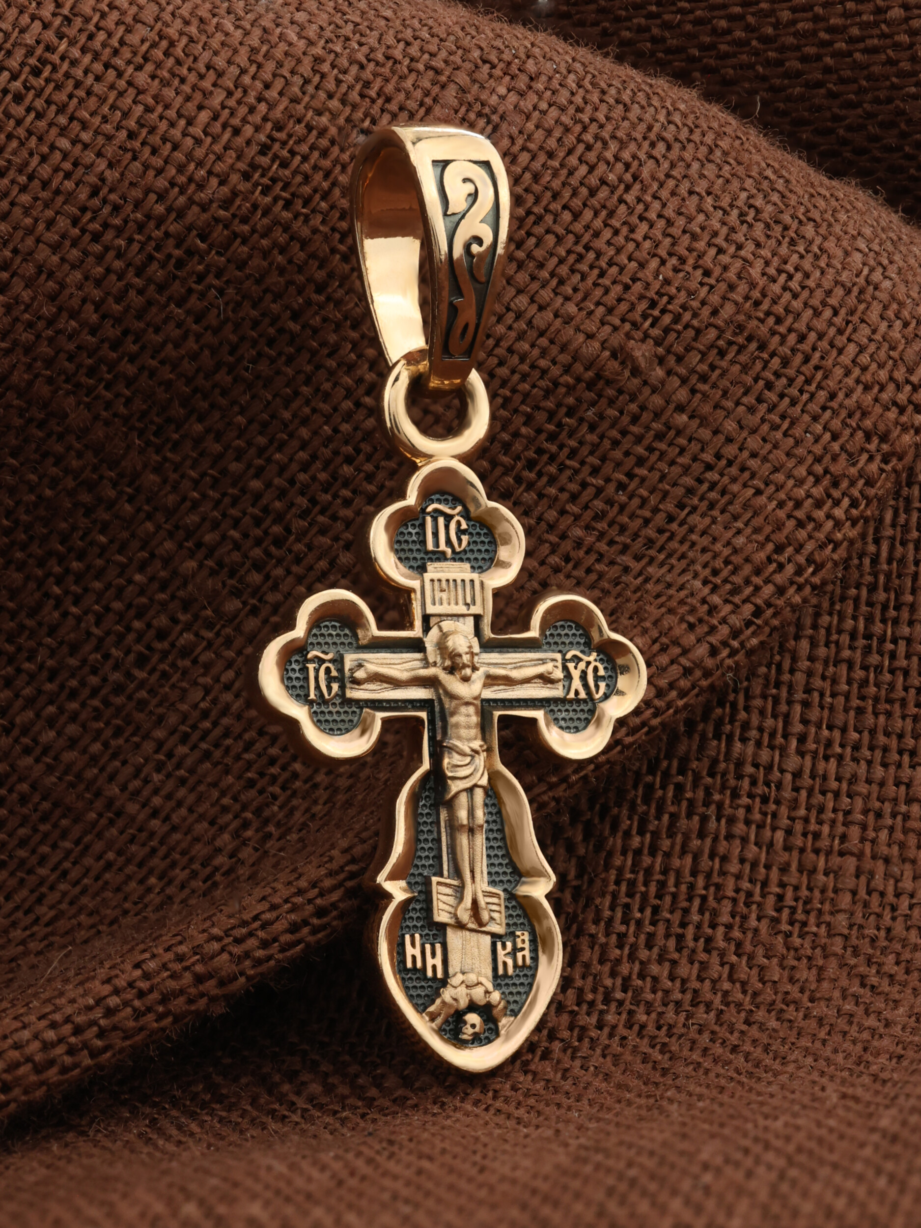 На лицевой стороне креста изображено Распятие Господа и Спасителя нашего Иисуса Христа, отдавшего Себя на смерть для искупления грехов мира. Крест является символом жертвенной любви Всеблагого Бога к падшим людям, всепобеждающим духовным оружием христиан, основанием и средоточием церковной жизни. Над вершиной Распятия помещена надпись «Царь Славы». На верхней перекладине расположена надпись «IНЦI». Она символизирует титло — табличку, на которой, согласно Евангелию, было начертано: Иисус Назорей, Царь Иудейский. Надпись «IC» «ХC»», означает Иисус Христос, помещаются на разных сторонах поперечной перекладины креста. Ниже помещена надпись «НИКА», что означает «победитель». Крест стоит на горе камней, символизирующих Голгофу. Под подножием Креста изображена покоящаяся голова (череп) Адама.
