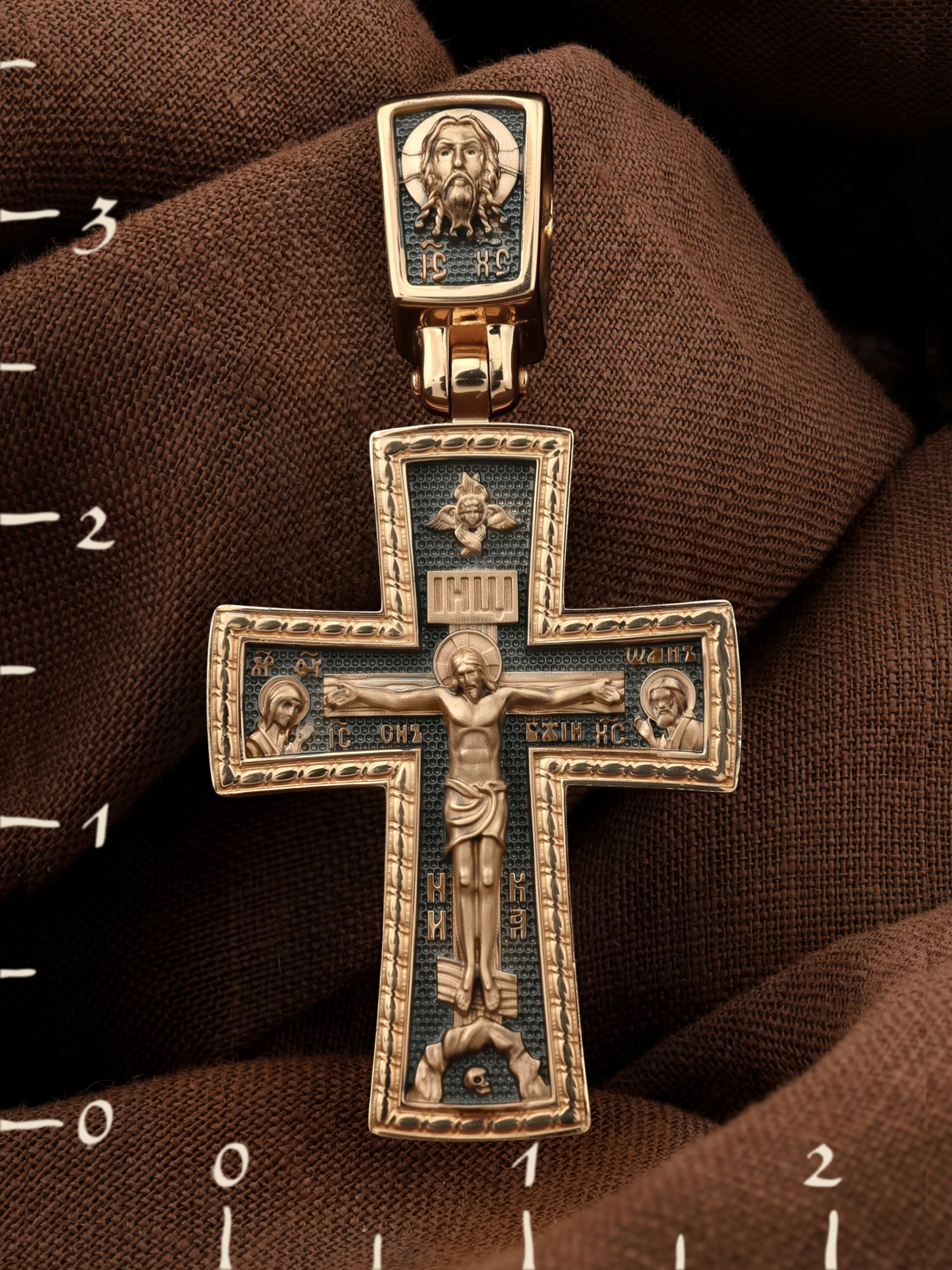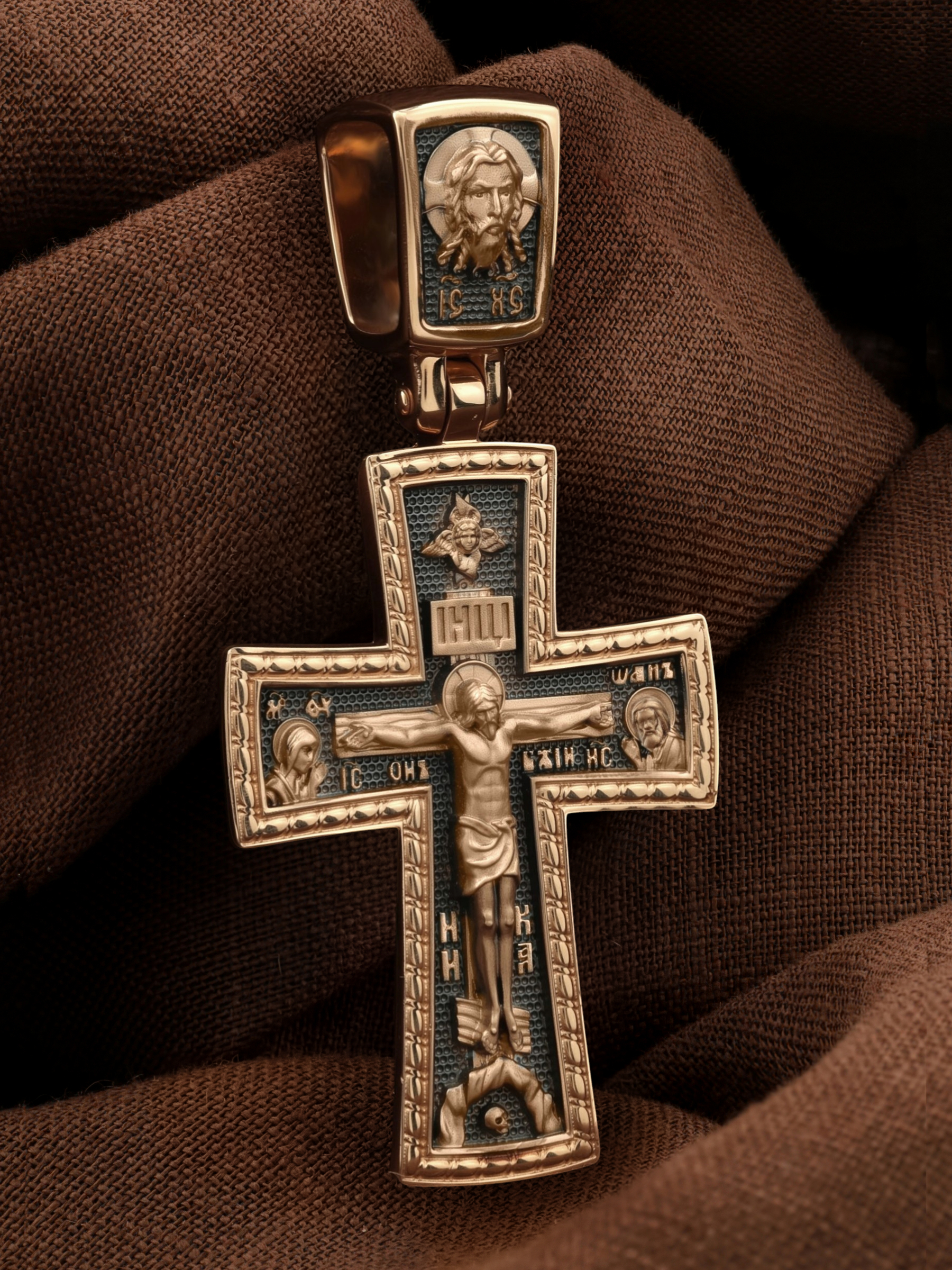 На лицевой стороне креста изображено Распятие Господа и Спасителя нашего Иисуса Христа, отдавшего Себя на смерть, для искупления грехов мира. Крест является символом жертвенной любви Всеблагого Бога к падшим людям, всепобеждающим духовным оружием христиан, основанием и средоточием церковной жизни. Господь сказал: «кто хочет идти за Мною, отвергнись себя, и возьми крест свой, и следуй за Мною». (Мк. 8: 34). На кулонном кольце изображен Нерукотворный образ Господа и Спасителя нашего Иисуса Христа, чудесно отпечатавшийся на плате, котором Христос вытер свой лик. Распятие сопровождается каноническими надписями. На верхней табличке, выше головы Иисуса, расположена надпись, составленная Понтием Пилатом — «IНЦI». Она означает «Иисус Назорей, Царь Иудейский». Надпись «IC» «ХC», означает Иисус Христос, помещается на разных сторонах поперечной перекладины креста. Рядом расположена надпись «Сын Божий», что означает божественную природу Иисуса Христа. Ниже — слово «НИКА», что означает «победитель». Слева от Распятия изображена Пресвятая Богородица, справа — Про¬рок Предтеча и Креститель Господень Иоанн. Крест стоит на горе камней, символизирующих Голгофу. В ее основании различается череп– это голова Адама.