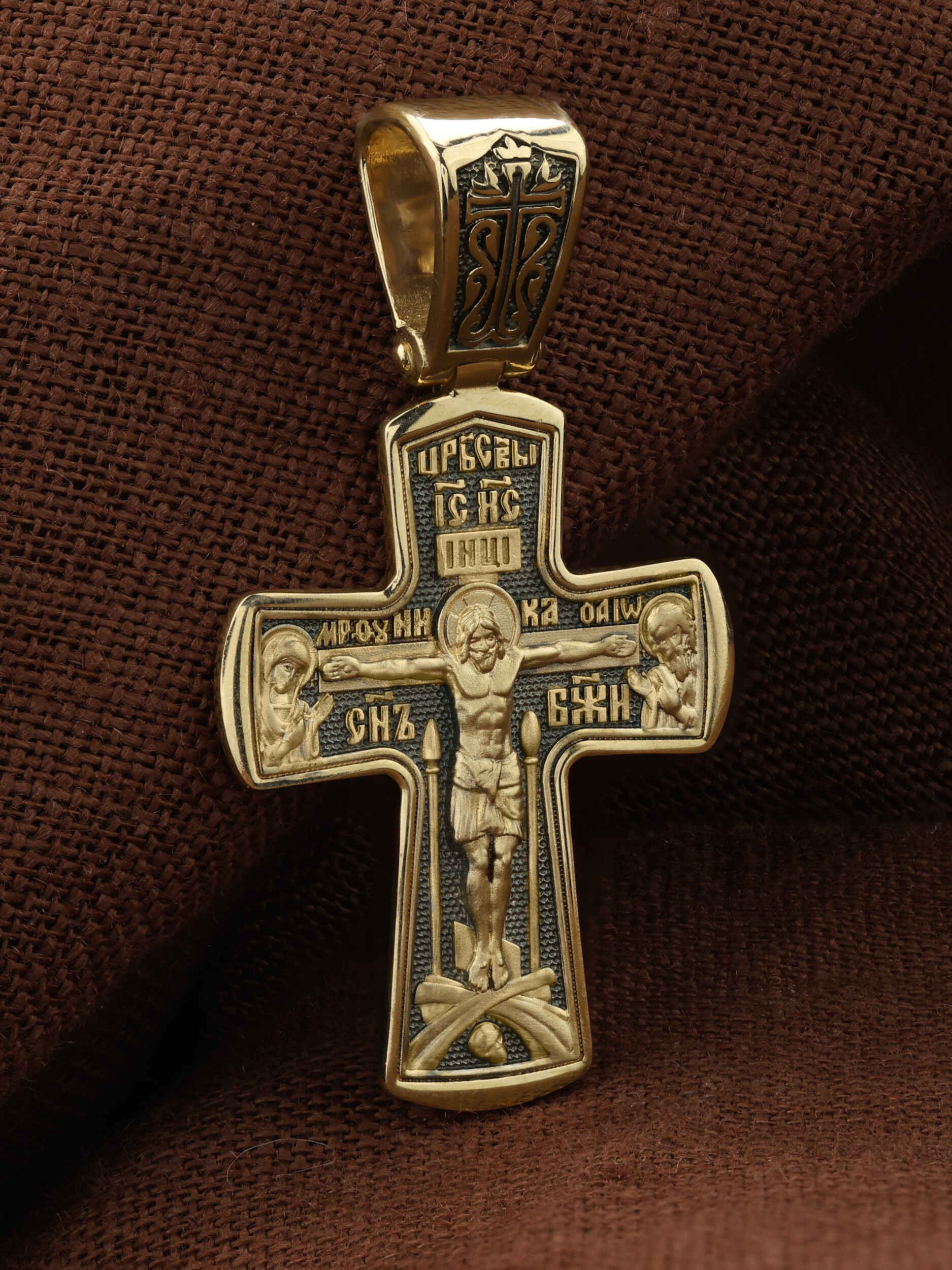 На лицевой стороне креста изображено Распятие Господа и Спасителя нашего Иисуса Христа, отдавшего Себя на смерть, для искупления грехов мира. Крест является символом жертвенной любви Всеблагого Бога к падшим людям, всепобеждающим духовным оружием христиан, основанием и средоточием церковной жизни. Господь сказал: «кто хочет идти за Мною, отвергнись себя, и возьми крест свой, и следуй за Мною». (Мк. 8: 34). На кулонном кольце изображен процветший крест. На верхней табличке, выше головы Иисуса, расположена надпись, составленная Понтием Пилатом — «IНЦI». Она означает «Иисус Назорей, Царь Иудейский». Распятие сопровождается каноническими надписями. Выше Распятия помещена надпись «Царь Славы» и надпись «IC» «ХC», означает Иисус Христос. Слово «НИКА», что означает «победитель» и надпись «Сын Божий», что означает божественную природу Иисуса Христа, помещаются на разных сторонах поперечной перекладины креста. Слева от Распятия изображена Пресвятая Богородица, справа — Про¬рок Предтеча и Креститель Господень Иоанн. Вдоль креста помещены Орудия Страстей Господних — копие сотника Лонгина и трость с губкой. Крест стоит на горе камней, символизирующих Голгофу. В ее основании различается череп– это голова Адама. На православном кресте Христос не умирает, а свободно простирает руки, ладони Иисуса открыты, будто он хочет обнять все человечество, даря им свою любовь и открывая путь к вечной жизни.