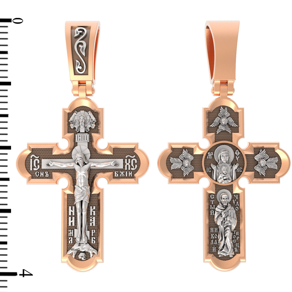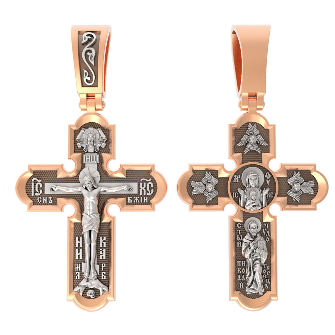 На лицевой стороне нательного креста по традиции изображено Распятие Господа нашего Иисуса Христа. Крест Господень стоит на небольшом каменистом возвышении, символизирующем гору Голгофу, которая обозначена буквами МЛРБ (Место Лобное Рай Бысть). Над головой Господа на поперечной перекладине написано «ИНЦИ», что символизирует табличку, которая была прибита к Кресту, с надписью «Иисус Назорей Царь Иудейский». Этим иудеи хотели посмеяться над Христом, не зная, что распинают истинного Царя всех царей. По сторонам основной перекладины расположены позолоченные рельефные инициалы Христа «ИС ХС». Под перекладиной, по сторонам древа, находится надпись «СЫН БОЖИЙ», а в основании креста — надпись «НИКА» (Победитель).