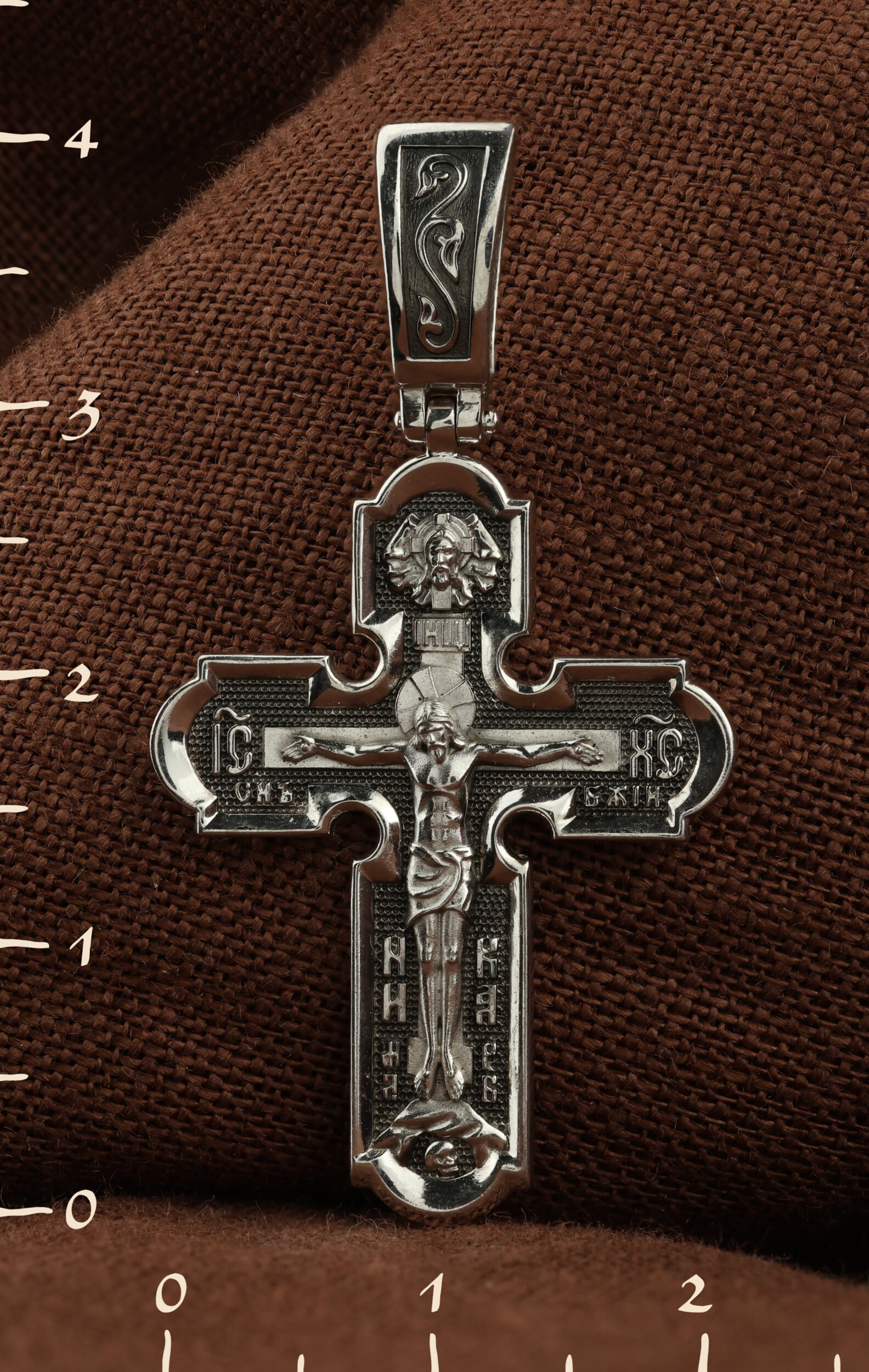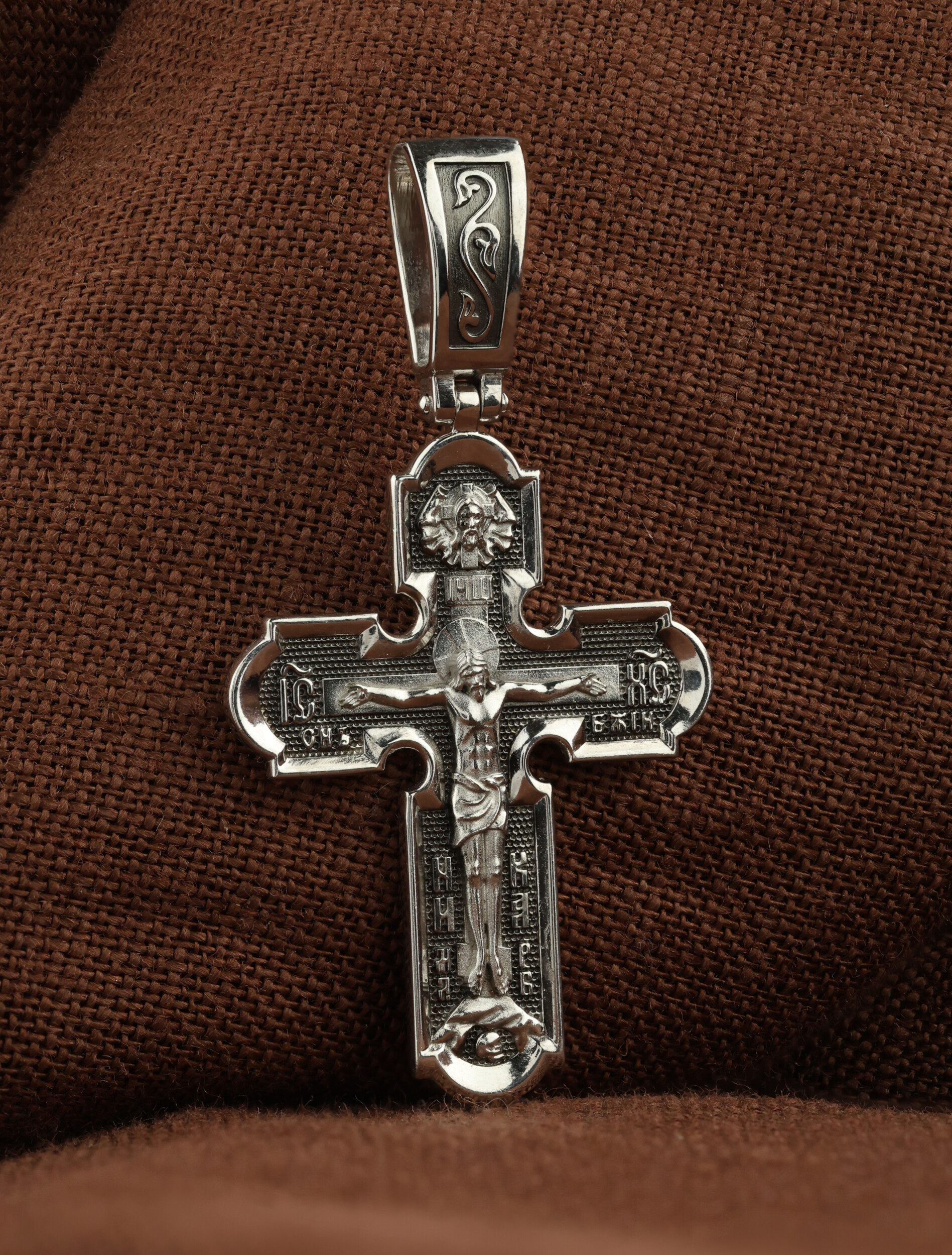 На лицевой стороне нательного креста по традиции изображено Распятие Господа нашего Иисуса Христа. Крест Господень стоит на небольшом каменистом возвышении, символизирующем гору Голгофу, которая обозначена буквами МЛРБ (Место Лобное Рай Бысть). Над головой Господа на поперечной перекладине написано «ИНЦИ», что символизирует табличку, которая была прибита к Кресту, с надписью «Иисус Назорей Царь Иудейский». Этим иудеи хотели посмеяться над Христом, не зная, что распинают истинного Царя всех царей. По сторонам основной перекладины расположены позолоченные рельефные инициалы Христа «ИС ХС». Под перекладиной, по сторонам древа, находится надпись «СЫН БОЖИЙ», а в основании креста — надпись «НИКА» (Победитель).