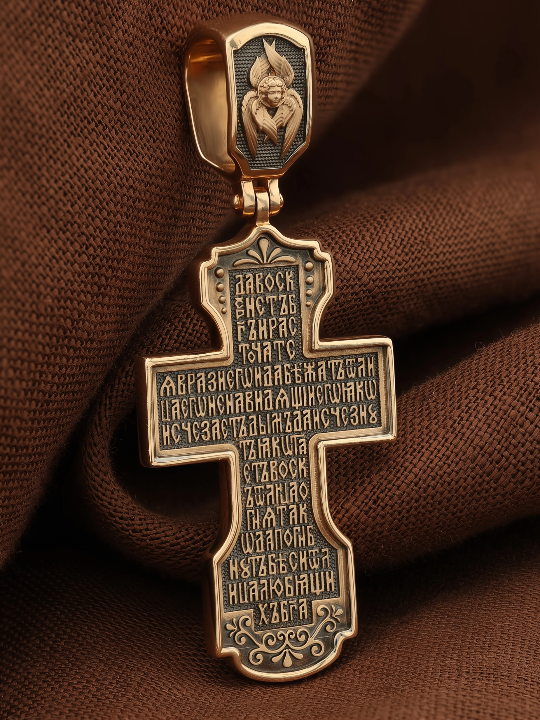 На оборотной стороне креста помещена молитва Честному Кресту Господню: «Да воскреснет Бог, и расточатся врази Его, и да бежат от лица Его ненавидящии Его. Яко исчезает дым, да исчезнут; яко тает воск от лица огня, тако да погибнут беси от лица любящих Бога…». На кулонном кольце изображен шестикрылый Серафим.