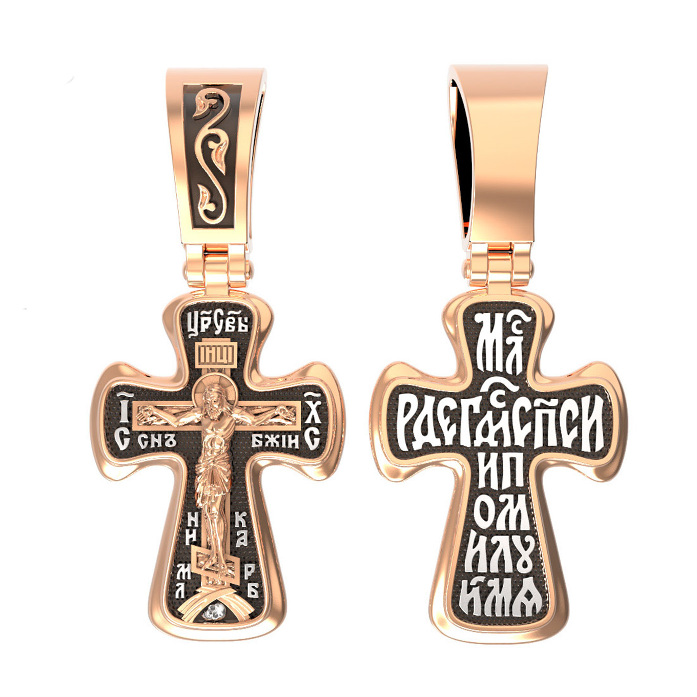 На лицевой стороне креста изображено Распятие, потому что это орудие казни Иисус Христос сделал орудием победы над грехом и смертью. Своими страданиями Он искупил грехи человечества, умерев и сошествовав во ад, победил сатану, освободил души праведников от вечной смерти и открыл им небесные врата рая. Жертва Христа сделала возможным спасение для каждого человека. На православном кресте Христос не умирает, а свободно простирает руки, ладони Иисуса открыты, будто он хочет обнять все человечество, даря им свою любовь и открывая путь к вечной жизни. Над титлом видим слова «ЦРЬ СЛВЫ» — Царь Славы. Верхняя перекладина символизирует собой табличку с надписью «IHЦI» — Иисус Назарянин Царь Иудейский. Возле перекладины пишется сокращенно имя Спасителя «IC XC» — Иисус Христос, ниже перекладины добавляется: словосочетание «СНЪ БЖІЙ» — Сын Божий и «НИКА» (греч. — Победитель). Возвышение, на котором стоит Крест, символизирует гору Голгофу, на которой произошло Распятие. У подножия Креста изображают прах Адама, обозначенный черепом.