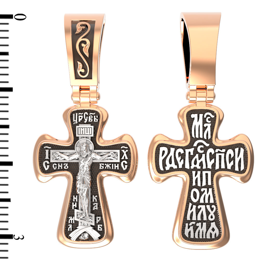 На лицевой стороне креста изображено Распятие, потому что это орудие казни Иисус Христос сделал орудием победы над грехом и смертью. Своими страданиями Он искупил грехи человечества, умерев и сошествовав во ад, победил сатану, освободил души праведников от вечной смерти и открыл им небесные врата рая. Жертва Христа сделала возможным спасение для каждого человека. На православном кресте Христос не умирает, а свободно простирает руки, ладони Иисуса открыты, будто он хочет обнять все человечество, даря им свою любовь и открывая путь к вечной жизни. Над титлом видим слова «ЦРЬ СЛВЫ» — Царь Славы. Верхняя перекладина символизирует собой табличку с надписью «IHЦI» — Иисус Назарянин Царь Иудейский. Возле перекладины пишется сокращенно имя Спасителя «IC XC» — Иисус Христос, ниже перекладины добавляется: словосочетание «СНЪ БЖІЙ» — Сын Божий и «НИКА» (греч. — Победитель). Возвышение, на котором стоит Крест, символизирует гору Голгофу, на которой произошло Распятие. У подножия Креста изображают прах Адама, обозначенный черепом.