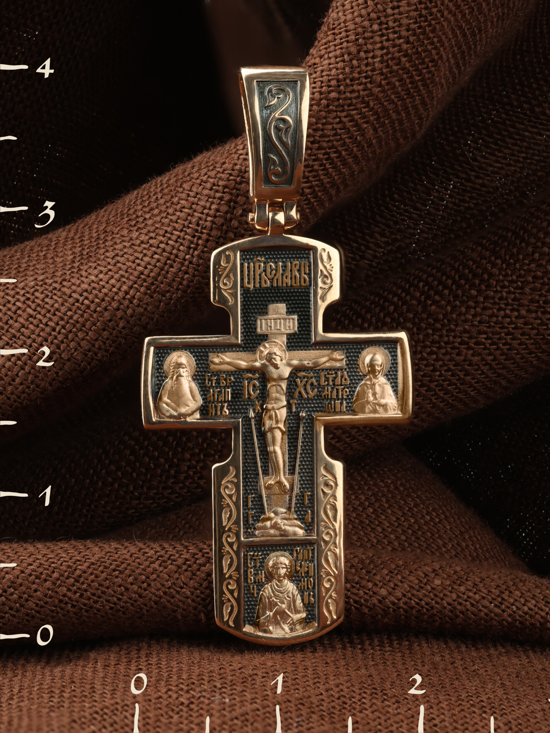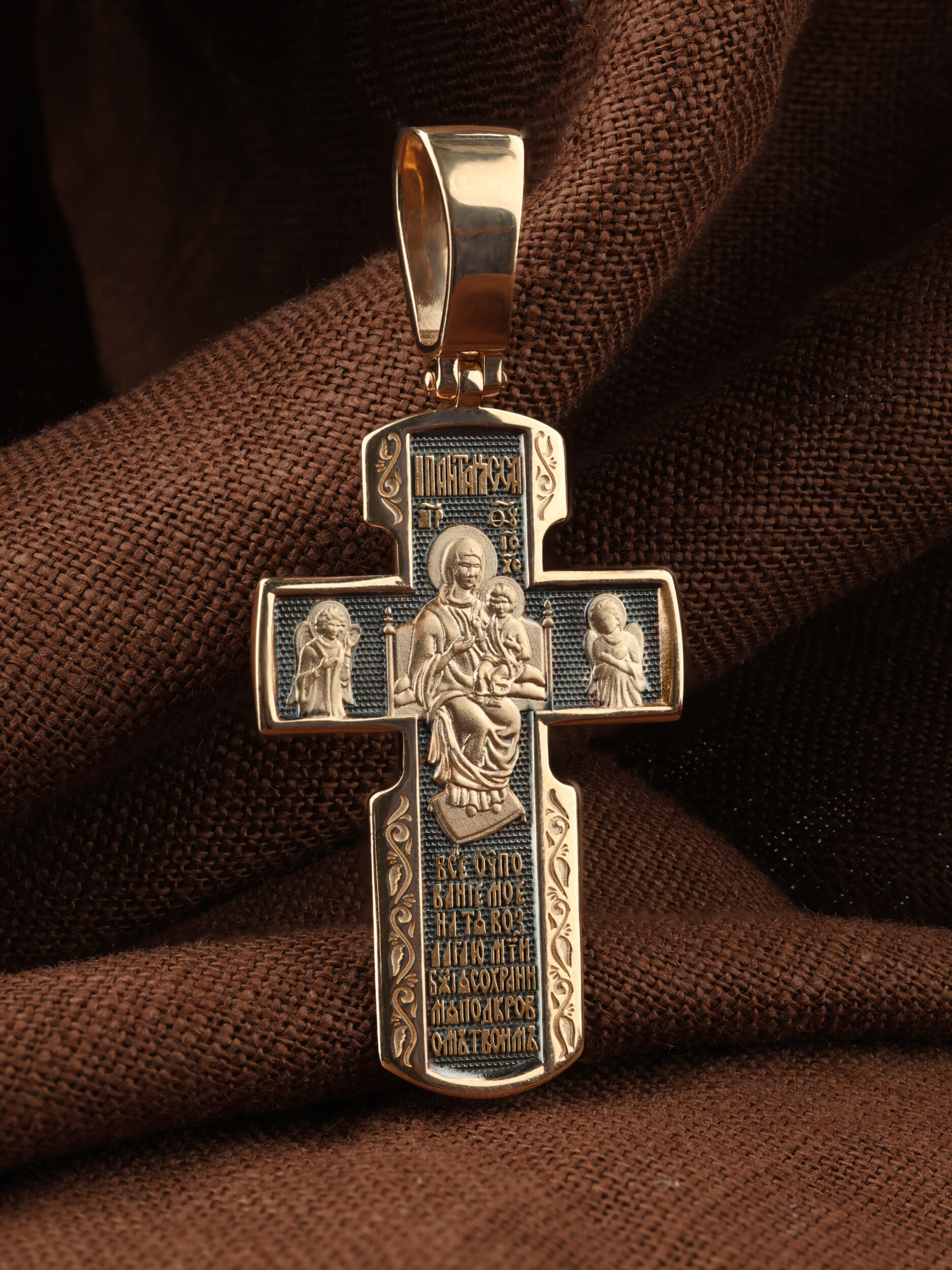 Как действенная помощь в немощах и болезнях был создан крест с образами святых целителей и со знаменитой афонской иконой Божией Матери «Всецарица». На лицевой стороне креста изображено Распятие Иисуса Христа. Над титлом видим слова «ЦРЬ СЛВЫ» — Царь Славы. Верхняя перекладина символизирует собой табличку с надписью «IHЦI» — Иисус Назарянин Царь Иудейский. Под перекладиной пишется сокращенно имя Спасителя «IC XC» — Иисус Христос. Возвышение, на котором стоит Крест, символизирует гору Голгофу, на которой произошло Распятие. У подножия Креста изображают прах Адама, обозначенный черепом. Справа от Распятия помещен образ прославленной святой блаженной Матроны. Слева — икона Преподобный Агапита. Этот святой жил в пещерах Киево-Печерского монастыря в XI веке и бескорыстно врачевал мирян и монахов. У основания Креста Господня изображен великомученик Пантелеимон Целитель. Господь даровал удивительную силу его молитве. Ею он исцелял любые болезни и даже воскрешал умерших.