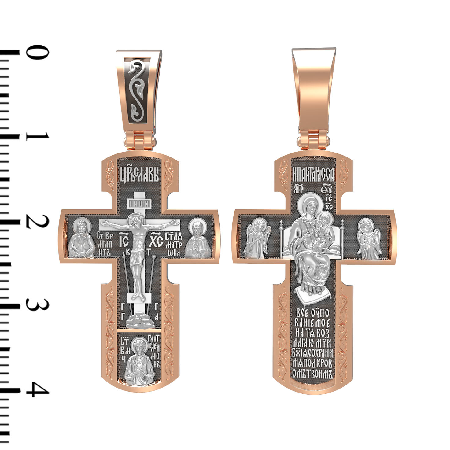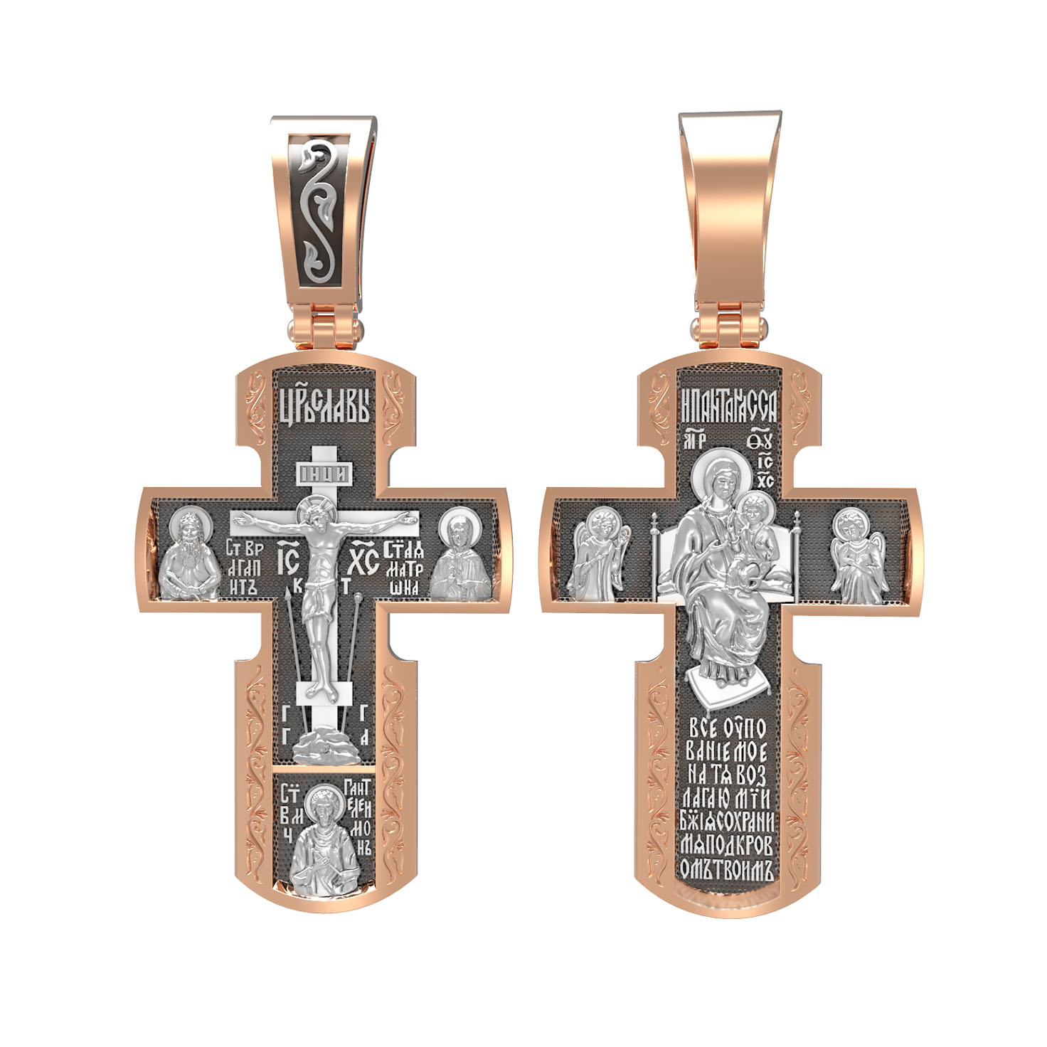Как действенная помощь в немощах и болезнях был создан крест с образами святых целителей и со знаменитой афонской иконой Божией Матери «Всецарица». На лицевой стороне креста изображено Распятие Иисуса Христа. Над титлом видим слова «ЦРЬ СЛВЫ» — Царь Славы. Верхняя перекладина символизирует собой табличку с надписью «IHЦI» — Иисус Назарянин Царь Иудейский. Под перекладиной пишется сокращенно имя Спасителя «IC XC» — Иисус Христос. Возвышение, на котором стоит Крест, символизирует гору Голгофу, на которой произошло Распятие. У подножия Креста изображают прах Адама, обозначенный черепом. Справа от Распятия помещен образ прославленной святой блаженной Матроны. Слева — икона Преподобный Агапита. Этот святой жил в пещерах Киево-Печерского монастыря в XI веке и бескорыстно врачевал мирян и монахов. У основания Креста Господня изображен великомученик Пантелеимон Целитель. Господь даровал удивительную силу его молитве. Ею он исцелял любые болезни и даже воскрешал умерших.