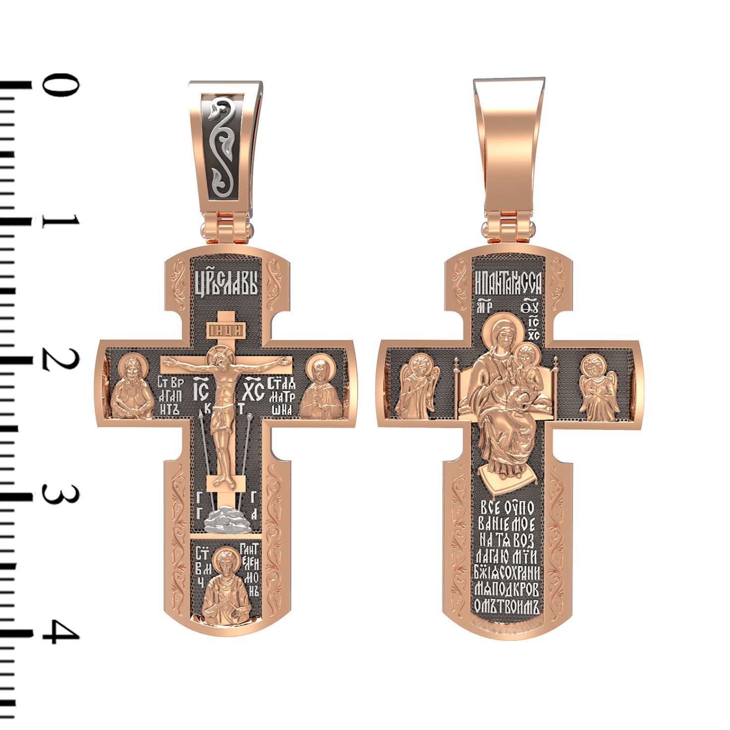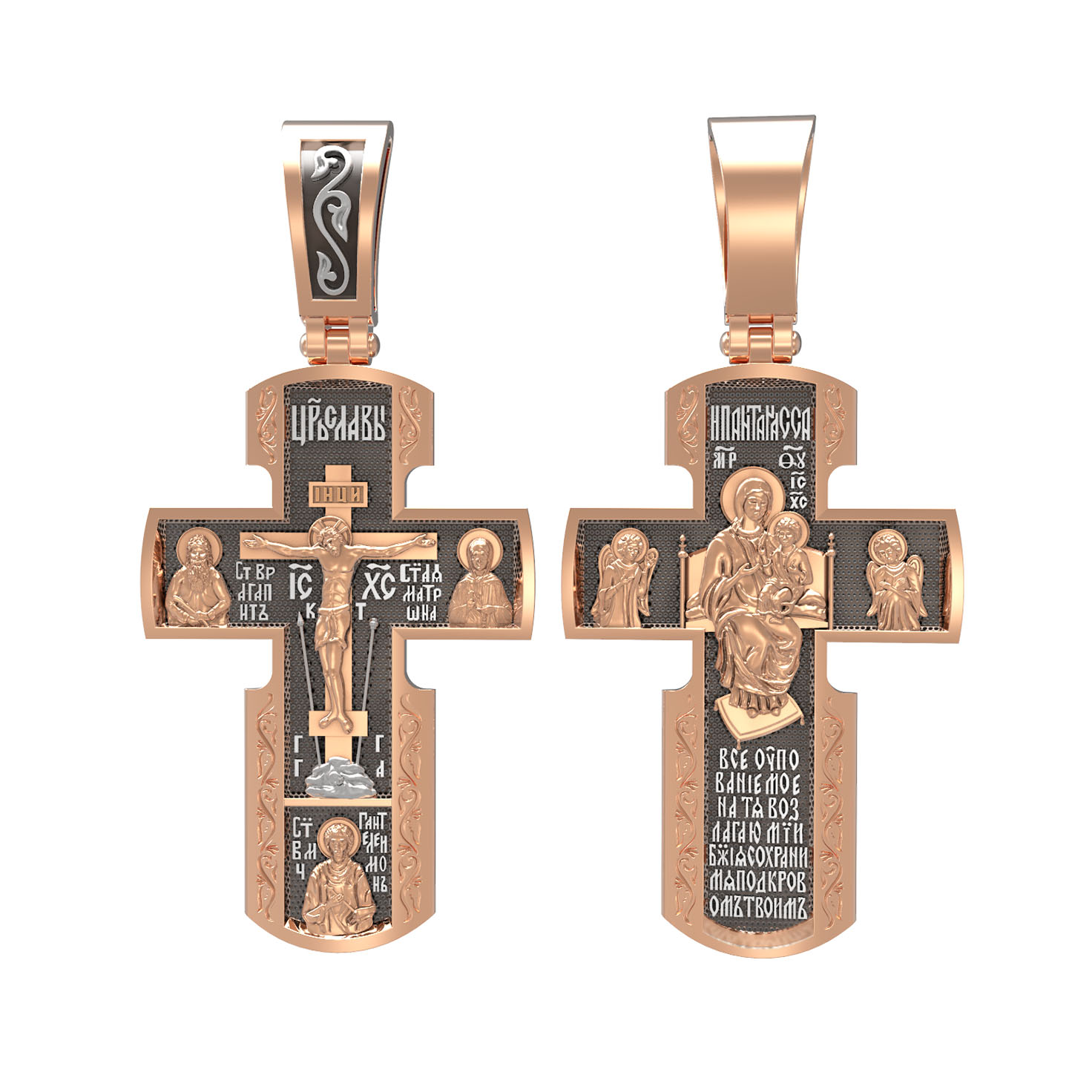 Как действенная помощь в немощах и болезнях был создан крест с образами святых целителей и со знаменитой афонской иконой Божией Матери «Всецарица». На лицевой стороне креста изображено Распятие Иисуса Христа. Над титлом видим слова «ЦРЬ СЛВЫ» — Царь Славы. Верхняя перекладина символизирует собой табличку с надписью «IHЦI» — Иисус Назарянин Царь Иудейский. Под перекладиной пишется сокращенно имя Спасителя «IC XC» — Иисус Христос. Возвышение, на котором стоит Крест, символизирует гору Голгофу, на которой произошло Распятие. У подножия Креста изображают прах Адама, обозначенный черепом. Справа от Распятия помещен образ прославленной святой блаженной Матроны. Слева — икона Преподобный Агапита. Этот святой жил в пещерах Киево-Печерского монастыря в XI веке и бескорыстно врачевал мирян и монахов. У основания Креста Господня изображен великомученик Пантелеимон Целитель. Господь даровал удивительную силу его молитве. Ею он исцелял любые болезни и даже воскрешал умерших.
