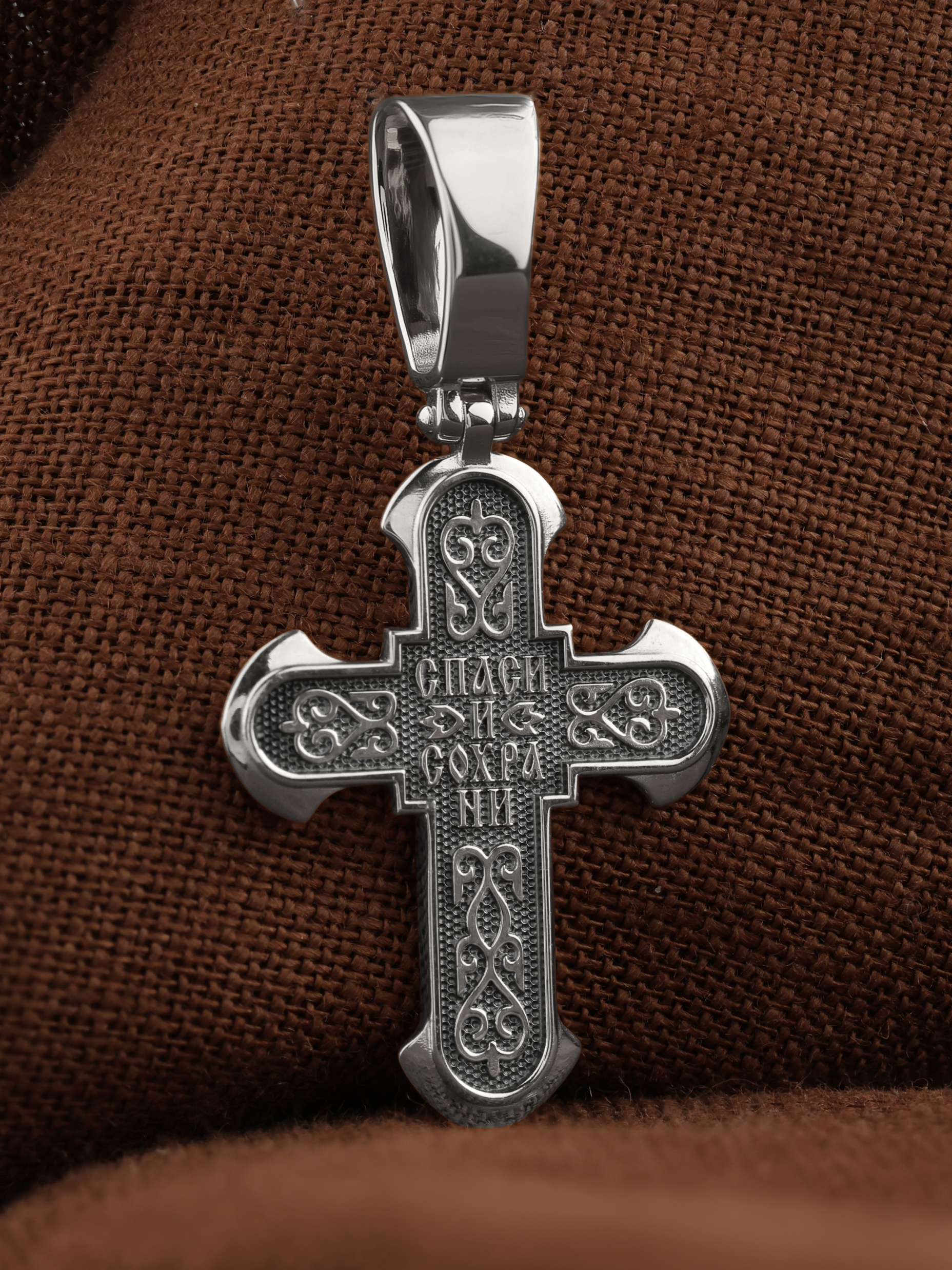 Обратная сторона креста выполнена с использованием растительного орнамента. Такой крест с растительным узором вводит мотив процветшего креста и символизирует Древо Жизни. Умерев за наши грехи, Христос возродил всех для Жизни Вечной, «Смертию смерть поправ…». Своими страданиями Он искупил грехи человечества, умерев и сошествовав во ад, победил сатану, освободил души праведников от вечной смерти и открыл им небесные врата рая. Поэтому на обороте данного креста написано молитвенное славословие: «Спаси и сохрани».