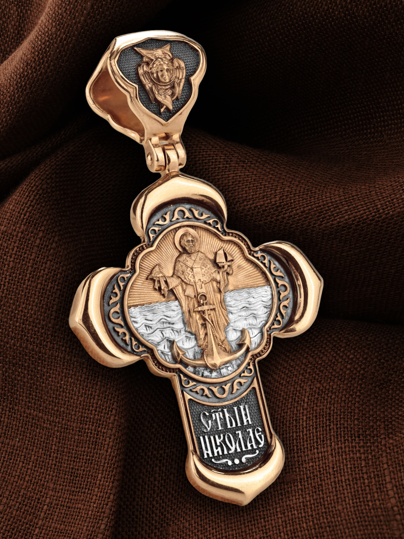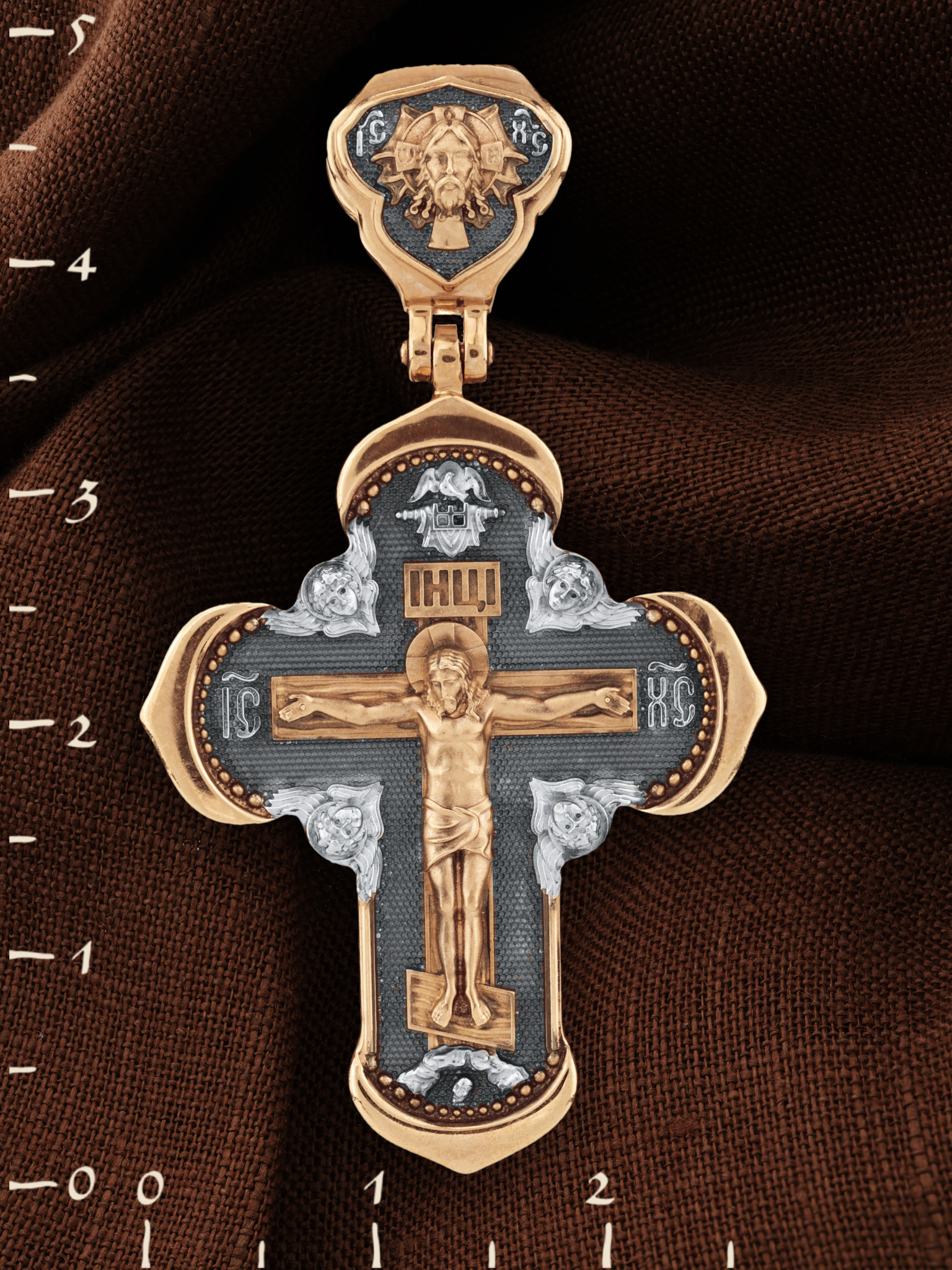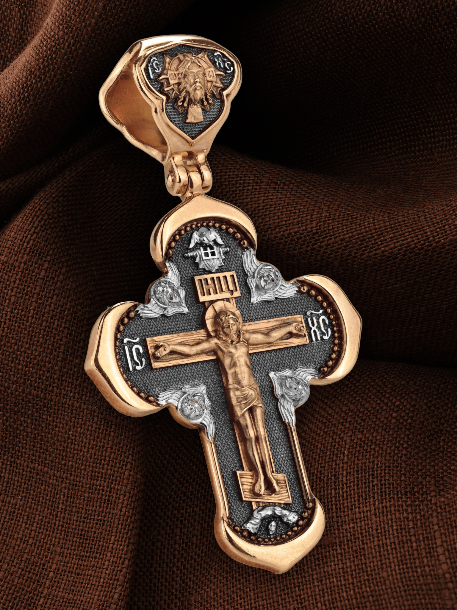 На лицевой стороне креста изображено Распятие Господа и Спасителя нашего Иисуса Христа, отдавшего Себя на смерть, для искупления грехов мира. Крест является символом жертвенной любви Всеблагого Бога к падшим людям, всепобеждающим духовным оружием христиан, основанием и средоточием церковной жизни. Господь сказал: «кто хочет идти за Мною, отвергнись себя, и возьми крест свой, и следуй за Мною». (Мк. 8: 34). На верхней табличке, выше головы Иисуса, расположена надпись, составленная Понтием Пилатом — «IНЦI». Она означает «Иисус Назорей, Царь Иудейский». Надпись «IC» «ХC», означает Иисус Христос, помещается на разных сторонах поперечной перекладины креста. Крест стоит на горе камней, символизирующих Голгофу. В ее основании различается череп– это голова Адама. На кулонном кольце изображен Нерукотворный образ Господа и Спасителя нашего Иисуса Христа, чудесно отпечатавшийся на плате, которым Христос вытер свой лик.