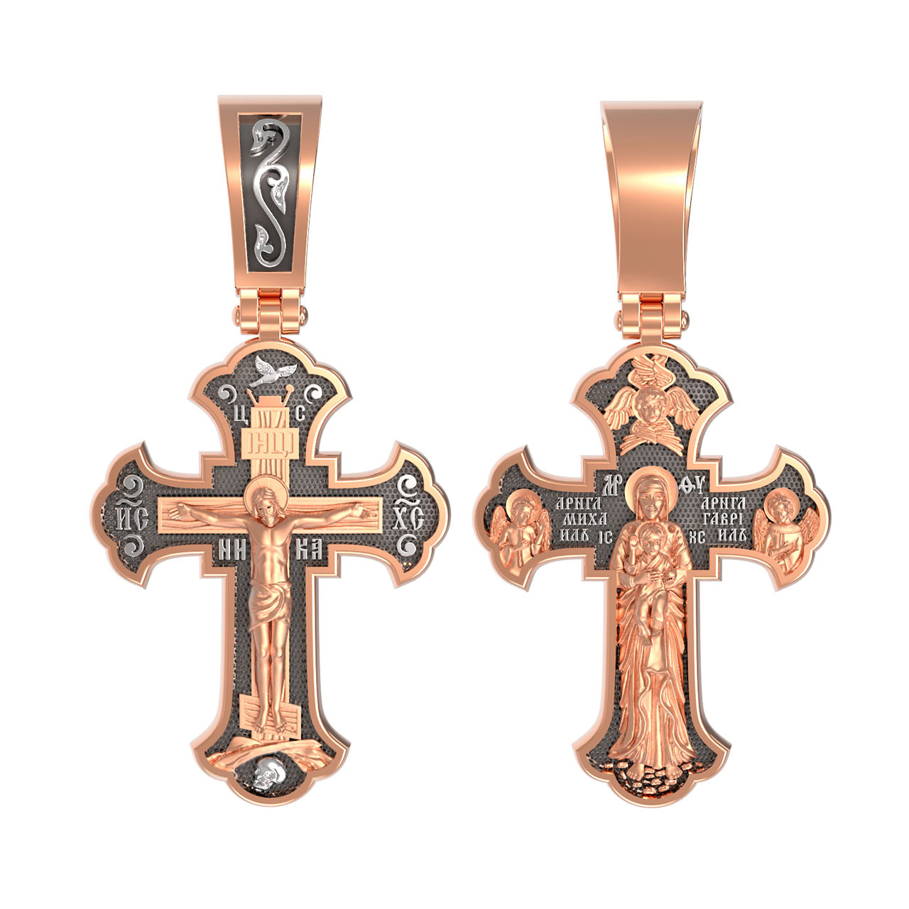 На лицевой стороне креста изображено Распятие, потому что это орудие казни Иисус Христос сделал орудием победы над грехом и смертью. Своими страданиями Он искупил грехи человечества, умерев и сошествовав во ад, победил сатану, освободил души праведников от вечной смерти и открыл им небесные врата рая. Жертва Христа сделала возможным спасение для каждого человека. На православном кресте Христос не умирает, а свободно простирает руки, ладони Иисуса открыты, будто он хочет обнять все человечество, даря им свою любовь и открывая путь к вечной жизни.