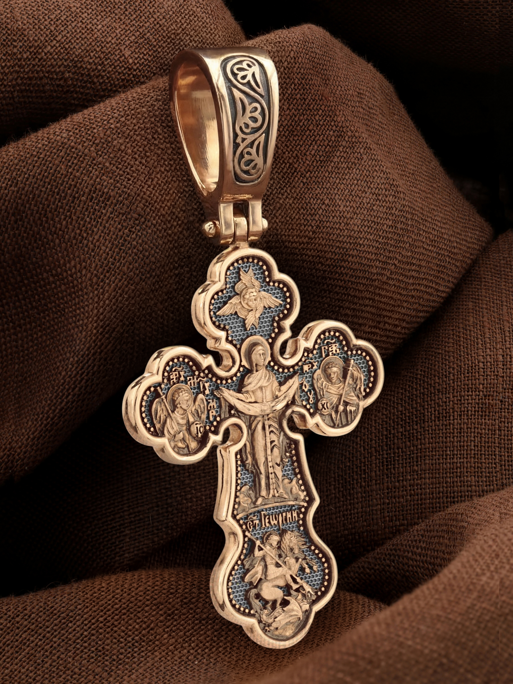 Центральную часть оборотной стороны креста украшает икона Божией Матери «Покров Пресвятой Богородицы». Праздник Покрова Пресвятой Богородицы пришел на Русь в XII веке из Византии и стал одним из самых почитаемых. Пресвятая Богородица простирает Свой молитвенный покров над всеми православными христианами и умоляет Сына своего о даровании вечного спасения каждому человеку. Над образом помещен шестикрылый Серафим. Справа помещено изображение Архангела Гавриила, слева- Архангела Михаила. На кресте внизу помещено изображение Святого Великомученика Георгия Победоносца — одного из самых почитаемых и удивительных святых. Он изображен как воитель, сидящий на вздыбленном коне и поражающий копьем огнедышащего змея. Змей символизирует собою сатанинские силы.