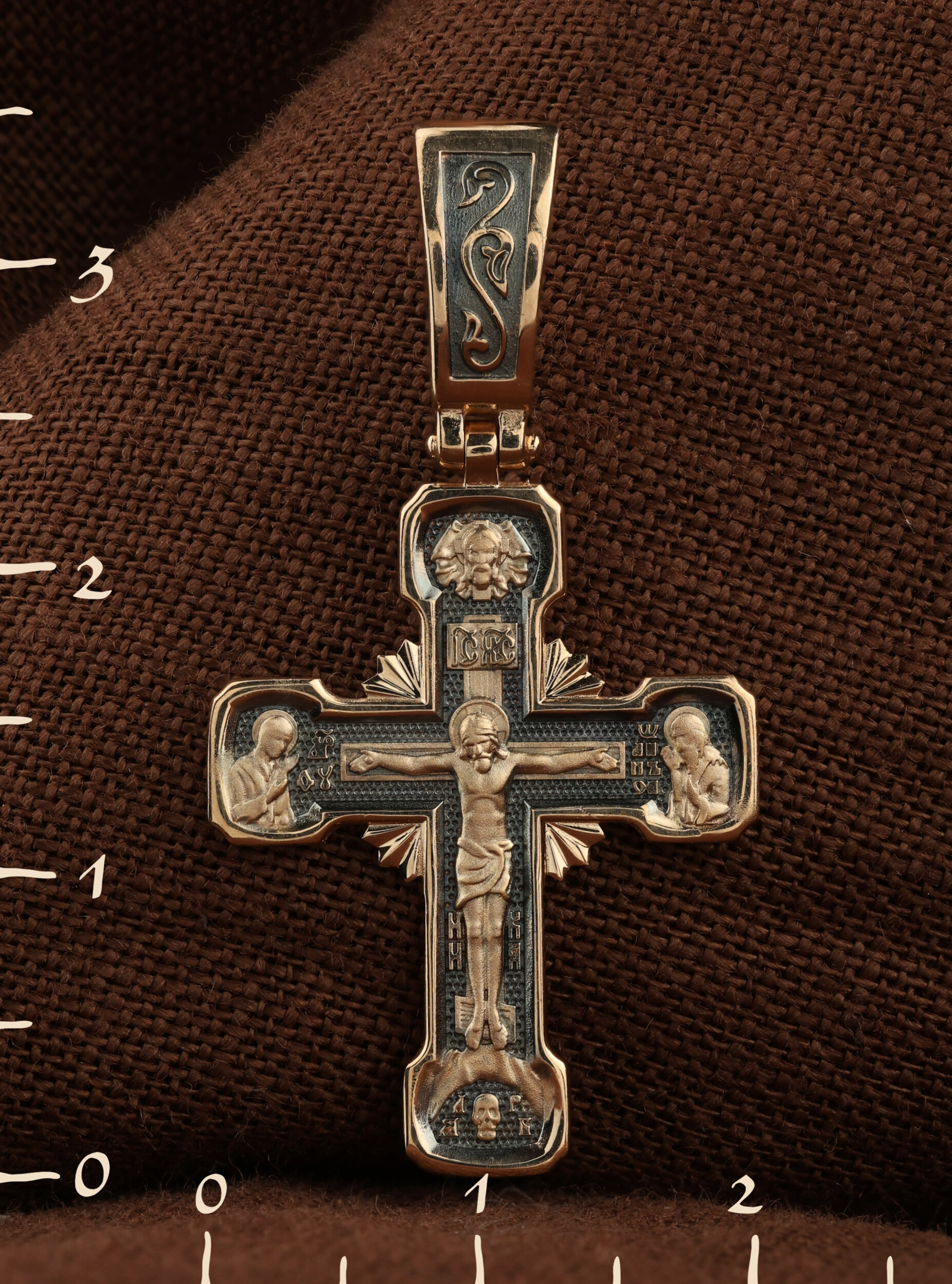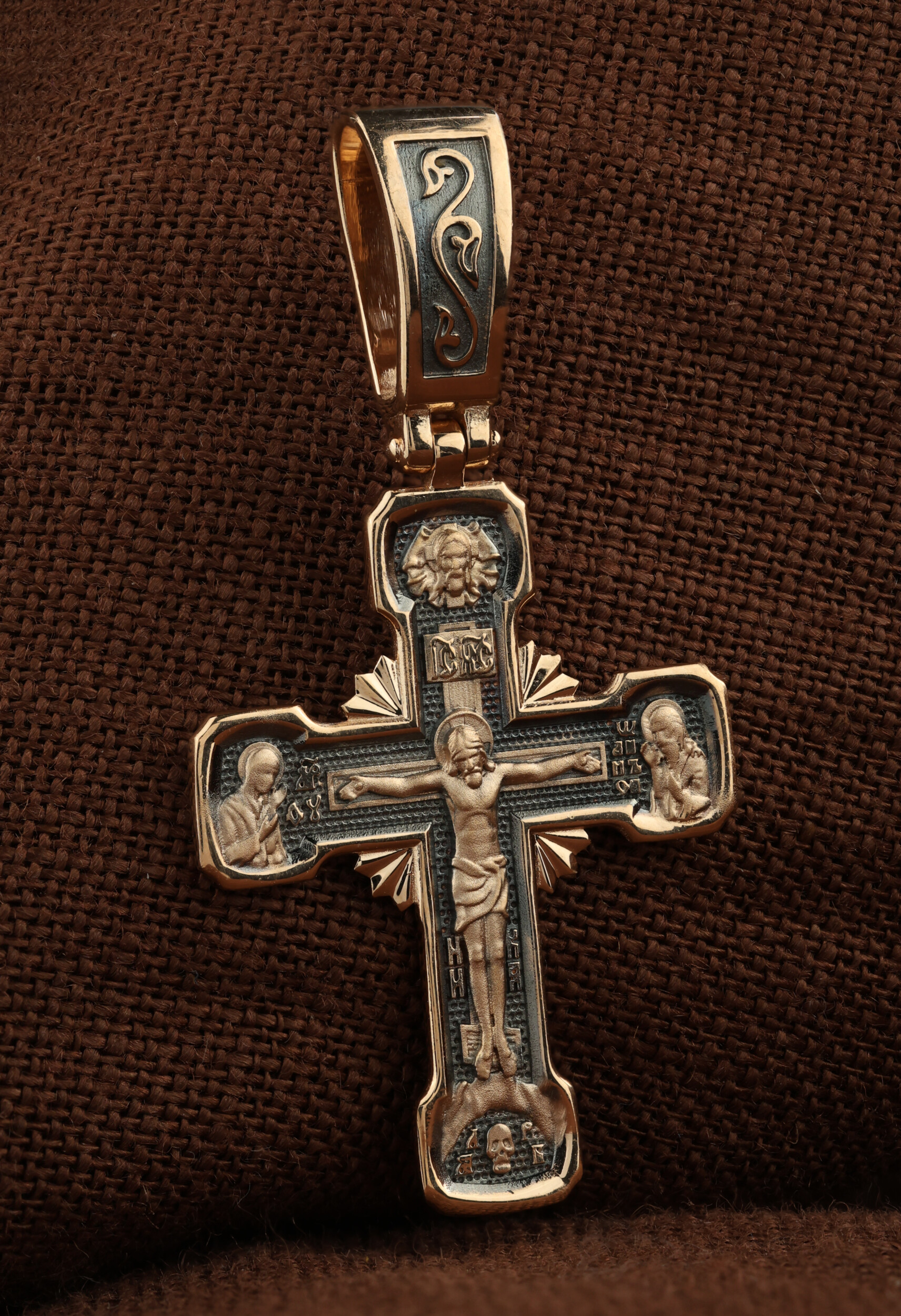 На лицевой стороне креста изображено Распятие Господа Иисуса Христа. Верхняя перекладина символизирует собой табличку с надписью «IHЦI» — Иисус Назарянин Царь Иудейский. Ниже перекладины добавляется: «НИКА» (греч. — Победитель). Возвышение, на котором стоит Крест, символизирует гору Голгофу, на которой произошло Распятие. У подножия Креста изображают прах Адама, обозначенный черепом.