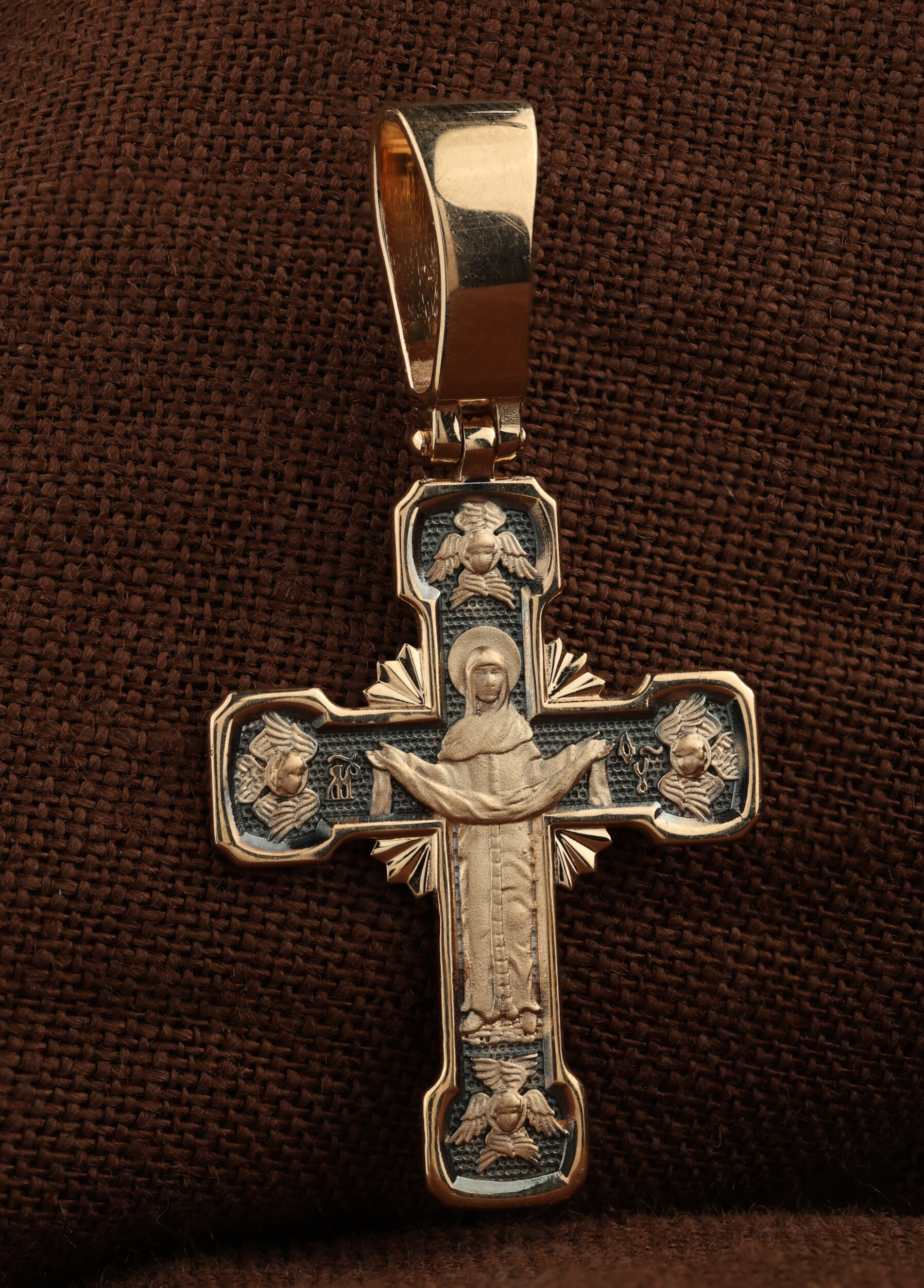 На обороте креста изображена икона Покрова Пресвятой Богородицы. Праздник Покрова Божией Матери является воспоминанием чуда, которое произошло во Влахнернской церкви 1 (14) октября 910 года: Пресвятая Богородица явилась верующим над алтарем храма и распростерла над ними Свое покрывало. В этот день Божья Матерь открыла людям, что Она является Ходатаицей за них перед Богом. Икону окружают шестикрылые Серафимы — самые приближенные к Господу Ангелы. Над иконой Богородицы изображен Спас Нерукотворный — Символ вочеловечившегося Божества.