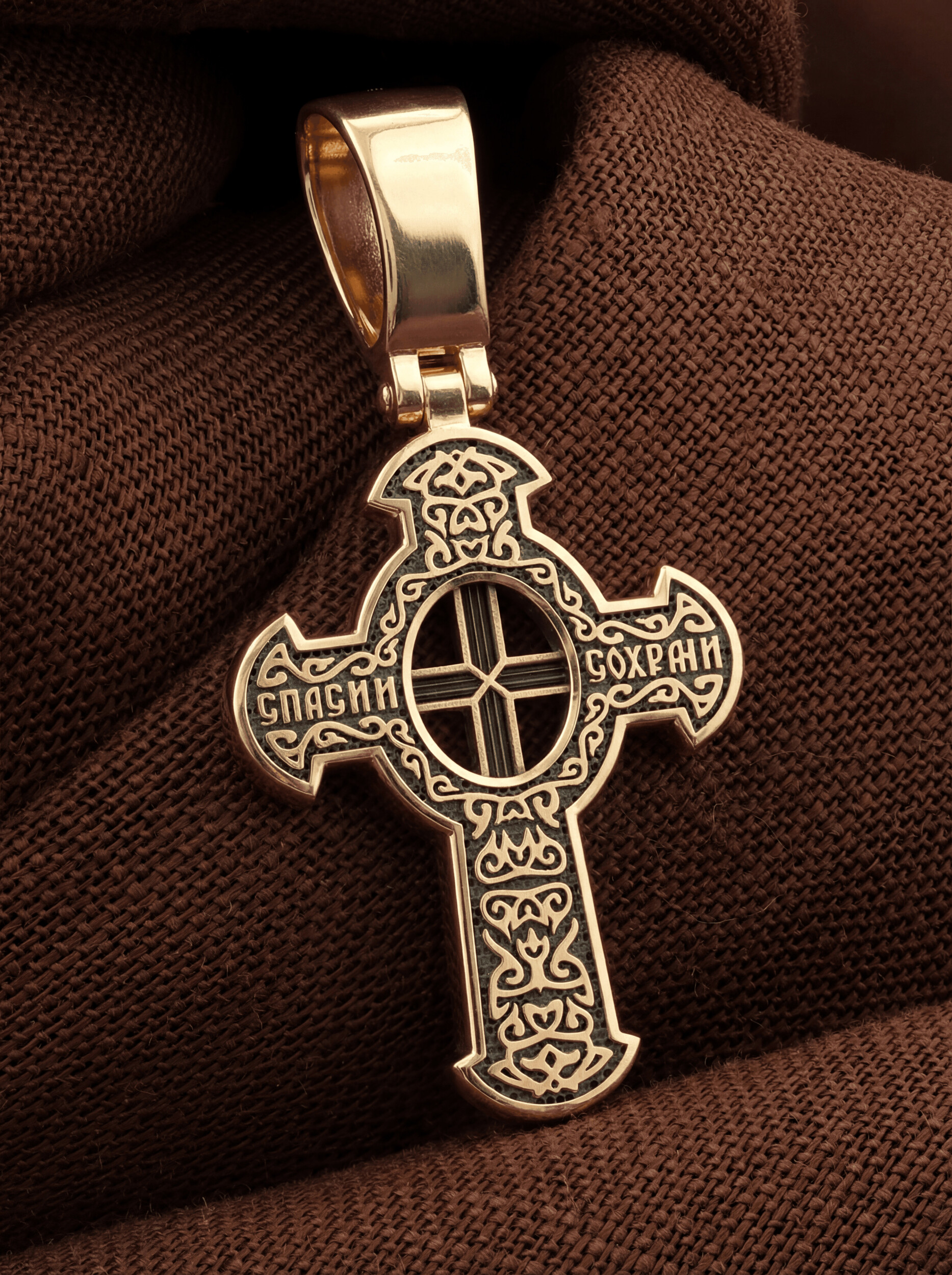 Оборотная сторона креста украшена растительным орнаментом. Помещенный на крест орнамент символизирует жизнедательную силу, животворное тепло креста. В растительный узор, на горизонтальной перекладине, вписано молитвенное славословие: «Спаси и сохрани». Эта надпись означает непрерывную молитву, совершаемую носителем данного креста.