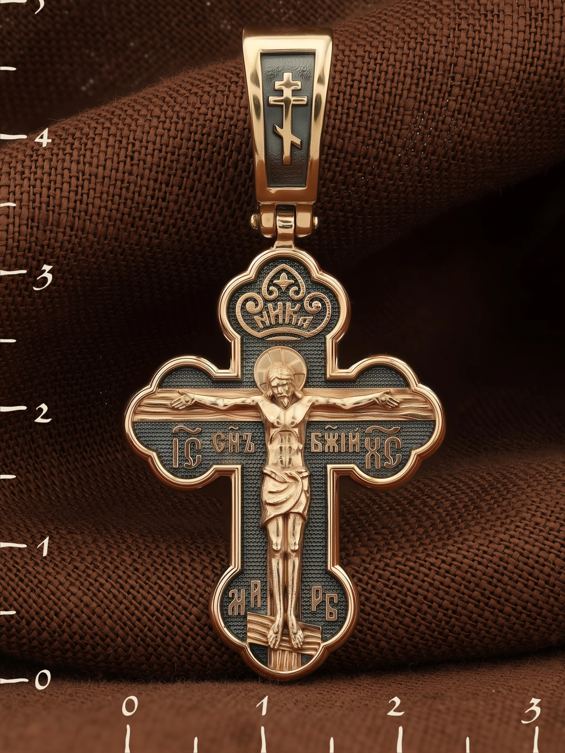 Крест нательный четырехконечный с трехлепестковыми завершениями перекладин. Основой композиции лицевой стороны креста является Распятие Иисуса Христа. С обеих сторон горизонтальной перекладины надписи — монограмма святого имени Христа — «ИС ХС», а под ней «Сын Божий». Над головой Христа надпись — «НИКА» (Победитель). В подножии мы видим изображенную гору Голгофу в виде скалистой горки, а так же буквы «МЛ» «РБ», которые означают: «Место Лобное Рай Бысть». Крест, на котором Спаситель мира принес Искупительную жертву, открыл врата рая, затворившиеся после грехопадения Адама. Поэтому Лобное место (Голгофа) стало раем.
