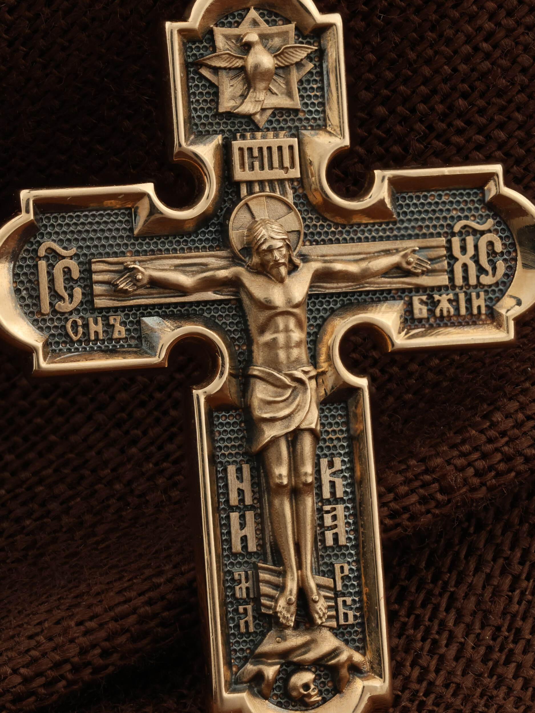 На лицевой стороне креста изображено Распятие Иисуса Христа. Господь представлен свободно покоящимся на кресте с простертыми руками и как бы обнимающим всю Вселенную. Верхняя перекладина символизирует титло — табличку, на которой, согласно Евангелию, было начертано: Иисус Назорей Царь Иудейский (IНЦI). Также Распятие сопровождается надписями, олицетворяющими Христа: святое имя Христа «IC» (Иисус) «ХС» (Христос), и словосочетание «СНЪ БЖIЙ» — СЫН БОЖИЙ. Рядом с образом Христа помещены слова — «НИКА» (греч. — Победитель) и четыре буквы «МЛ» «РБ» — Место Лобное Рай Бысть. Возвышение, на котором стоит Крест, символизирует гору Голгофу, на которой произошло Распятие. У подножия Креста изображают прах Адама, обозначенный черепом. На кулонном кольце изображен шестикрылый Серафим — самый приближенный к Господу Ангел.