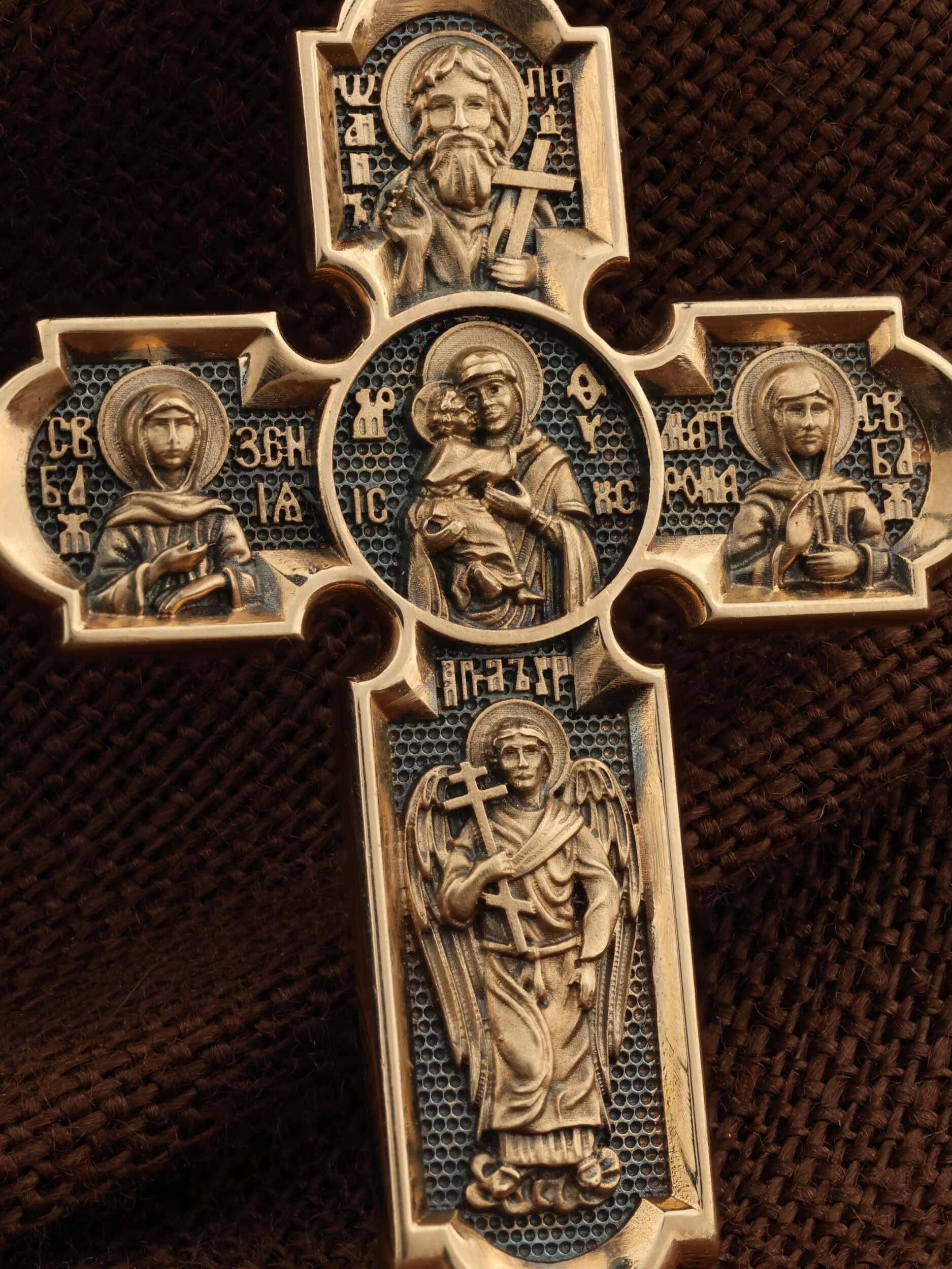Центральную часть оборота креста украшает Владимирская икона Божией Матери. По преданию, она была написана на доске трапезного стола из дома Иисуса Христа. На Русь икона была привезена в начале XII века и с тех пор почитается как главная святыня нашего Отечества. Внизу изображен Архангел Михаил, слева — Святая Блаженная Ксения, справа — Святая Блаженная Матрона, вверху — пророк, почитающийся в христианстве, Предтеча Господень Иоанн Креститель. На кулонном кольце изображен Спас Нерукотворный — Символ вочеловечившегося Божества.