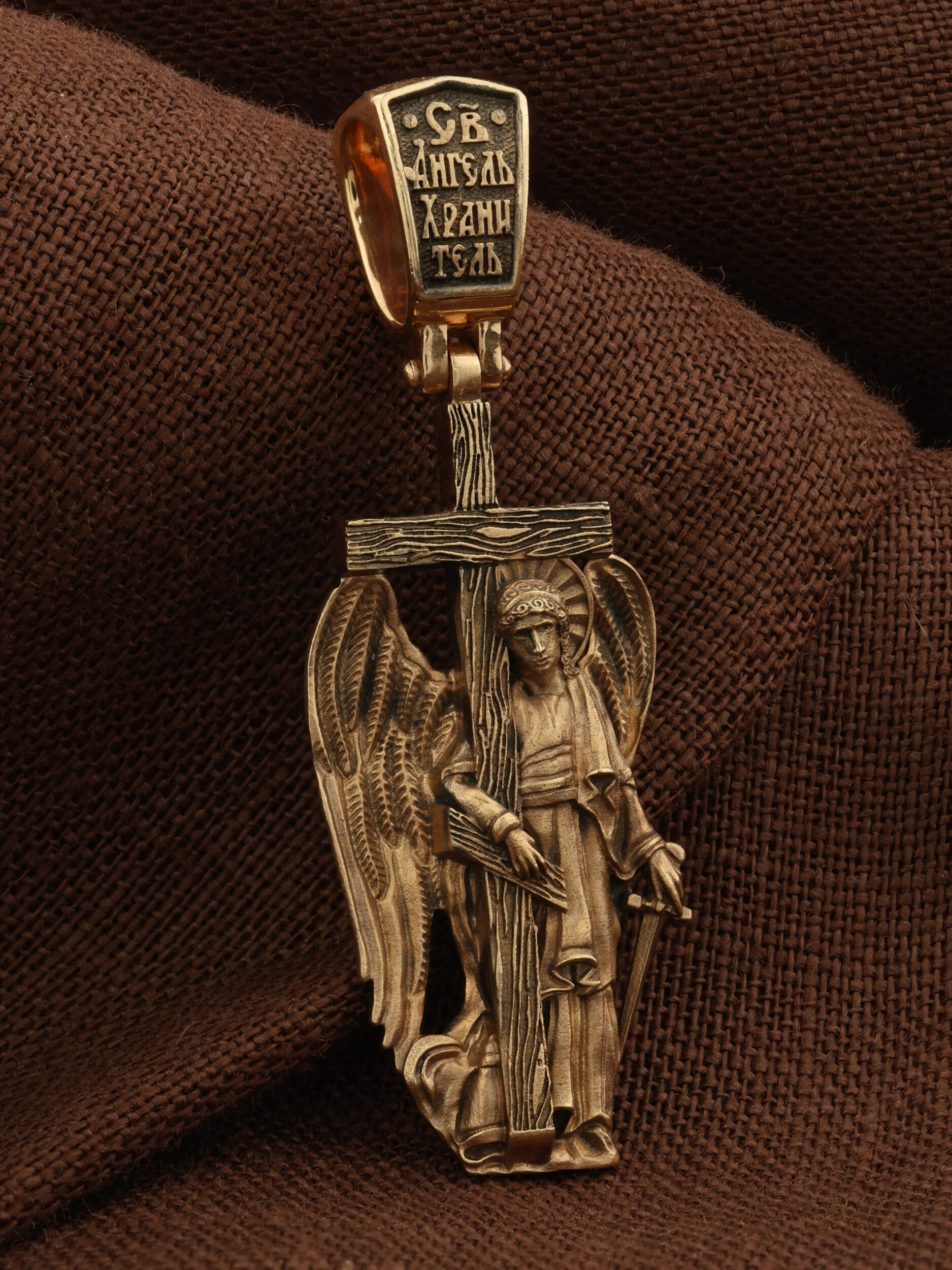 Основой композиции является изображение Святого Ангела-Хранителя держащего в правой руке крест, а в левой — мечь. Крест является символом жертвенной любви всеблагого Бога к падшим людям, всепобеждающим духовным оружием христиан, основанием и средоточием церковной жизни. Господь сказал: «кто хочет идти за Мною, отвергнись себя, и возьми крест свой, и следуй за Мною». (Мк. 8: 34). Ангел-Хранитель — это Ангел приставляемый Богом к человеку при крещении для охраны и помощи в добрых делах. Он невидимо находится при человеке на протяжении всей его жизни, если человек сохраняет в себе любовь к Богу и истинную веру перед Ним. Ангел-Xранитель делают для нас все, что служит к истинному нашему благу и спасению. Невидимо пребывая при нас постоянно, он, руководствуя нас ко спасению, не только по нашему желанию таинственно наставляет нас на все доброе и полезное, не только возносит наши молитвы к Богу, но еще и сам от себя охраняют и защищают нас от врагов видимых и невидимых и ходатайствует за нас пред Богом. Ангел-Хранитель так любит нас, как никто на земле любить не может. Ангел-Хранитель — присный друг наш, незримый тихий собеседник, пресладостный утешитель.