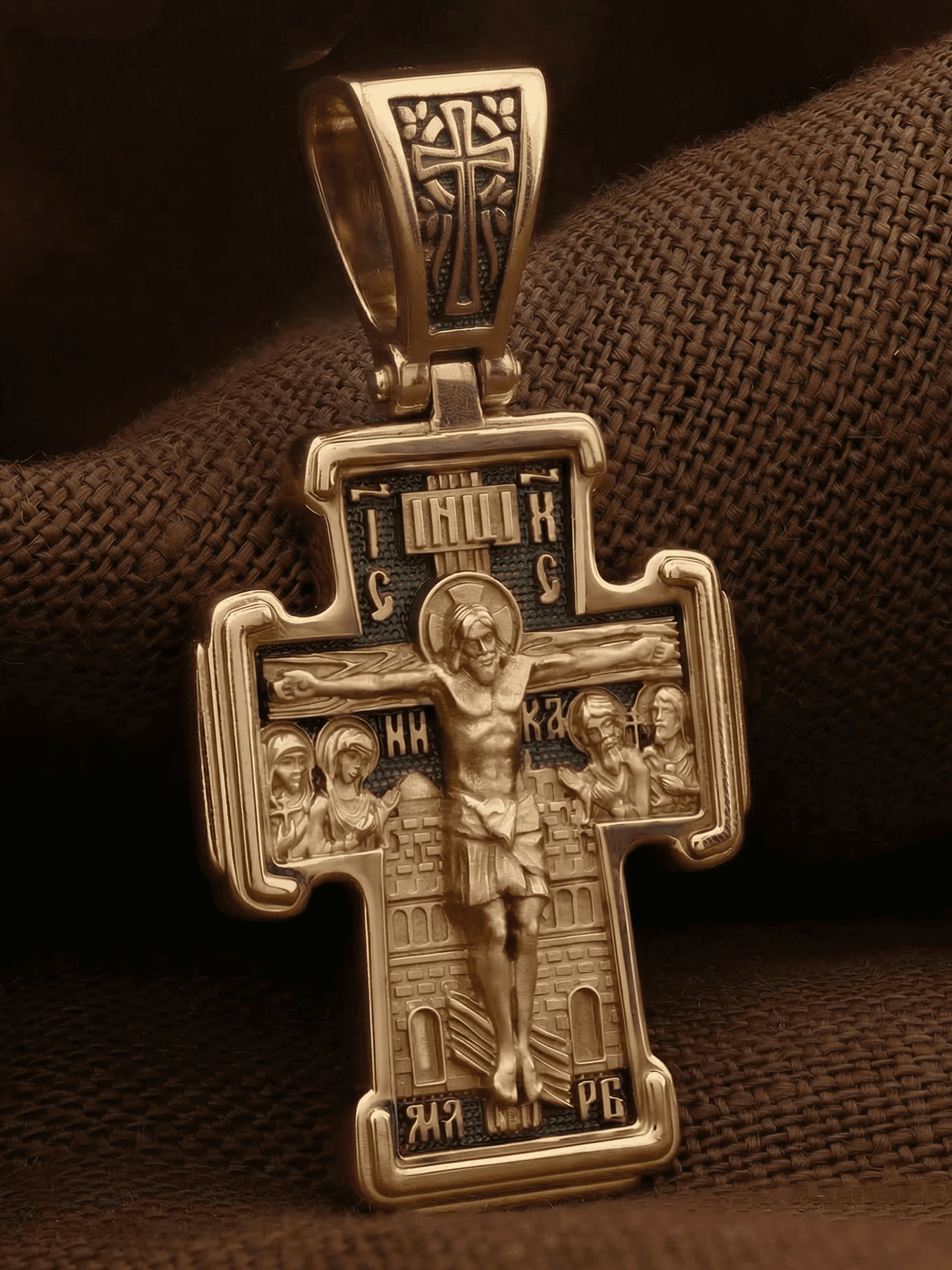На лицевой стороне креста изображено Распятие Господа и Спасителя нашего Иисуса Христа. Крест- символ спасения и искупления рода человеческого, знамение победы над смертью и адом. Иисус Христос, как искупительная жертва освобождения человечества от власти греха, умер крестной смертью и в третий день воскрес. На верхней табличке, выше головы Иисуса, расположена надпись, составленная Понтием Пилатом — «IНЦI». Она означает «Иисус Назорей, Царь Иудейский». Рядом расположена надпись «IС» « ХС». Она означает Иисус Христос. Ниже — слово «НИКА», что означает «победитель». Слева от Распятия — Пресвятая Богородица и святая мироносица Мария Магдалина с крестом в руке. Справа — апостол и евангелист Иоанн Богослов, один из ближайших учеников Иисуса Христа, и сотник Лонгин с крестом в правой руке и копьем — в левой. За крестом высится Иерусалимская стена. Надпись «МЛРБ» — «место лобное рай бысть» означает, что место лобное стало раем, помещается в нижней части креста. На кулонном кольце помещен крест.