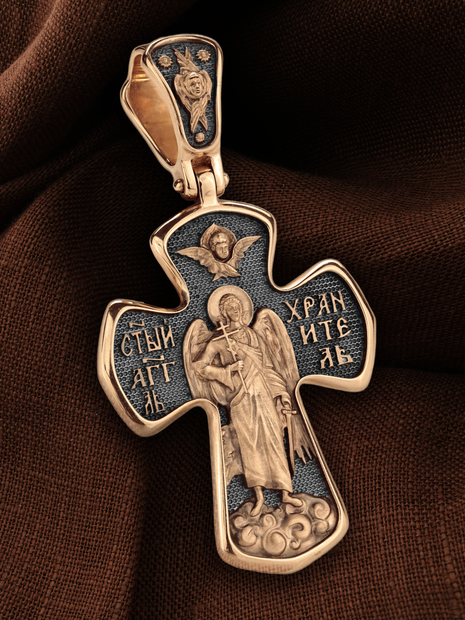 На оборотной стороне креста изображен Святой Ангел-Хранитель держащего в правой руке крест, а в левой — мечь. Ангел-Хранитель — это Ангел приставляемый Богом к человеку при крещении для охраны и помощи в добрых делах. Он невидимо находится при человеке на протяжении всей его жизни, если человек сохраняет в себе любовь к Богу и истинную веру перед Ним. Ангел-Xранитель делают для нас все, что служит к истинному нашему благу и спасению. Невидимо пребывая при нас постоянно, он, руководствуя нас ко спасению, не только по нашему желанию таинственно наставляет нас на все доброе и полезное, не только возносит наши молитвы к Богу, но еще и сам от себя охраняют и защищают нас от врагов видимых и невидимых и ходатайствует за нас пред Богом. Одного лишь каждому из нас он желает — спасения души; к этому он направляет все свои заботы. Над образом помещен Серафим.