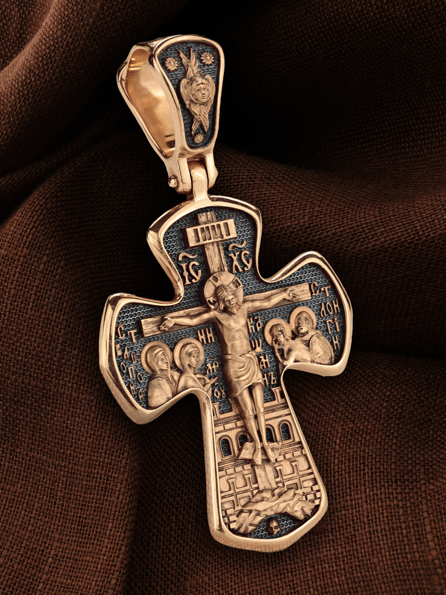 На лицевой стороне креста изображено Распятие Господа и Спасителя нашего Иисуса Христа, отдавшего Себя на смерть, для искупления грехов мира. Господь сказал: кто хочет идти за Мною, отвергнись себя, и возьми крест свой, и следуй за Мною. (Мк. 8: 34). Крест является символом жертвенной любви всеблагого Бога к падшим людям, всепобеждающим духовным оружием христиан, основанием и средоточием церковной жизни. На верхней перекладине помещена надпись «IС» « ХС», что означает Иисус Христос. Ниже — слово «НИКА», что означает «победитель». Слева от Распятия изображена Пресвятая Богородица, справа — апостол и евангелист Иоанн Богослов, один из ближайших учеников Иисуса Христа. За Распятием высится Иерусалимская стена, в знак того, что Господь был распят вне стен города. Возвышение, на котором стоит Крест, символизирует гору Голгофу, на которой произошло Распятие. Под подножием Креста изображена покоящаяся голова (череп) Адама. На кулонном кольце помещен крест.