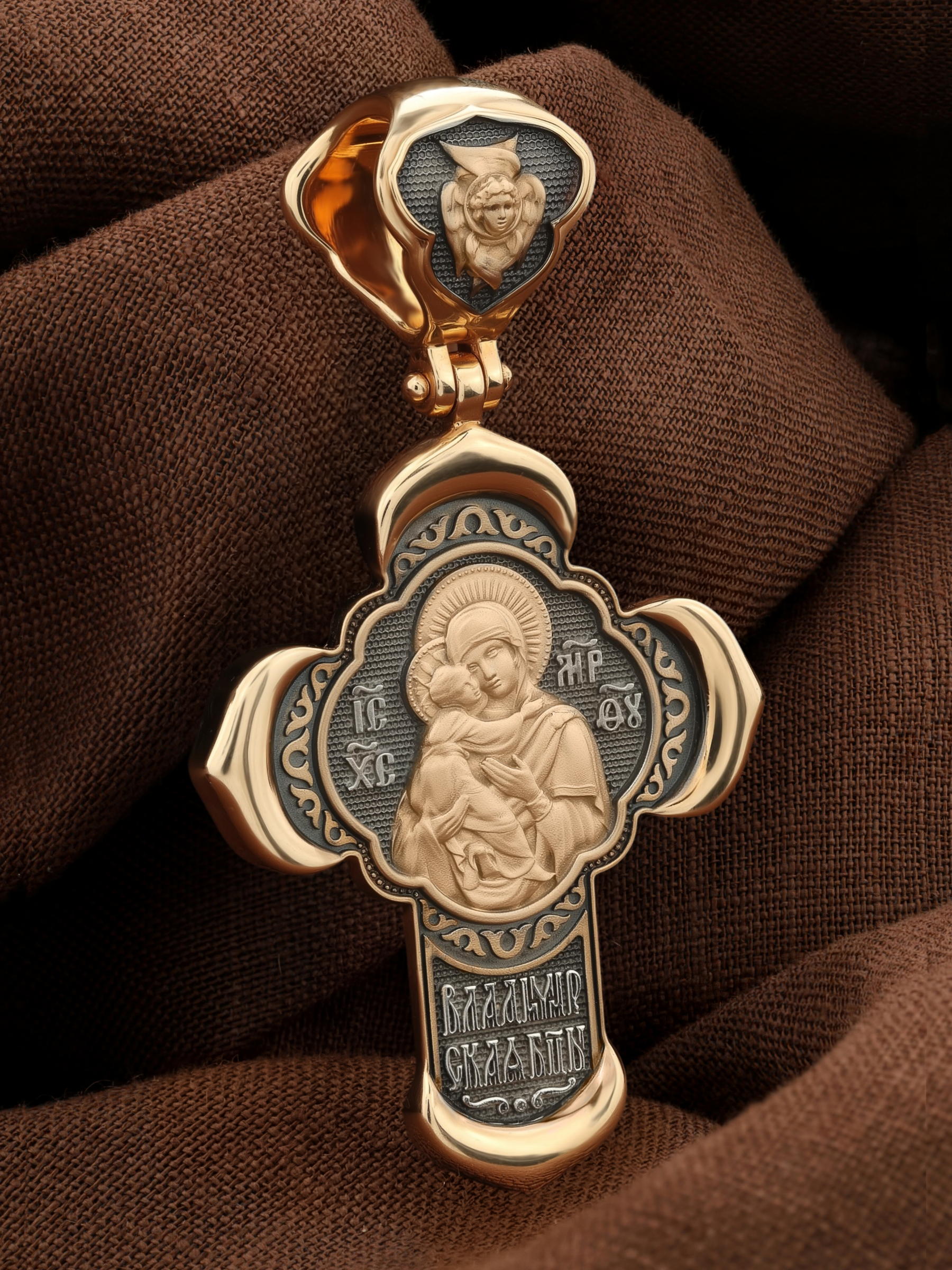 В центре оборотной стороне креста помещен образ Владимирской иконы Божией Матери — один из самых чтимых святынь Русской православной церкви. По преданию, икона была написана Святым апостолом и евангелистом Лукой во время земной жизни Богородицы. Икона Владимирской Божией Матери вплоть до V века находилась в Иерусалиме, затем была перевезена в Византию. На Русь икона была привезена в 1131 г. За прошедшие столетия святыня неоднократно переезжала из Владимира в Москву и обратно, не раз спасая страну от захватчиков. Русская Православная Церковь установила троекратное празднование Владимирской иконе Божией Матери. Каждый из дней празднования связан с избавлением русского народа от порабощения иноплеменниками по молитвам ко Пресвятой Богородице