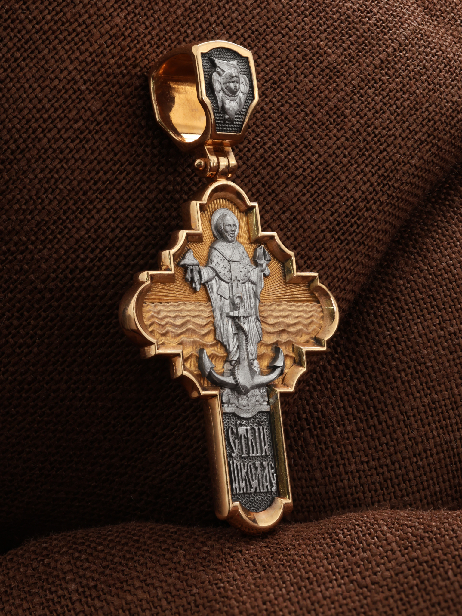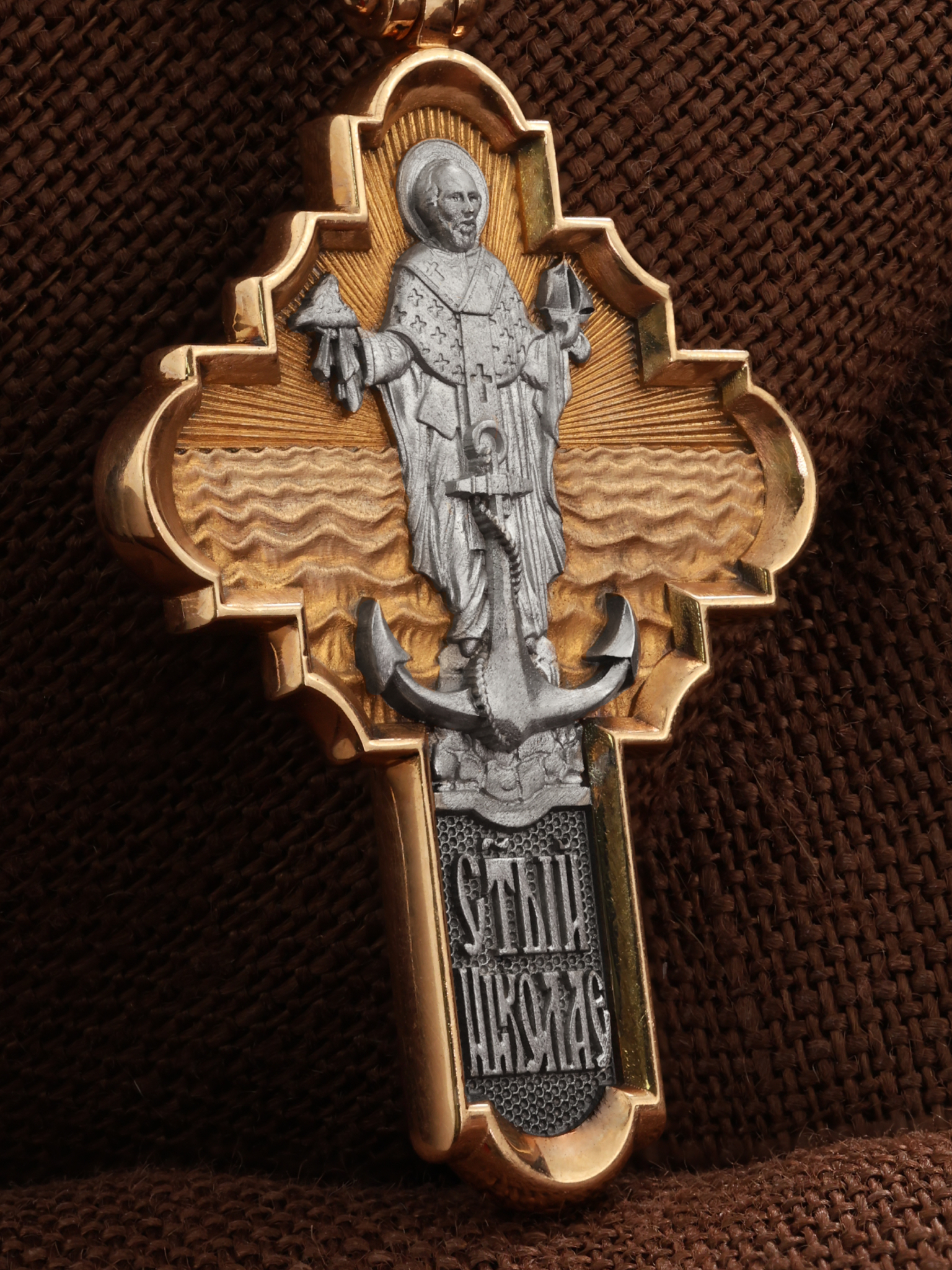 На оборотной стороне креста изображен Святитель Николай архиепископ Мир Ликийских, Чудотворец. Он является одним из самых почитаемых святых в православном мире. Много великих и преславных чудес сотворил на земле и на море великий Святитель Николай Угодник. Он помогал сущим в бедах, укрощал штормы, спасал от потопления и выносил на сушу из глубины морской, освобождал из плена и приносил освобожденных домой, избавлял от уз и темницы, защищал от посечения мечом, освобождал от смерти и подавал многим различные исцеления, слепым прозрение, хромым хождение, глухим слух, немым дар слова. Святитель Николай Чудотворец изображен стоящим в полный рост в лодке. В деснице святой держит мыс Горн, а в левой — корабль. Эта икона была написана путешественником и священником Фёдором Конюховым. Во время одного из своих путешествий, проходя пролив Дрейка, Фёдор, понимая, что выжить в такой бушующей стихии невозможно, стал молиться Святителю Николаю Чудотворцу. Он мысленно пообещал себе: «если пройду мыс Горн, то построю часовню Николаю Чудотворцу»… И в следующий миг, совсем неожиданно — волны утихли. Яхта Конюхова благополучно прошла опасный участок пути. Вернувшись домой, Фёдор Конюхов построил часовню в благодарность за свое спасение.