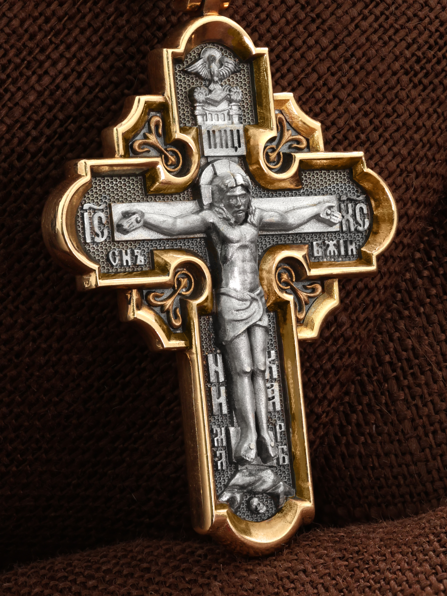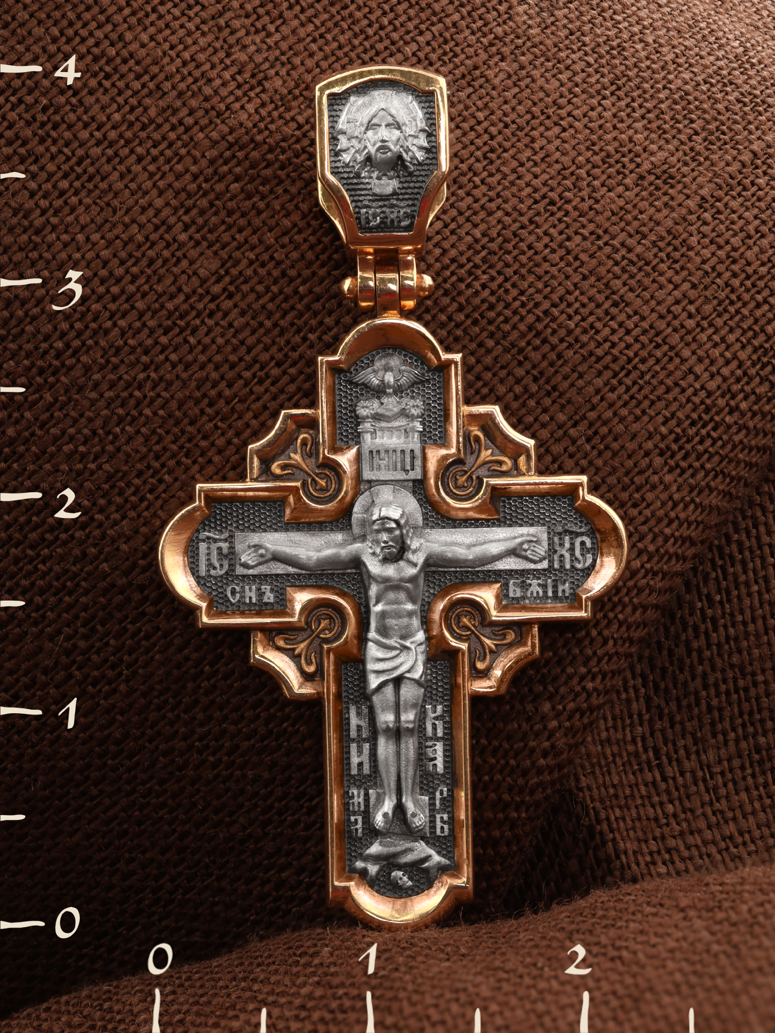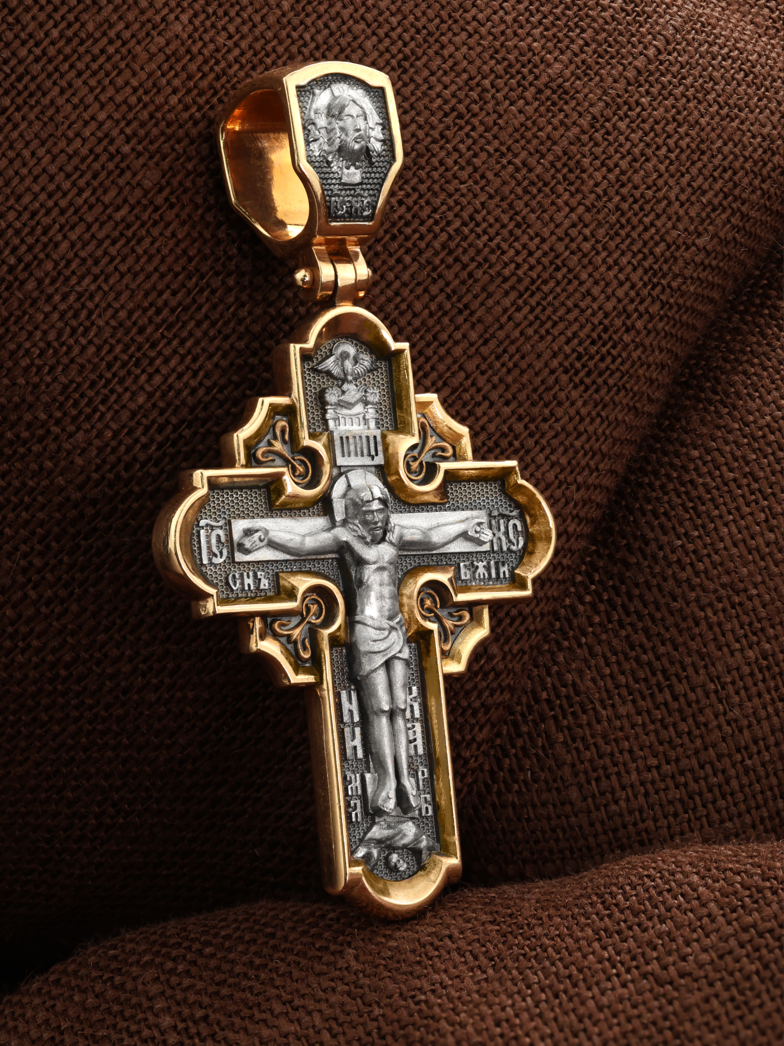 На лицевой стороне креста изображено Распятие Господа и Спасителя нашего Иисуса Христа, отдавшего Себя на смерть, чтобы другие могли жить — жить вечной жизнью, жить с Богом. Своею кровью Господь освятил крест и сделал его проводником Своей благодати, источником освящения верующих. На верхней табличке, выше головы Иисуса, расположена надпись, составленная Понтием Пилатом — «ИНЦИ». Она означает «Иисус Назорей, Царь Иудейский». Надпись «IС ХС» означает Иисус Христос помещается на разных сторонах поперечной (большой) перекладины креста. На кулонном кольце помещено изображение Духа Святого в виде голубя, сходящего с Небес