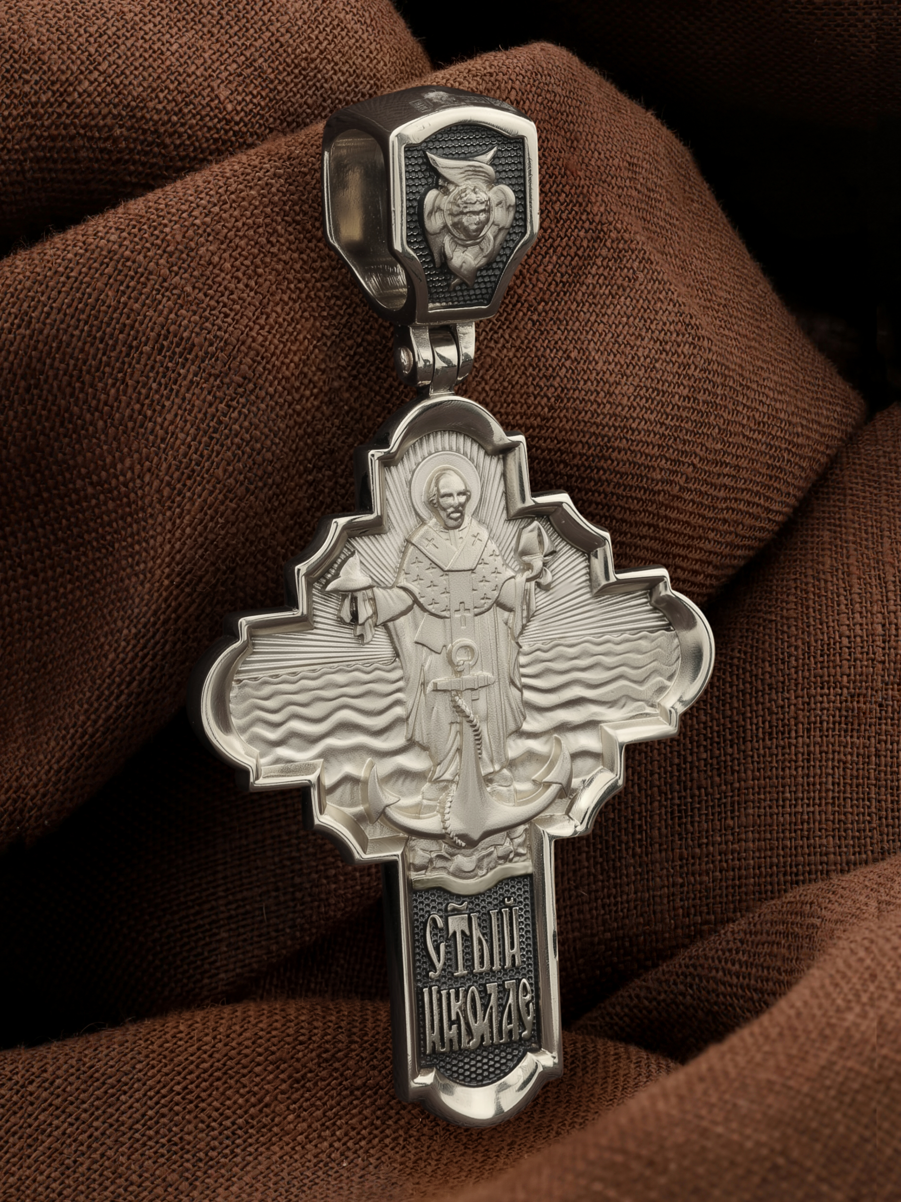 На лицевой стороне креста изображено Распятие Господа и Спасителя нашего Иисуса Христа, отдавшего Себя на смерть, чтобы другие могли жить — жить вечной жизнью, жить с Богом. Своею кровью Господь освятил крест и сделал его проводником Своей благодати, источником освящения верующих. На верхней табличке, выше головы Иисуса, расположена надпись, составленная Понтием Пилатом — «ИНЦИ». Она означает «Иисус Назорей, Царь Иудейский». Надпись «IС ХС» означает Иисус Христос помещается на разных сторонах поперечной (большой) перекладины креста. На кулонном кольце помещено изображение Духа Святого в виде голубя, сходящего с Небес