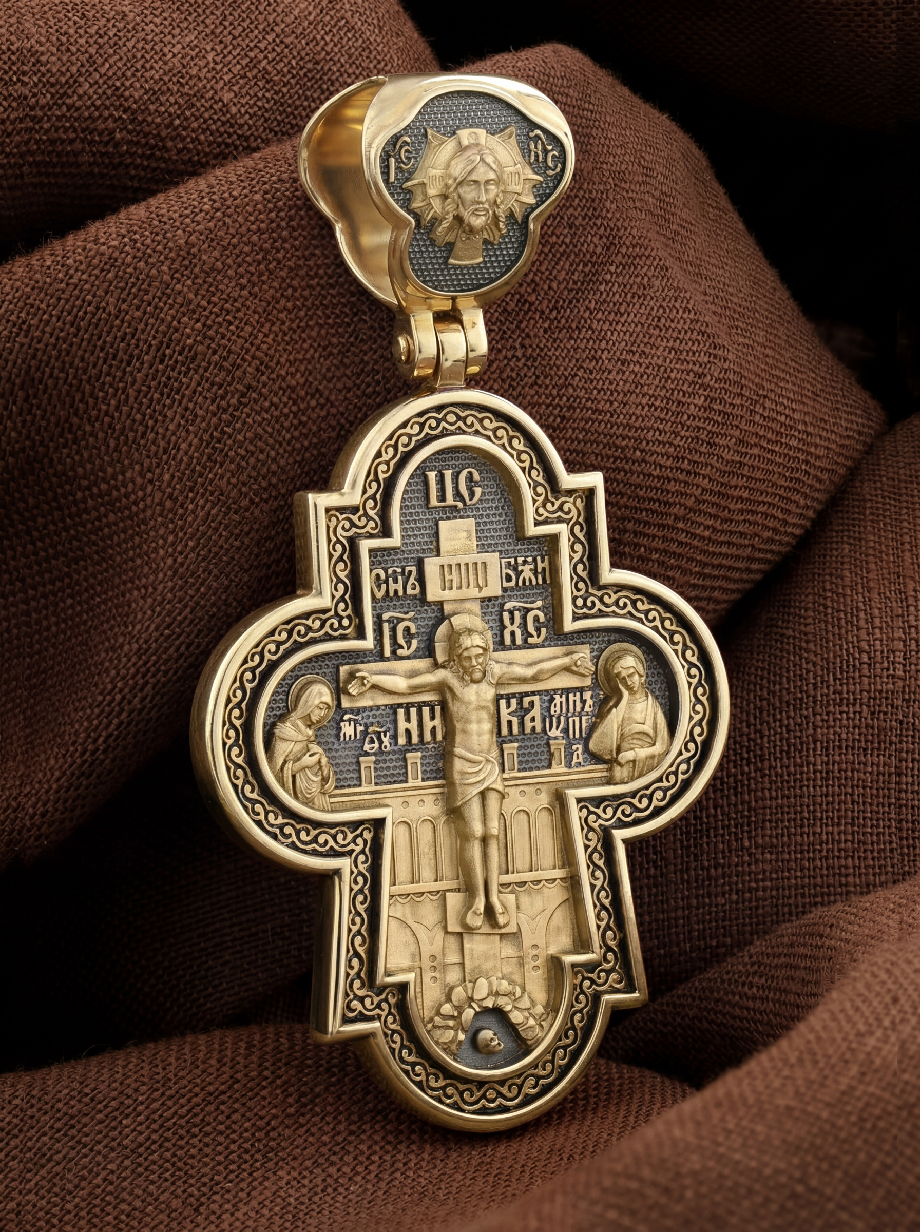 На лицевой стороне креста изображено Распятие Господа и Спасителя нашего Иисуса Христа, отдавшего Себя на смерть, для искупления грехов мира. Крест является символом жертвенной любви Всеблагого Бога к падшим людям, всепобеждающим духовным оружием христиан, основанием и средоточием церковной жизни. Господь сказал: кто хочет идти за Мною, отвергнись себя, и возьми крест свой, и следуй за Мною. (Мк. 8: 34). Над Распятием помещена надпись «Царь Славы». На верхней табличке, выше головы Иисуса, расположена надпись, составленная Понтием Пилатом — «IНЦI». Она означает «Иисус Назорей, Царь Иудейский». Надпись «IC» «ХC», означает Иисус Христос, помещается на разных сторонах поперечной перекладины креста. Возвышение, на котором стоит Крест, символизирует гору Голгофу, на которой произошло Распятие. Под подножием Креста изображена покоящаяся голова (череп) Адама. На кулонном кольце изображен Нерукотворный образ Господа и Спасителя нашего Иисуса Христа, чудесно отпечатавшийся на плате, которым Христос вытер свой лик.