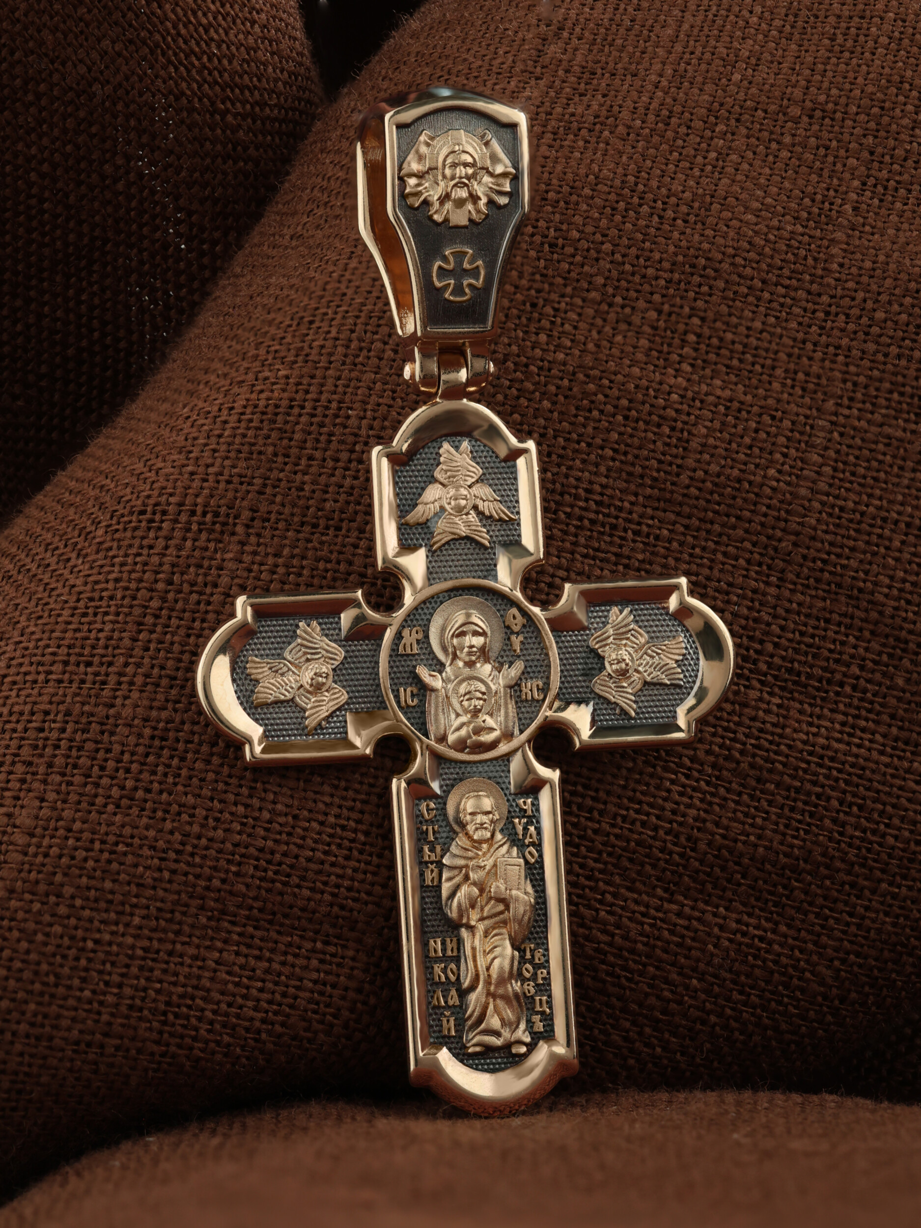 У основания креста в полный рост изображен самый любимый святой Православной Церкви — Николай Чудотворец. Святой почитается как целитель болезней, покровитель путешествующих, особенно по морю, помощник в торговле, учебе, а также в поисках достойного супруга.