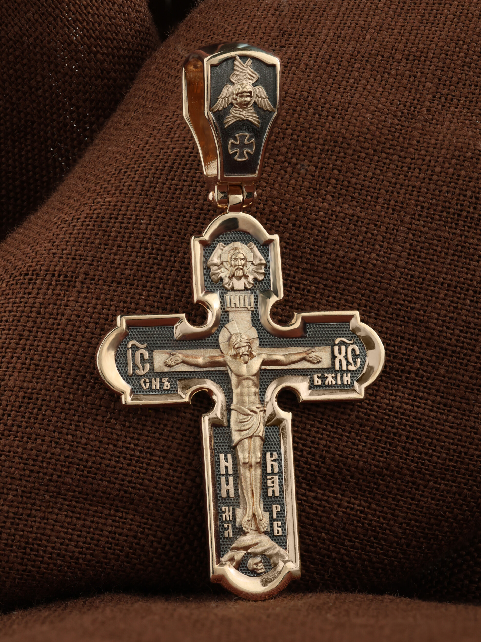 На лицевой стороне нательного креста по традиции изображено Распятие Господа нашего Иисуса Христа. Крест Господень стоит на небольшом каменистом возвышении, символизирующем гору Голгофу, которая обозначена буквами МЛРБ (Место Лобное Рай Бысть). Над головой Господа на поперечной перекладине написано «ИНЦИ», что символизирует табличку, которая была прибита к Кресту, с надписью «Иисус Назорей Царь Иудейский». Этим иудеи хотели посмеяться над Христом, не зная, что распинают истинного Царя всех царей. По сторонам основной перекладины расположены позолоченные рельефные инициалы Христа «ИС ХС». Под перекладиной, по сторонам древа, находится надпись «СЫН БОЖИЙ», а в основании креста — надпись «НИКА» (Победитель).