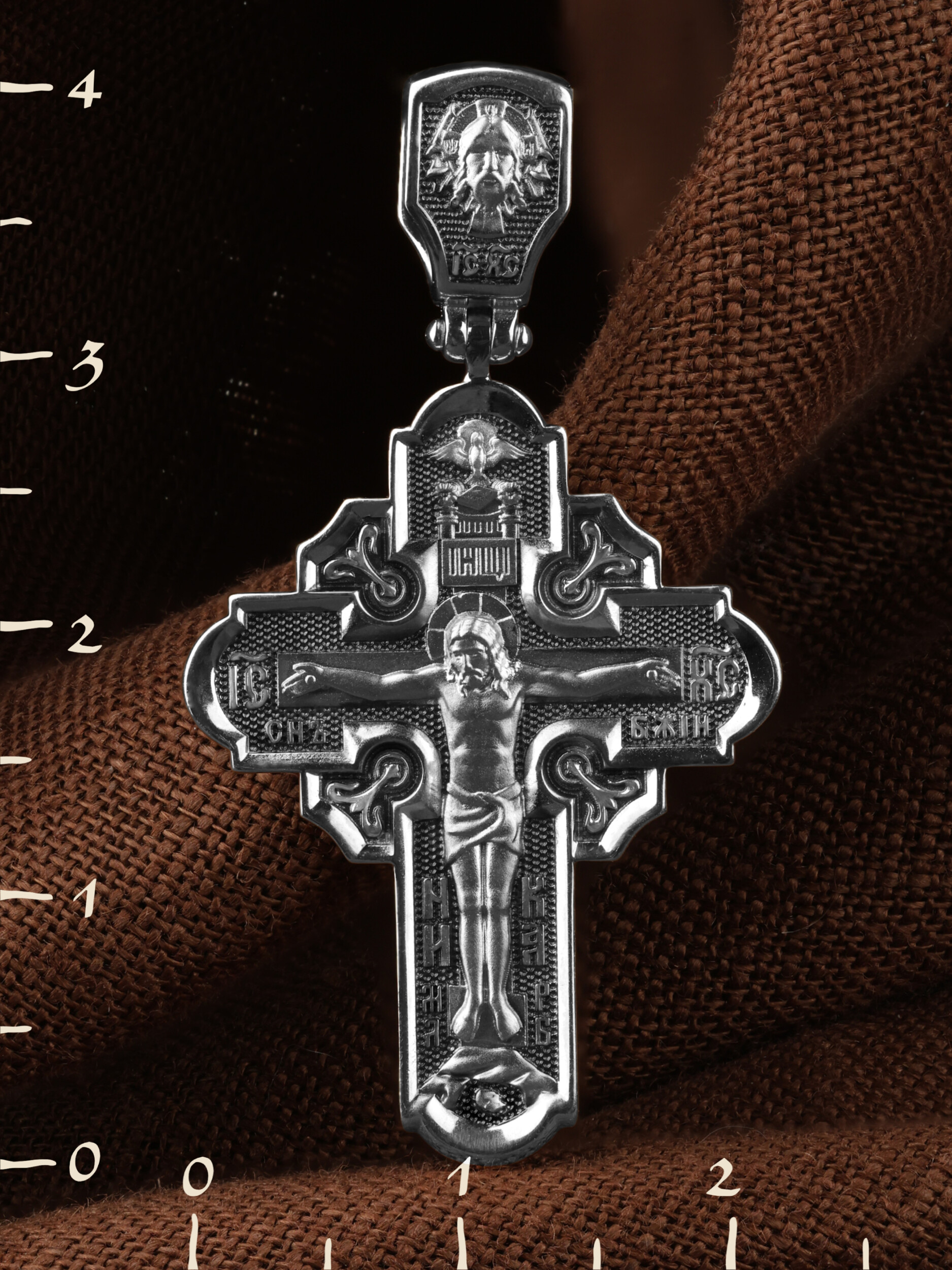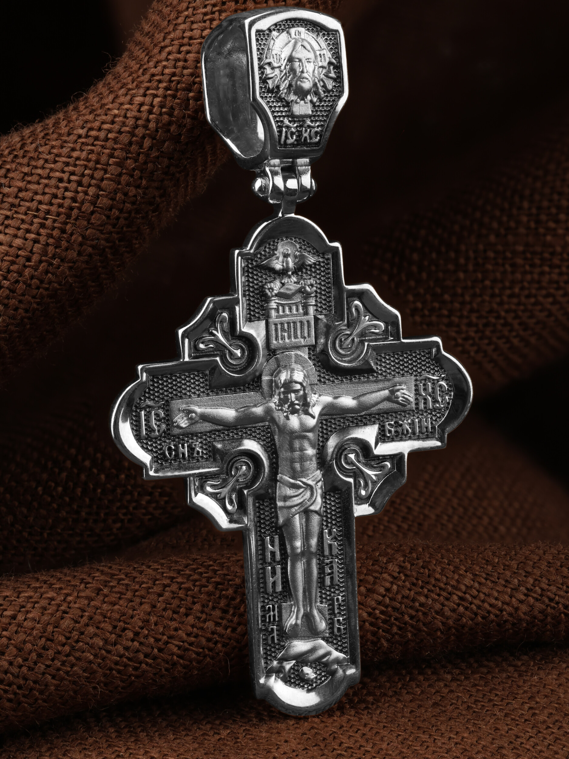 На лицевой стороне креста изображено Распятие Господа и Спасителя нашего Иисуса Христа, отдавшего Себя на смерть, чтобы другие могли жить — жить вечной жизнью, жить с Богом. Своею кровью Господь освятил крест и сделал его проводником Своей благодати, источником освящения верующих. На верхней табличке, выше головы Иисуса, расположена надпись, составленная Понтием Пилатом — «ИНЦИ». Она означает «Иисус Назорей, Царь Иудейский». Надпись «IС ХС» означает Иисус Христос помещается на разных сторонах поперечной (большой) перекладины креста. На кулонном кольце помещено изображение Духа Святого в виде голубя, сходящего с Небес