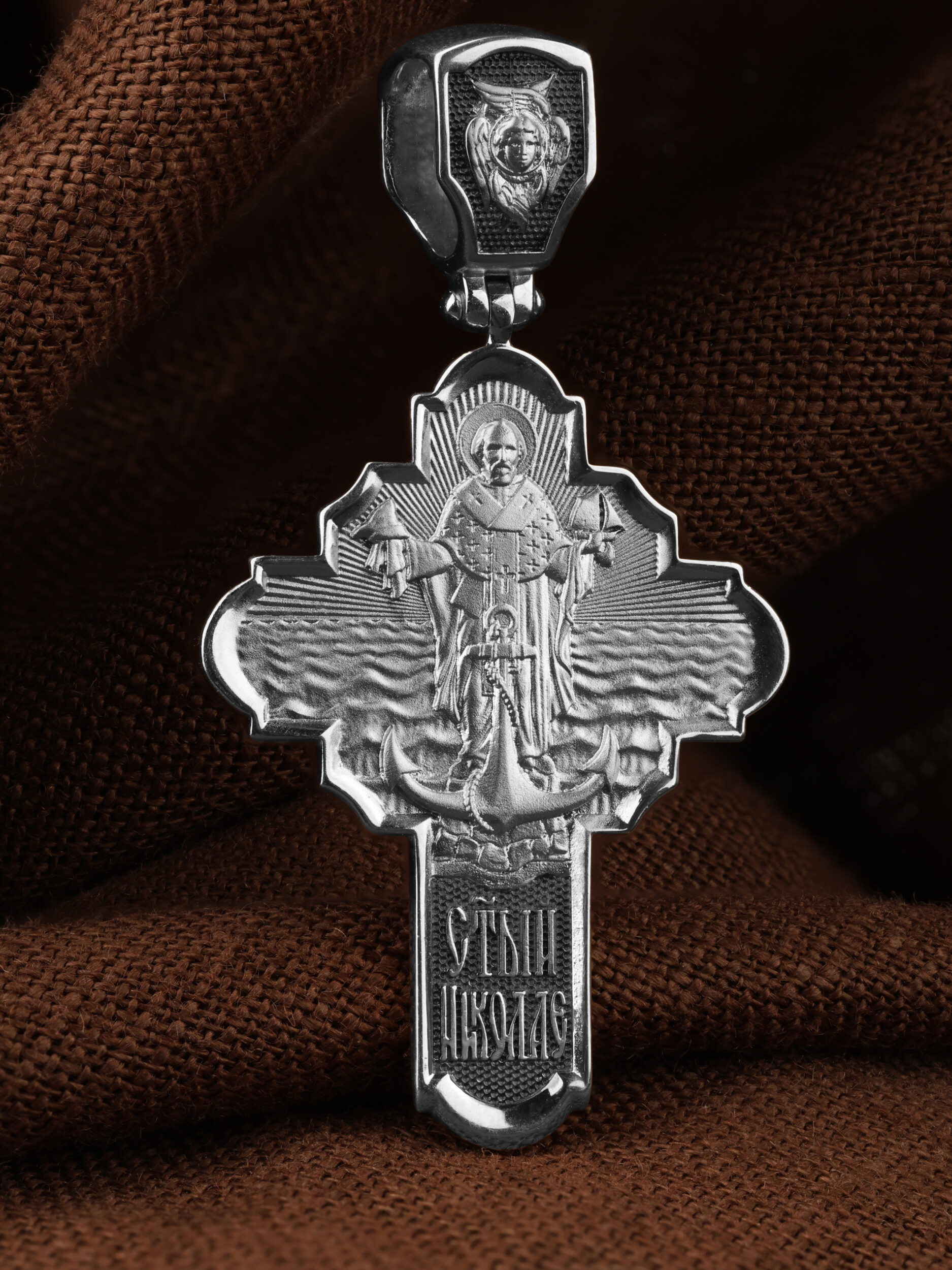 На оборотной стороне креста изображен Святитель Николай архиепископ Мир Ликийских, Чудотворец. Он является одним из самых почитаемых святых в православном мире. Много великих и преславных чудес сотворил на земле и на море великий Святитель Николай Угодник. Он помогал сущим в бедах, укрощал штормы, спасал от потопления и выносил на сушу из глубины морской, освобождал из плена и приносил освобожденных домой, избавлял от уз и темницы, защищал от посечения мечом, освобождал от смерти и подавал многим различные исцеления, слепым прозрение, хромым хождение, глухим слух, немым дар слова. Святитель Николай Чудотворец изображен стоящим в полный рост в лодке. В деснице святой держит мыс Горн, а в левой — корабль. Эта икона была написана путешественником и священником Фёдором Конюховым. Во время одного из своих путешествий, проходя пролив Дрейка, Фёдор, понимая, что выжить в такой бушующей стихии невозможно, стал молиться Святителю Николаю Чудотворцу. Он мысленно пообещал себе: «если пройду мыс Горн, то построю часовню Николаю Чудотворцу»… И в следующий миг, совсем неожиданно — волны утихли. Яхта Конюхова благополучно прошла опасный участок пути. Вернувшись домой, Фёдор Конюхов построил часовню в благодарность за свое спасение.