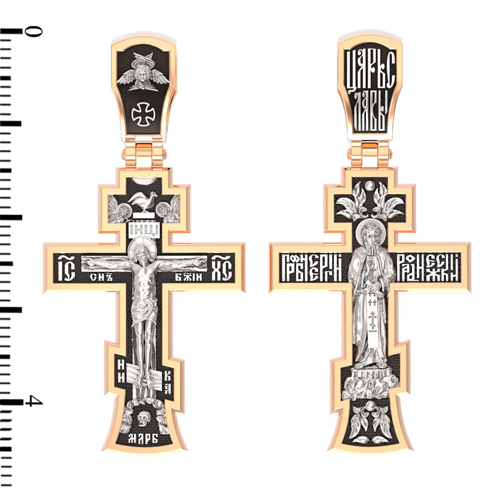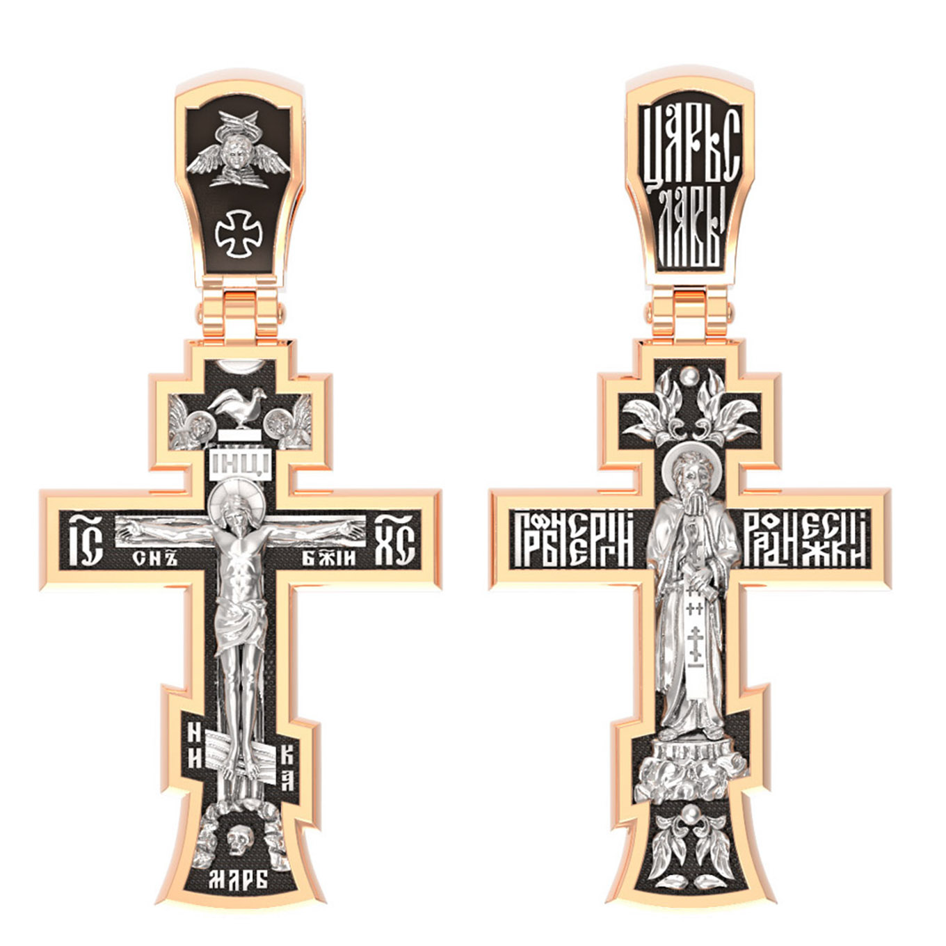 На лицевой стороне этого креста центральную часть занимает икона Распятия Христа — образ жертвы, принесенной Господом за грехи людей. Именно ко Христу, сошедшему на землю ради нашего спасения, возносятся все молитвы. Рядом с Его образом помещены слова — «НИКА» и «Сын Божий». Эти слова характеризуют Господа как Великого Архиерея, победителя смерти. Также Распятие сопровождается надписями, олицетворяющими Христа — это святое имя Христа «IC» (Иисус) «ХС» (Христос). На кулонном кольце написано «Царь Славы».